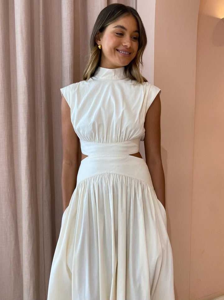 Summer Casual High-Neck Waisted Cutout Pleated Short Sleeve Dress for Women