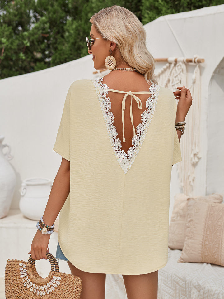 Summer Casual Round-Neck Loose Lace at the Back Short Sleeve Top for Women