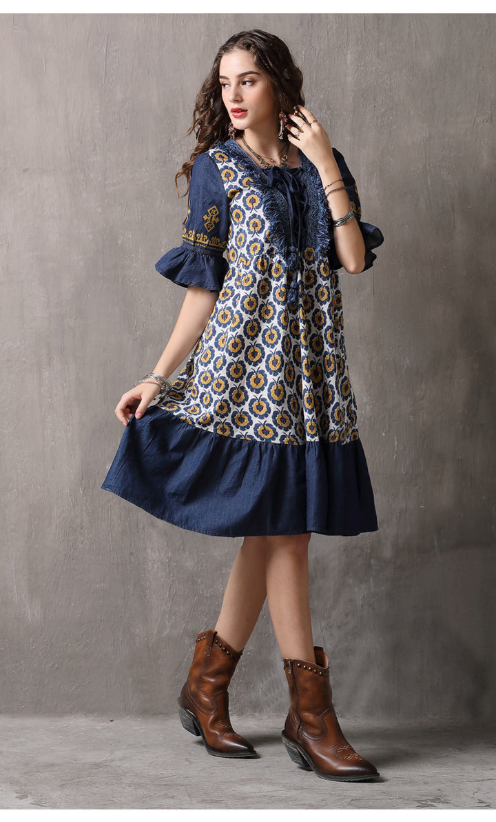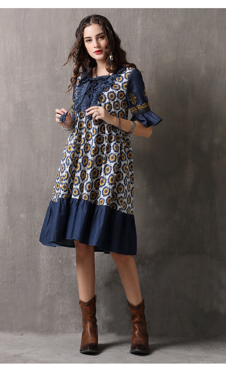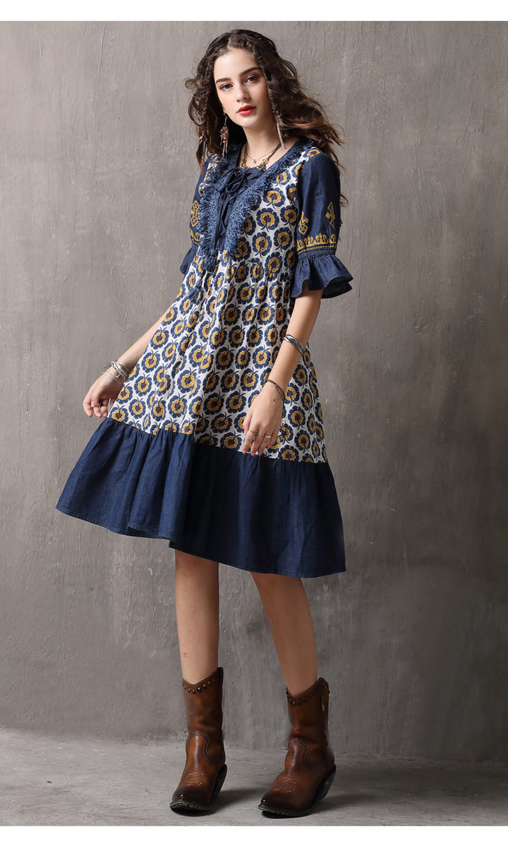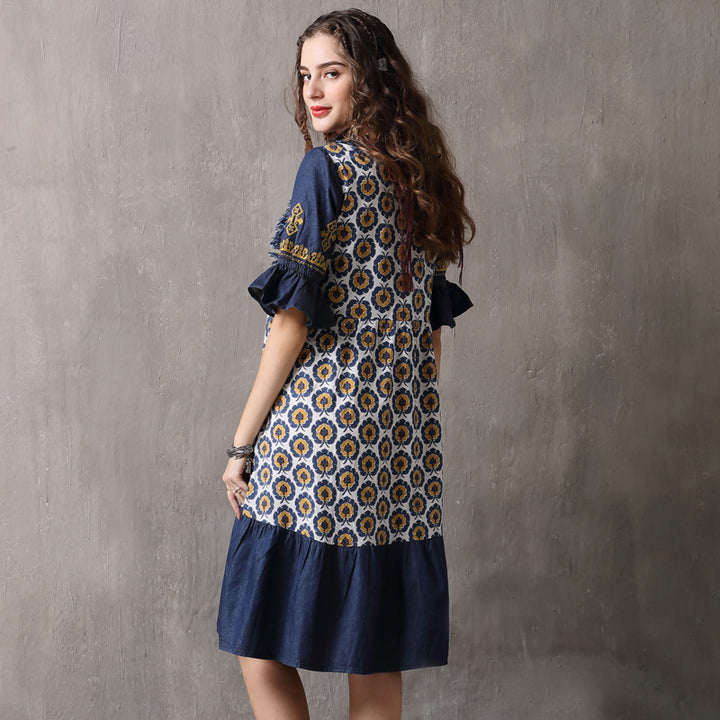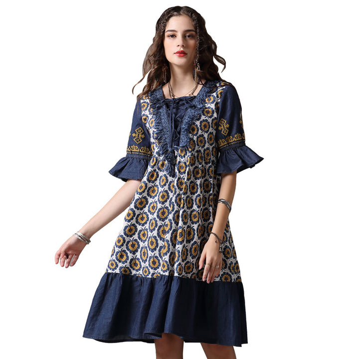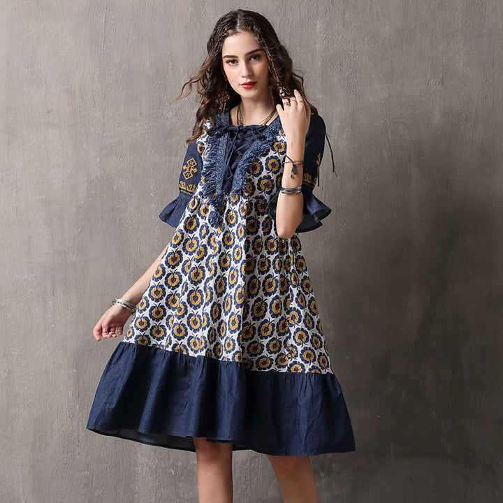 Summer Clothes New Splicing Large Size Mid-Skirt Vintage Printed Dress