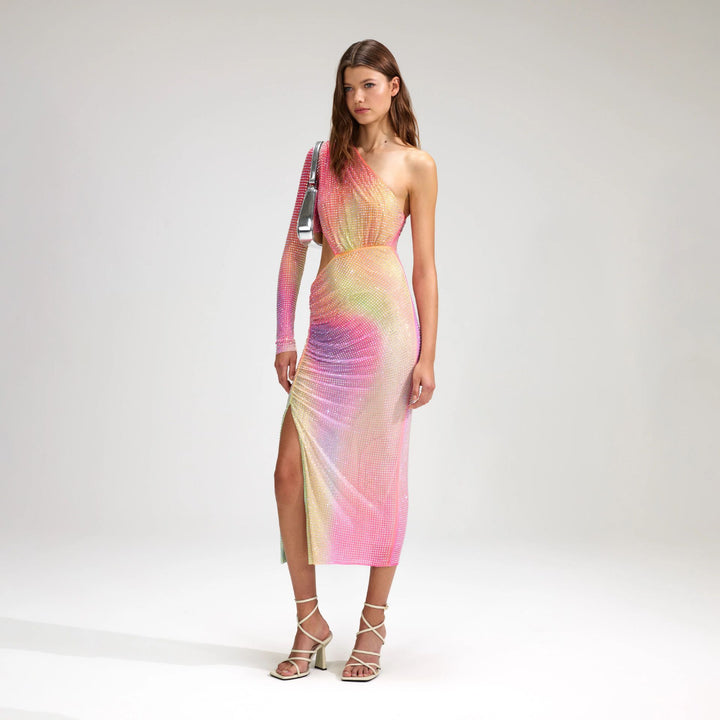 Summer Elegant Colorful Gradient Rhinestone One-Shoulder Cutout Party Dress for Women