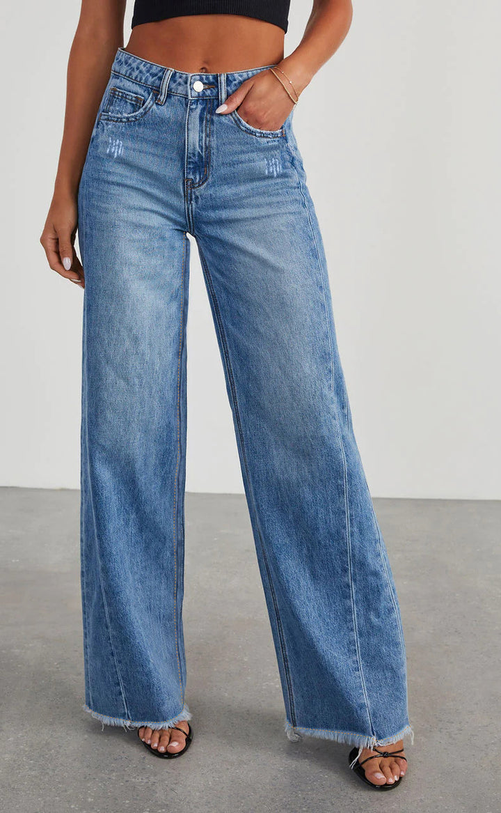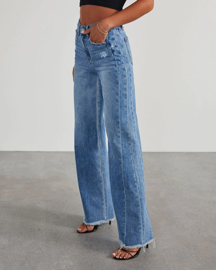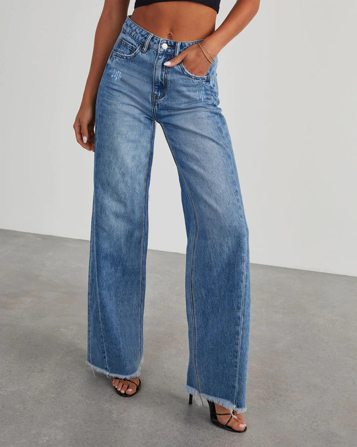 Summer Fashion Versatile Wide-Leg Washed Denim Pant with Frayed Edges for Women