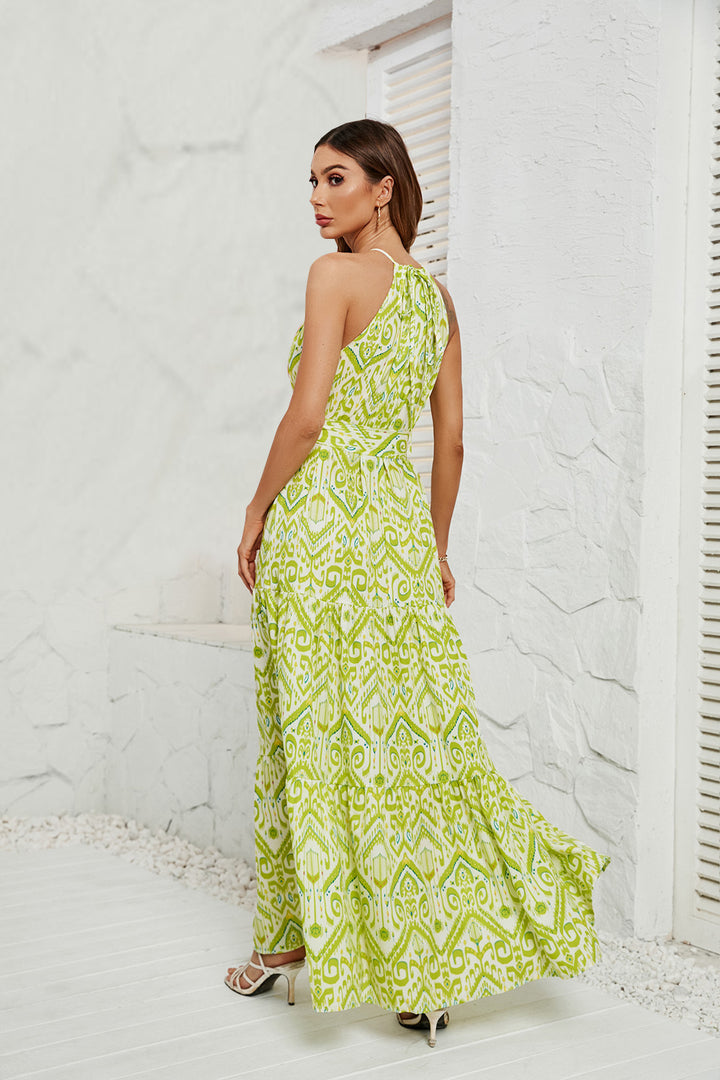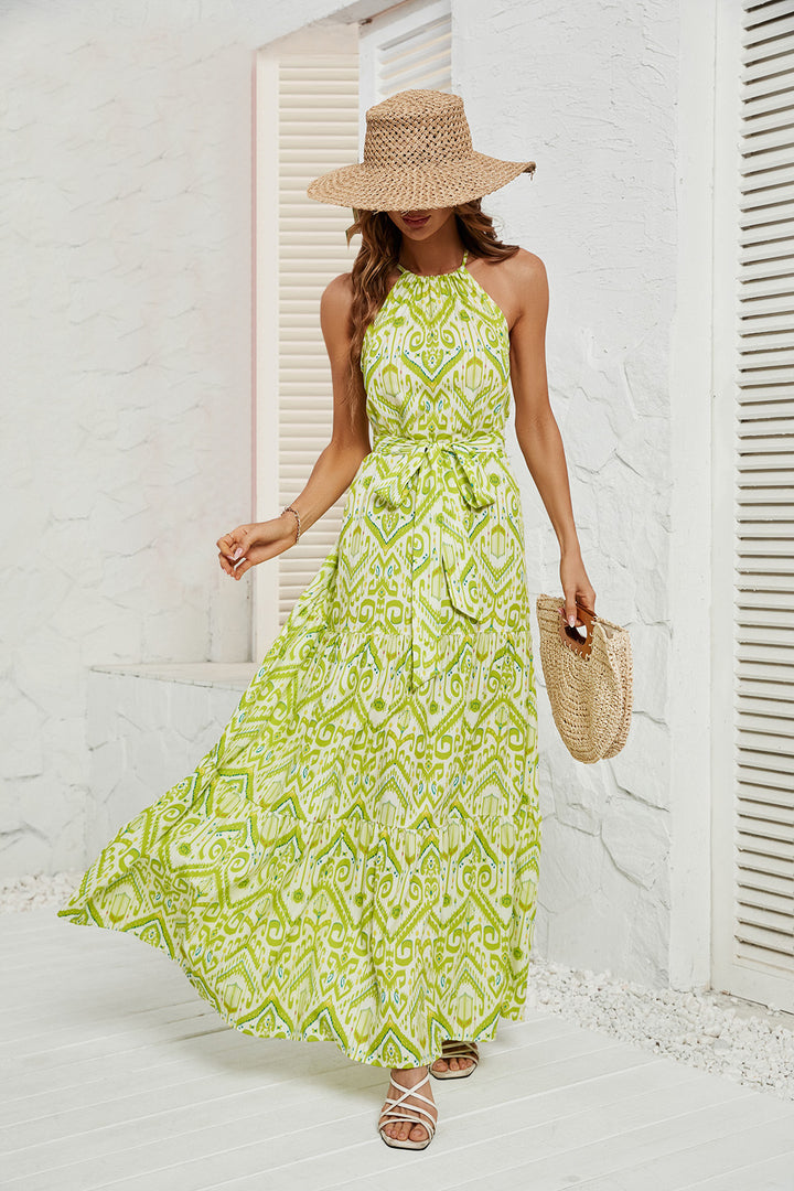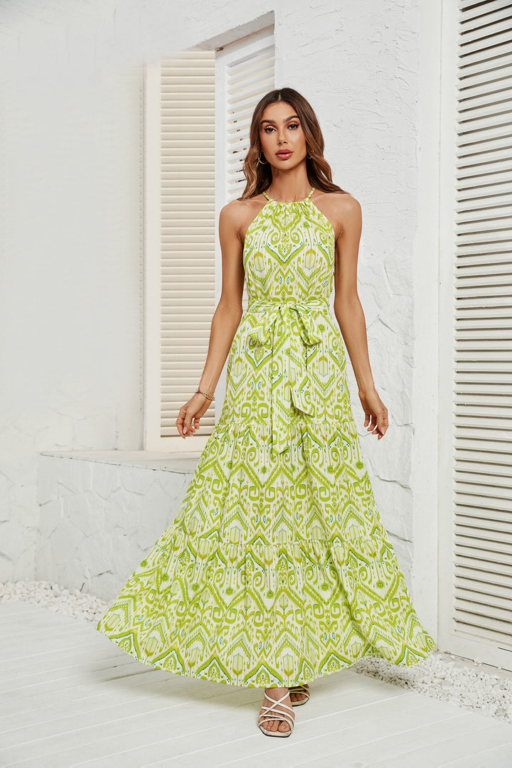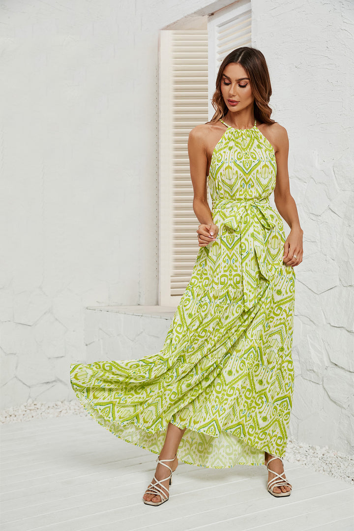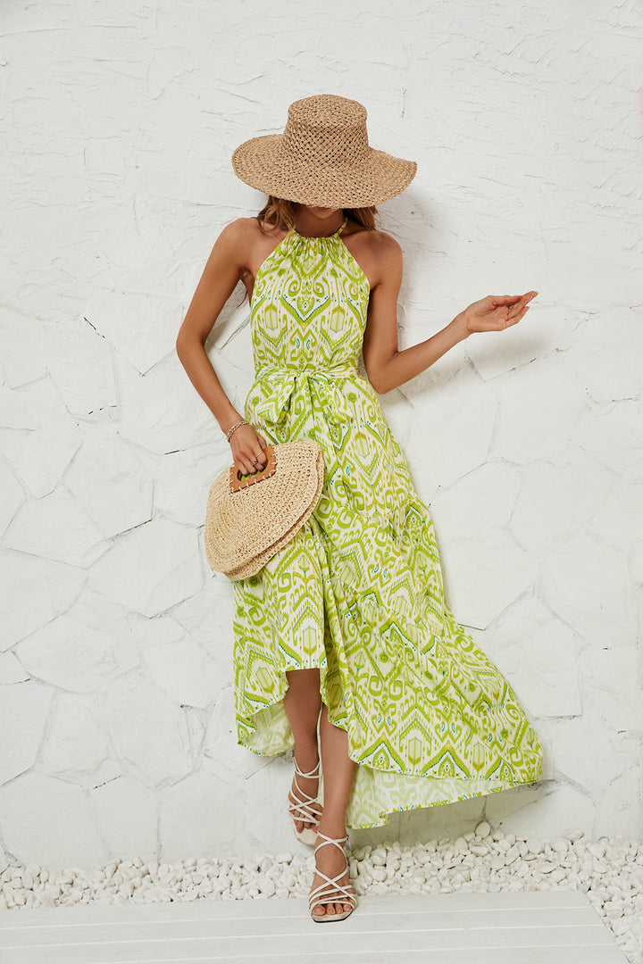 Summer Printed Fresh and Light Style Waist-Tie Halter-Neck Drawstring Dress for Women