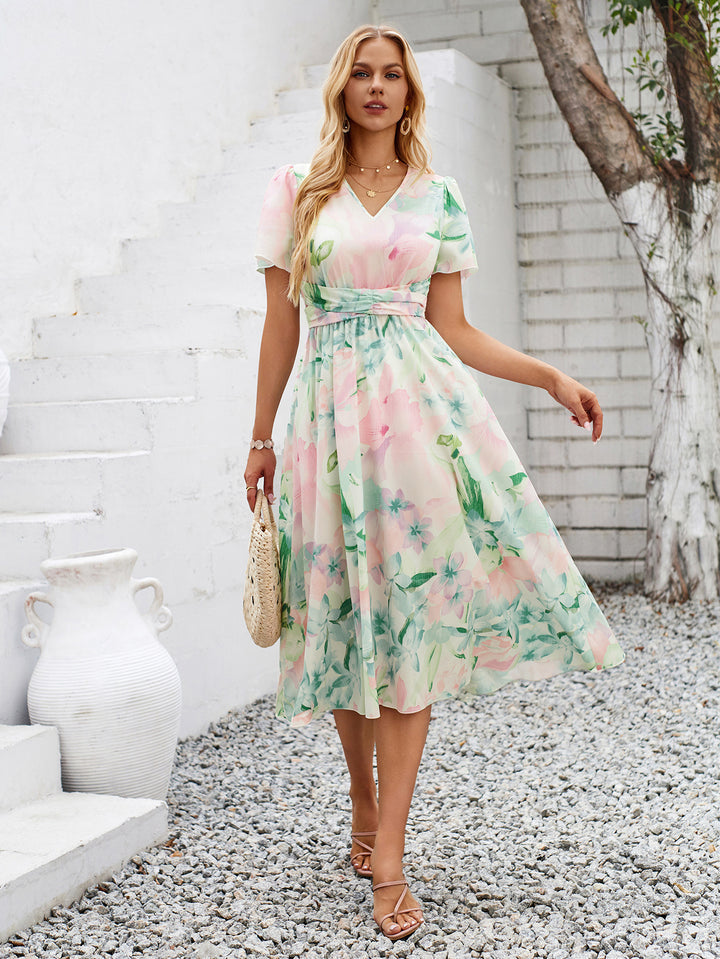 Summer Printed V-Neck Waisted Short Sleeve Holiday-Style Dress for Women
