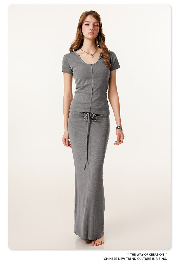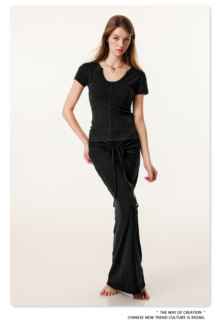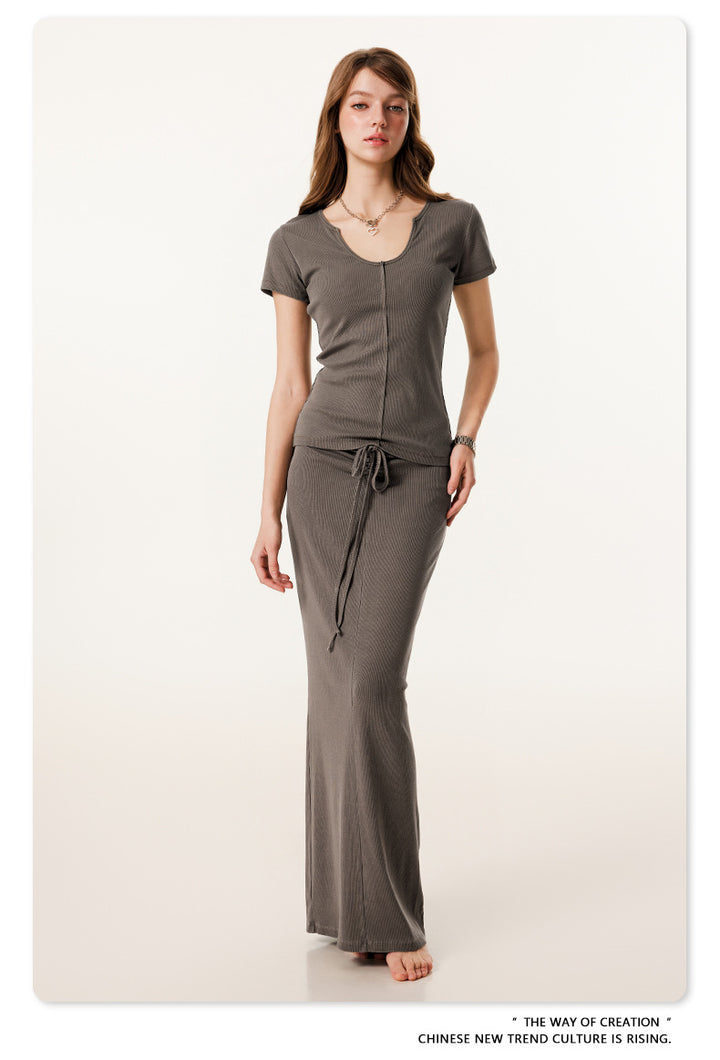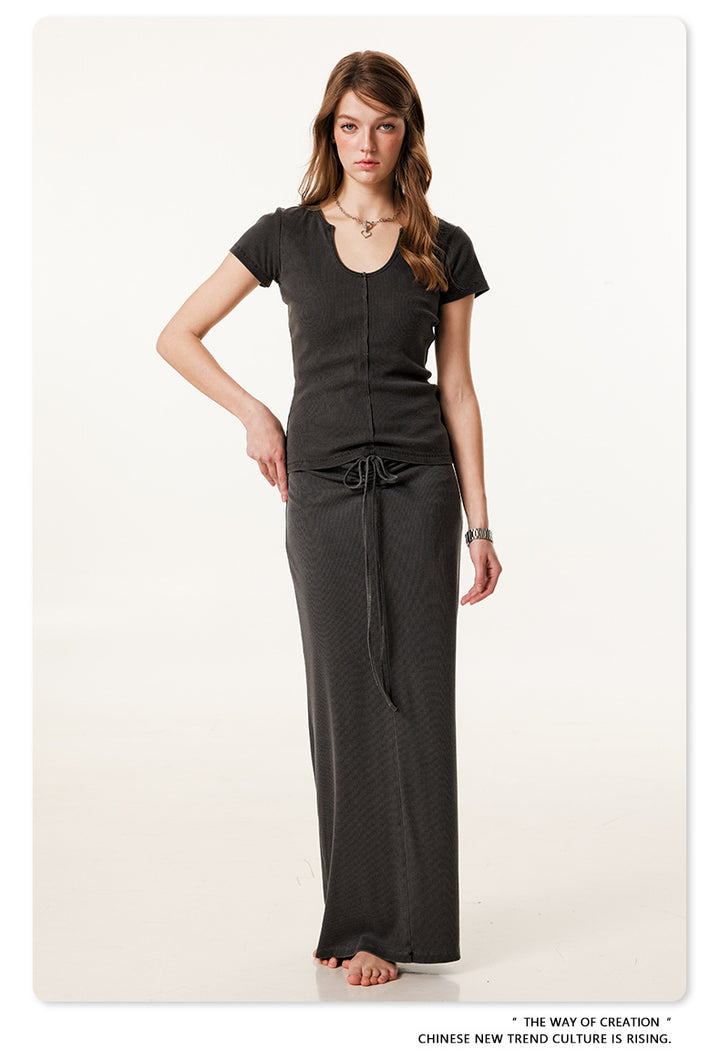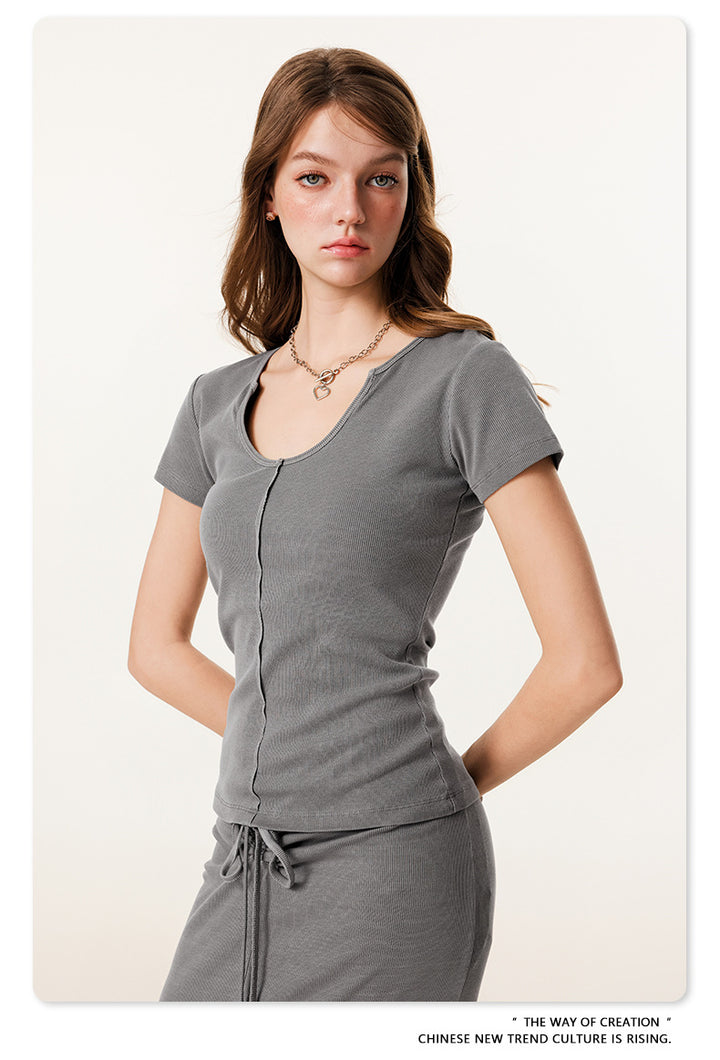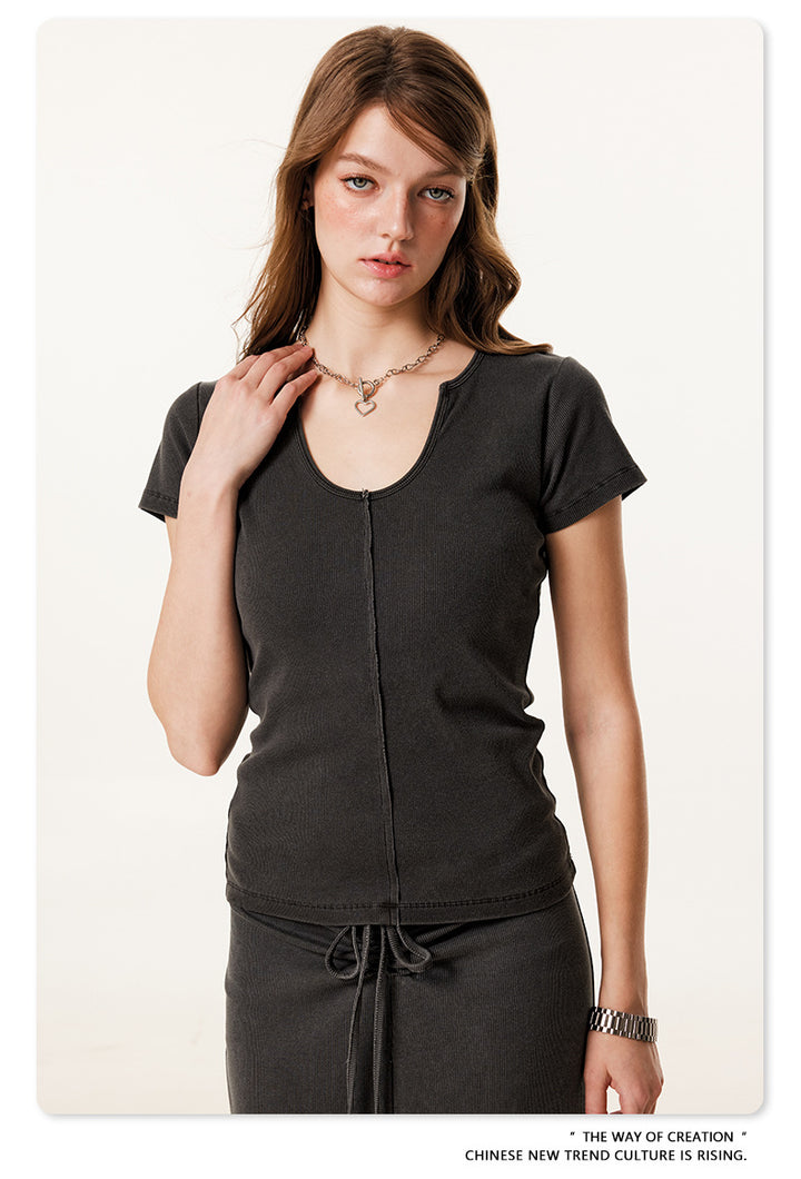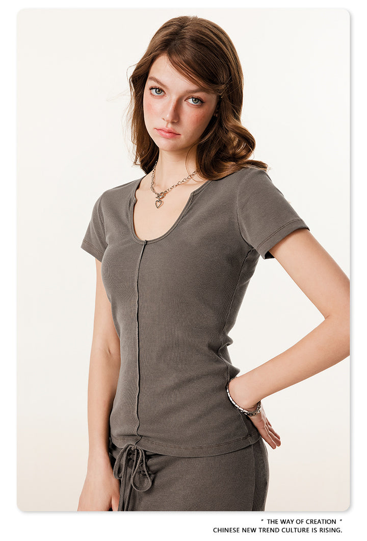 Summer Solid-color Waist-cinched U-neck Skin-friendly Top