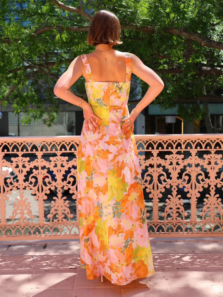 Summer Square-Neck Printed Waisted Holiday-Style Long Slip Dress for Women
