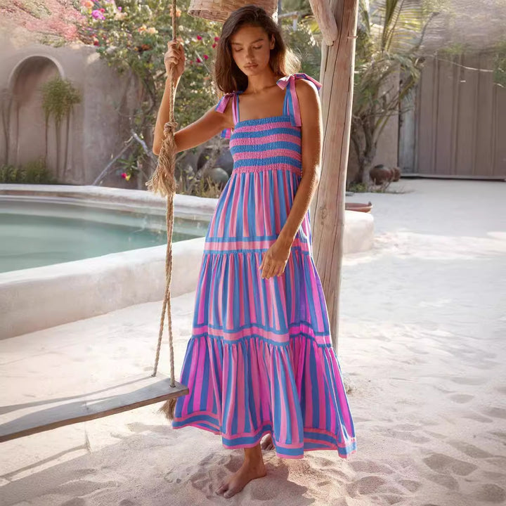 Summer Square-Neck Waisted Striped Pleated Flowy Slip Dress for Women