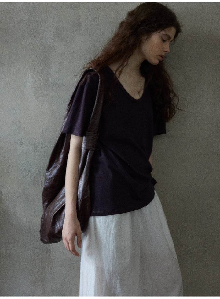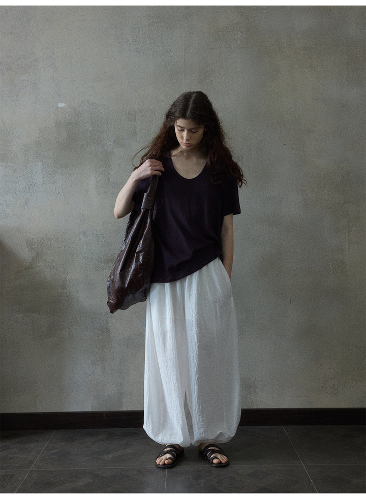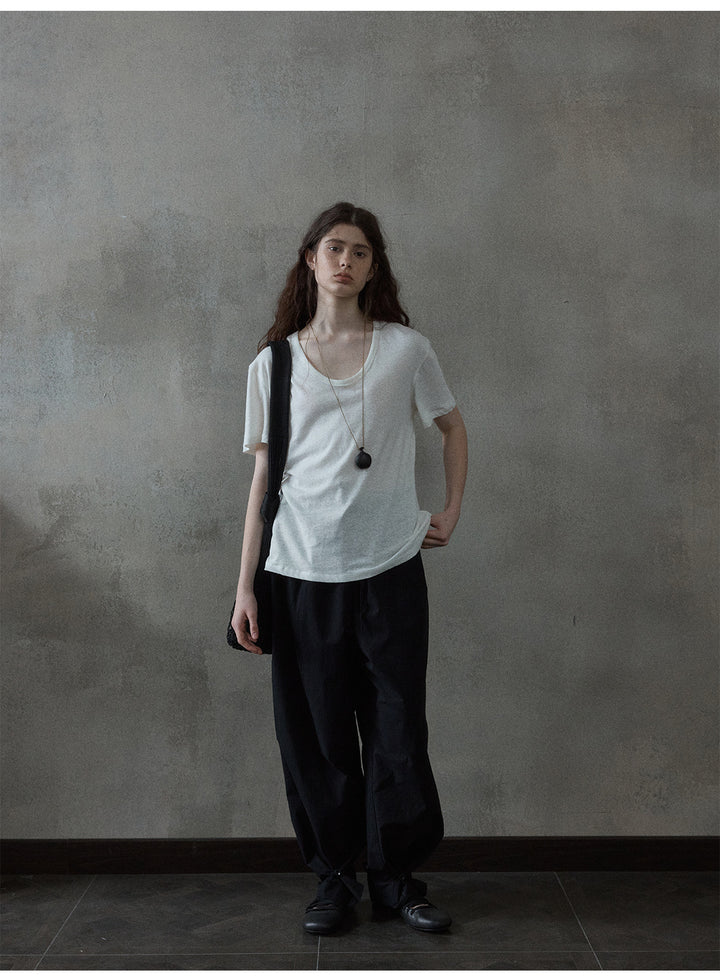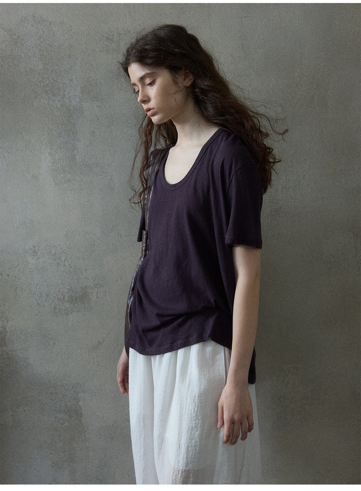 Summer Textured Linen Cotton U-shaped Neck Solid Color Women's T-shirt