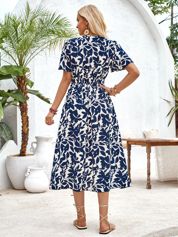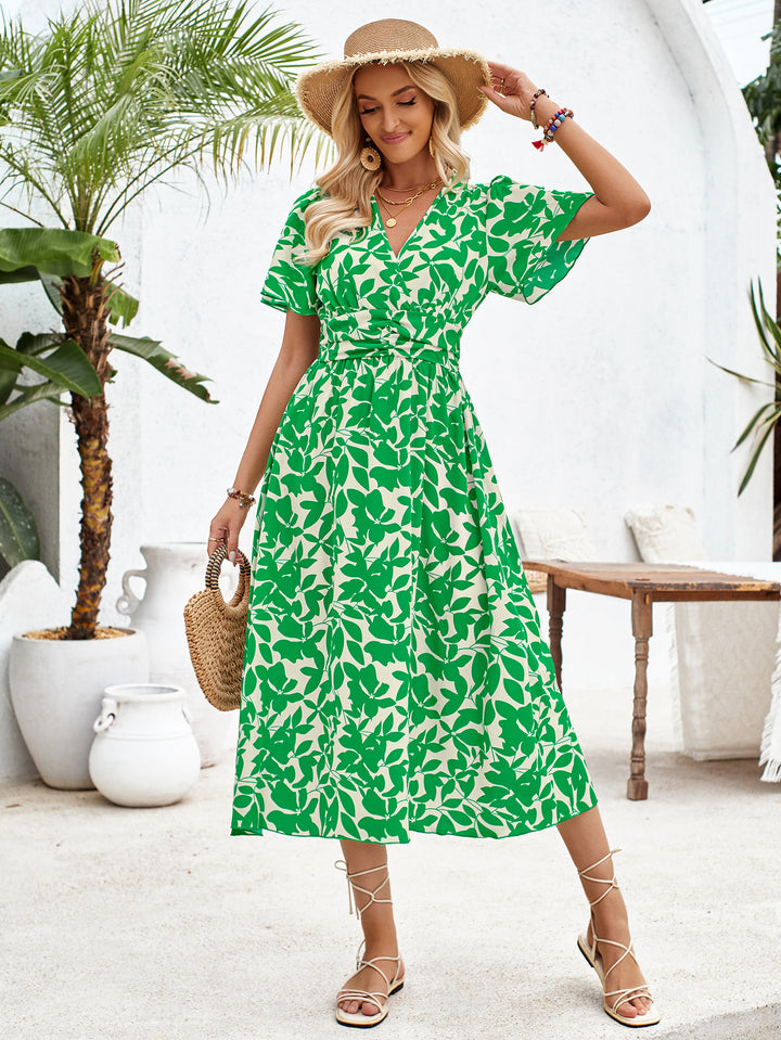 Summer V-Neck Waisted Printed Short Sleeve Dress for Women
