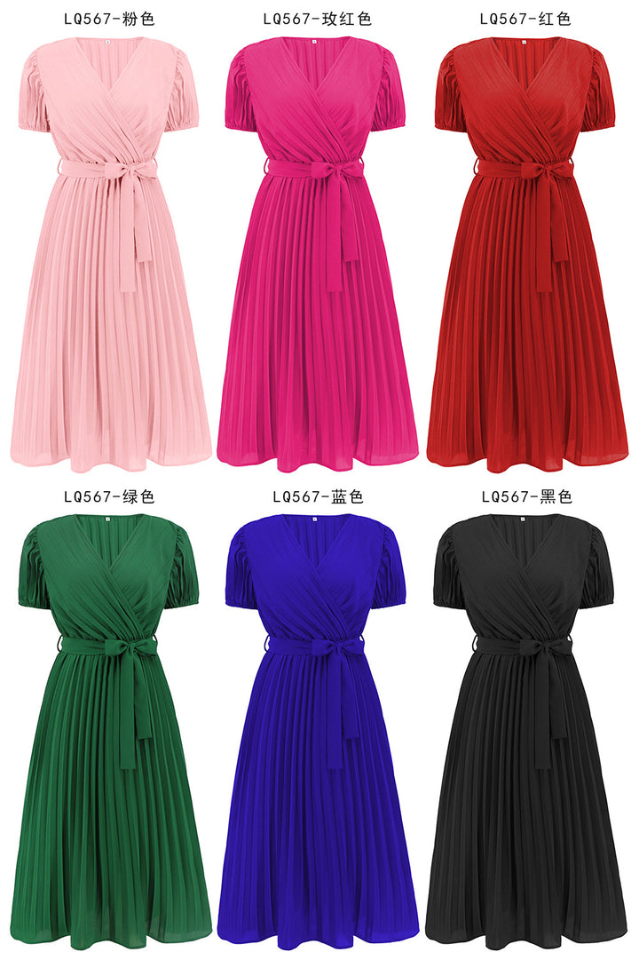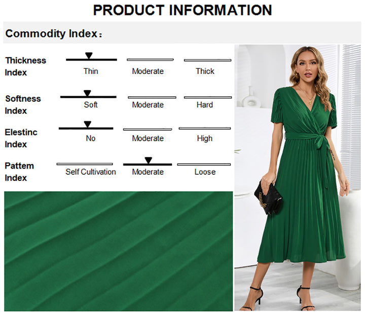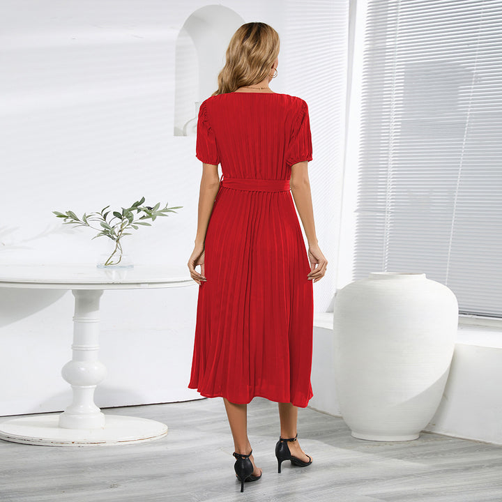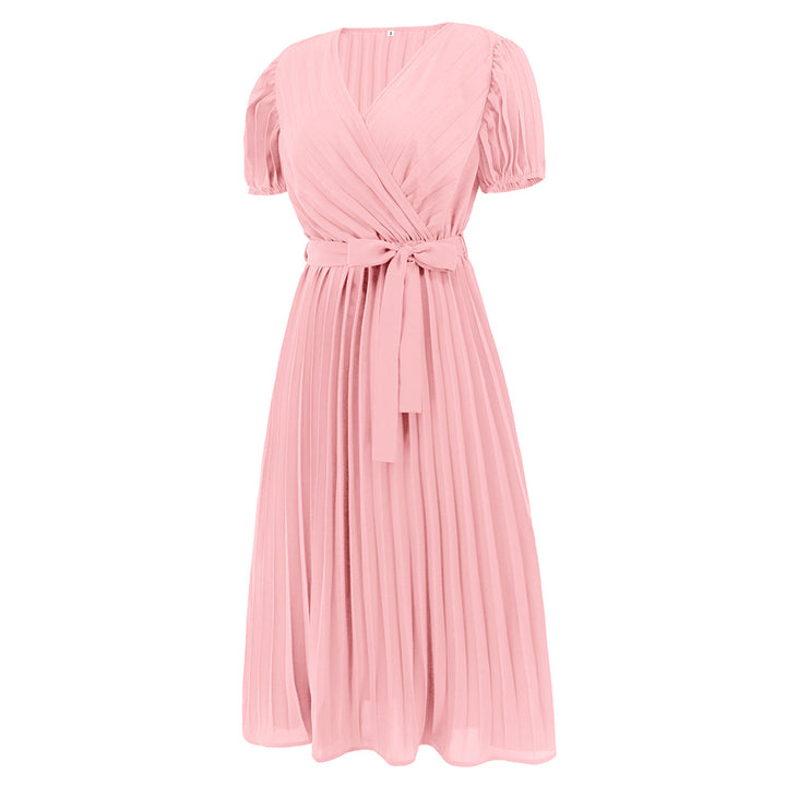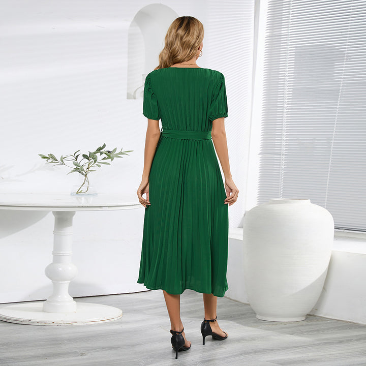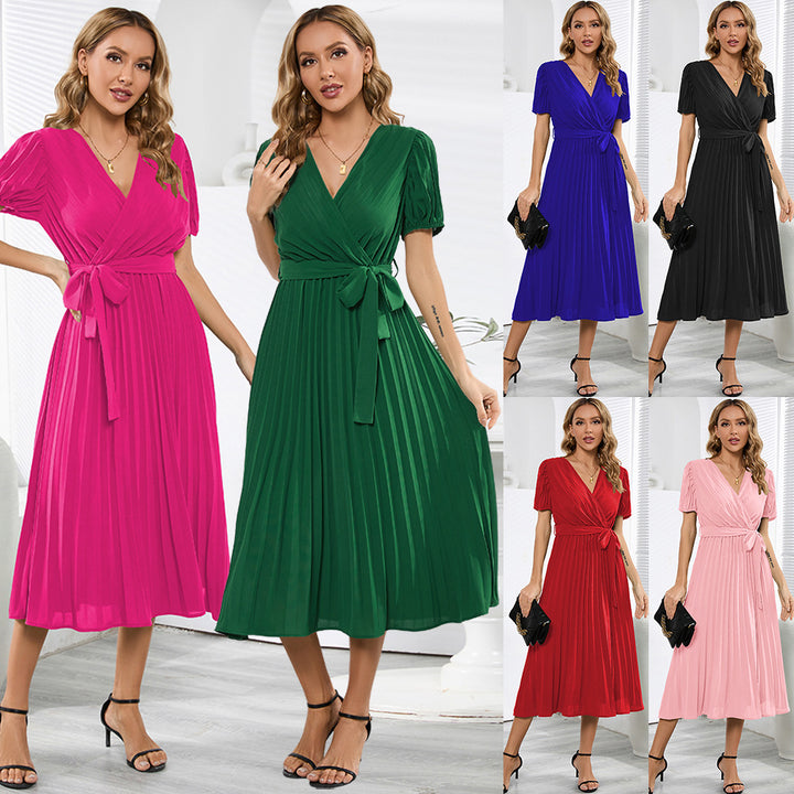 Summer's New V-Neck Pleated Skirt Slim Temperament Long Dress