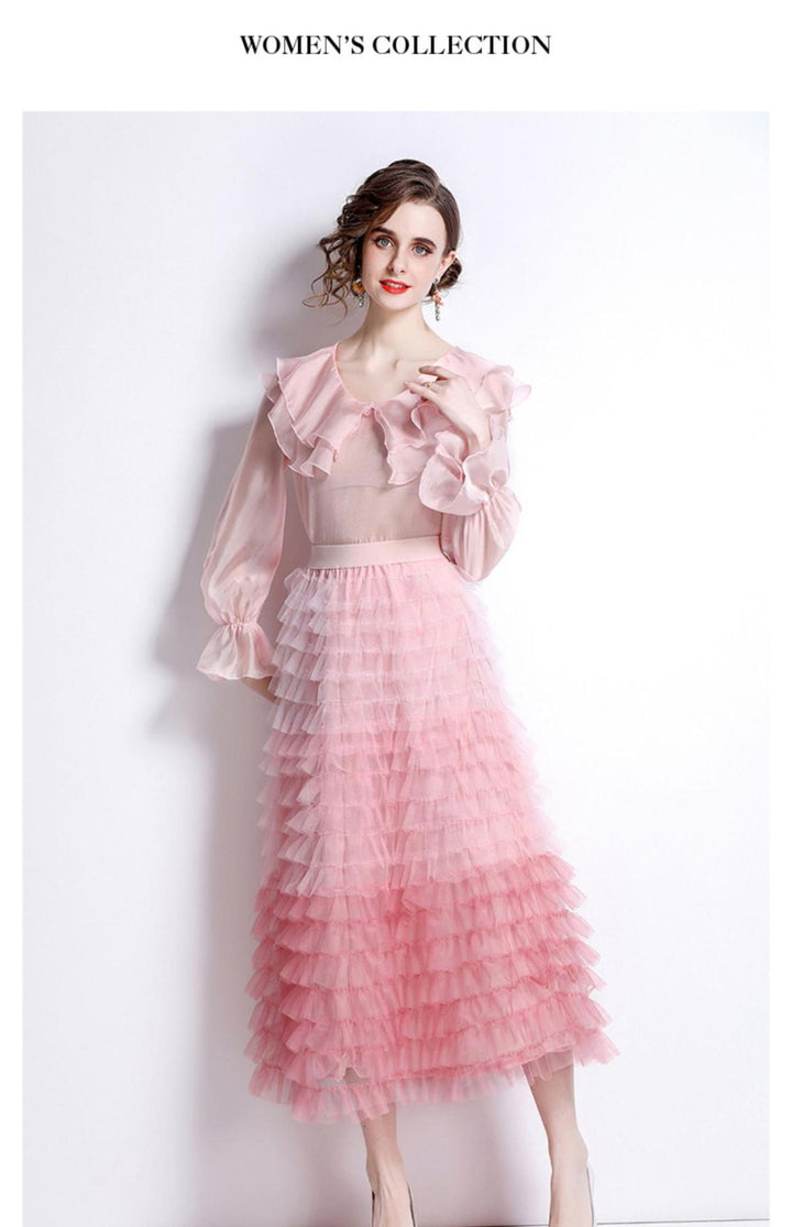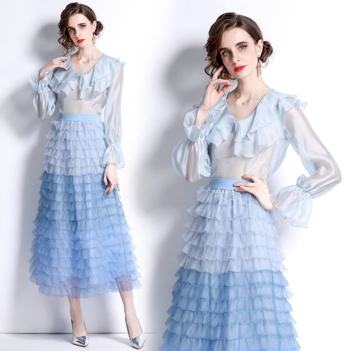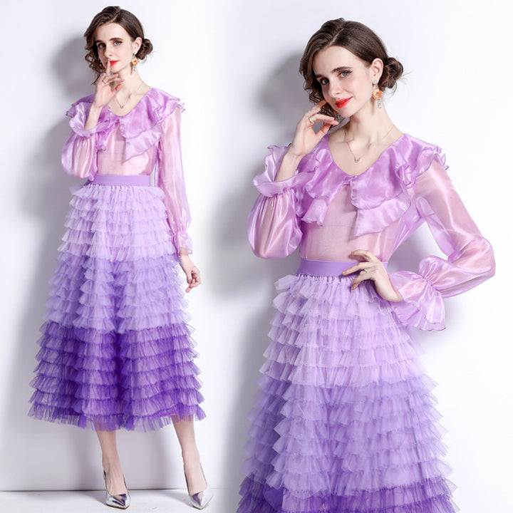 Sweet Peplum Top and Gradient Color Mesh Cake Skirt Suit