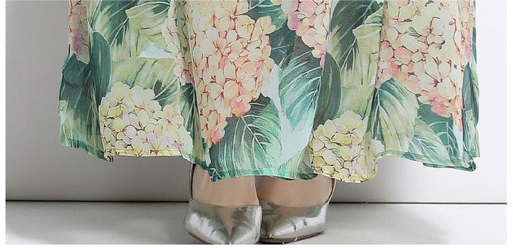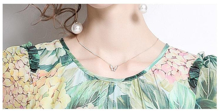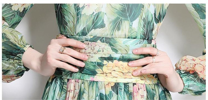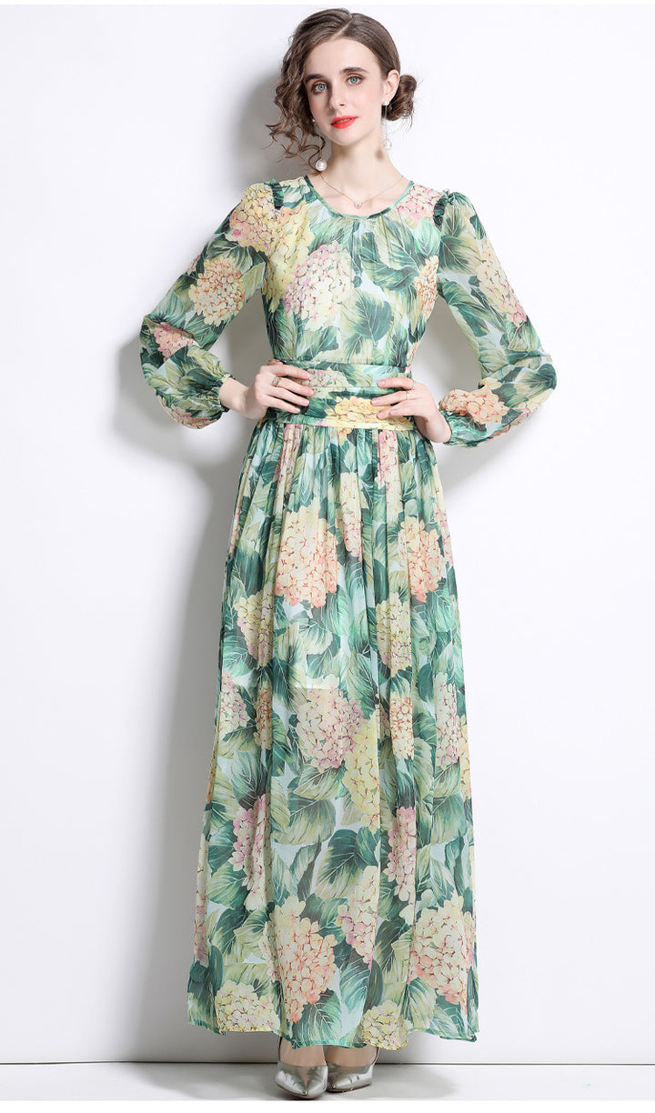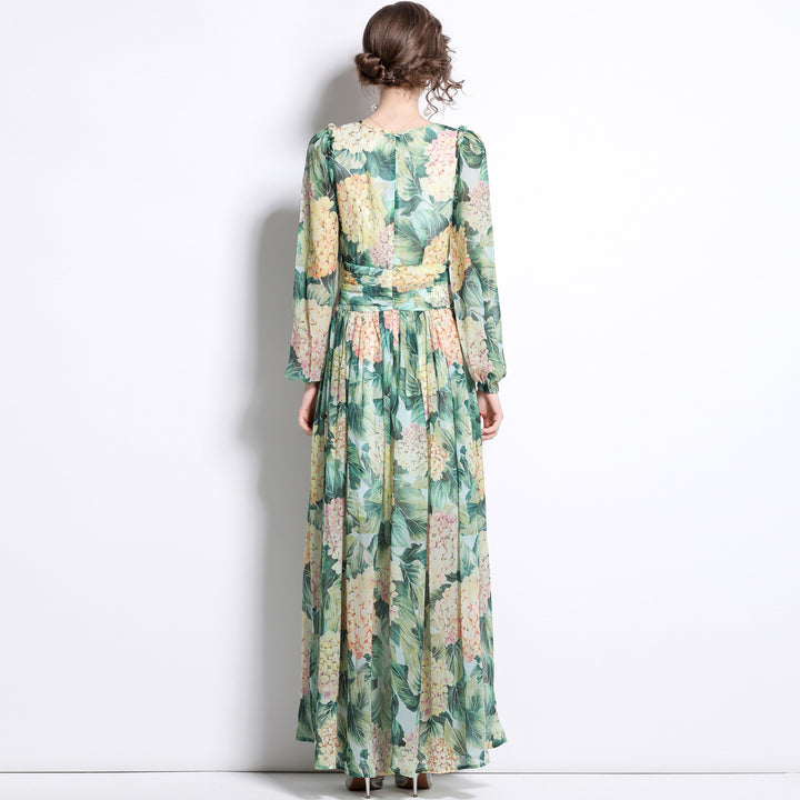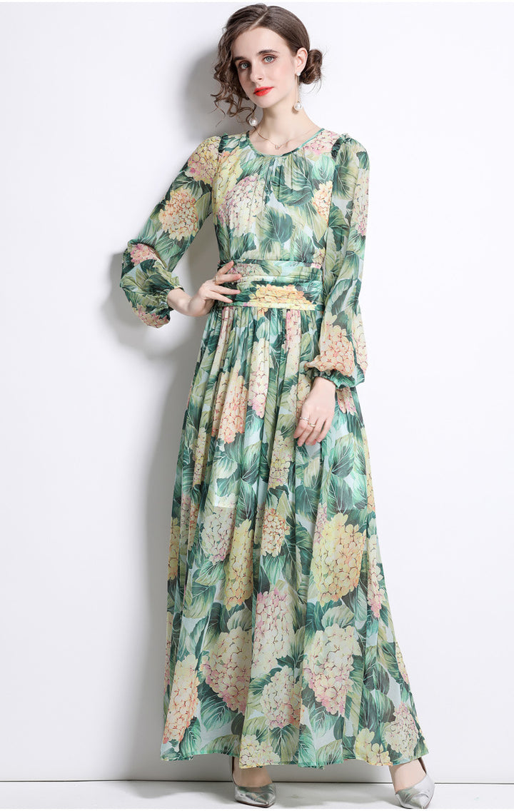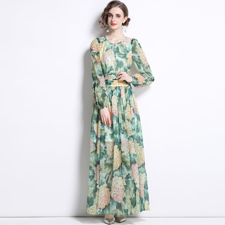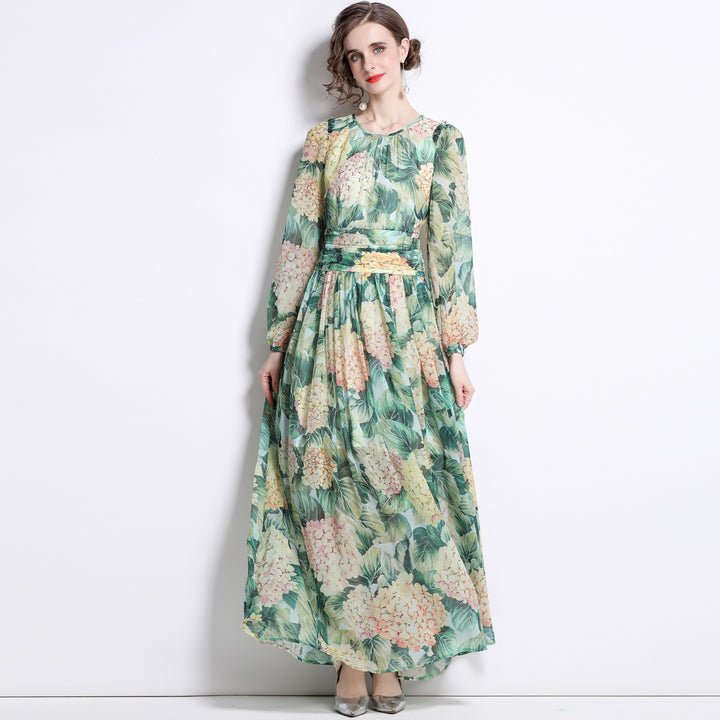 Temperament Chiffon Print Long-Sleeved Slim Long Skirt Green Crew Neck Dress