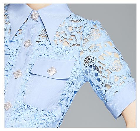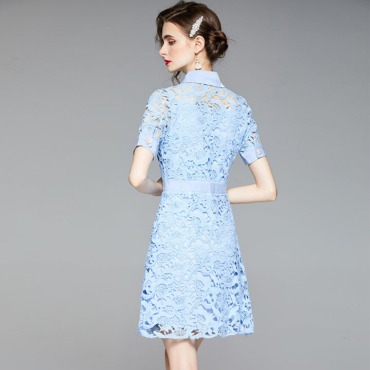 Temperament Elegant Blue Hollowed Out Water-Soluble Lace Lapel Short Sleeve A-Line Skirt Dress