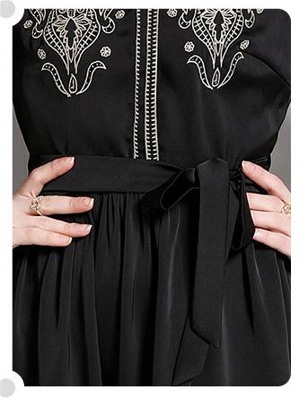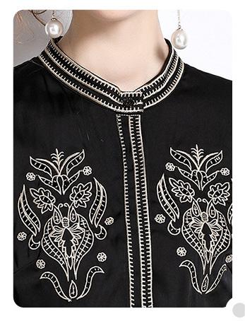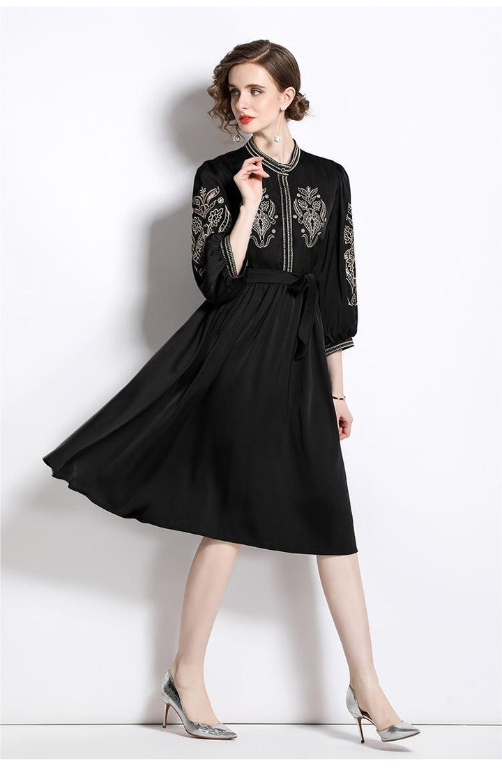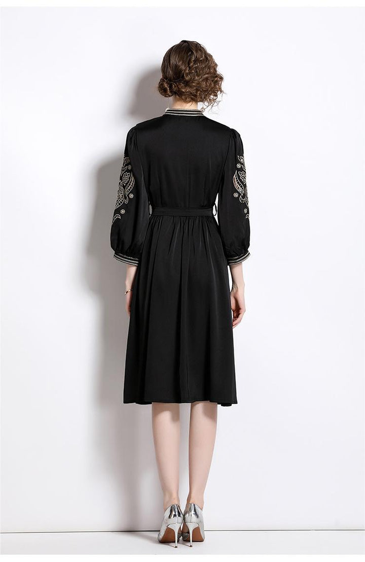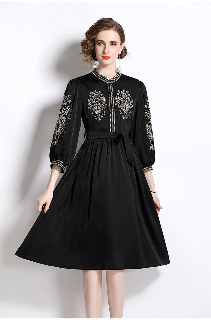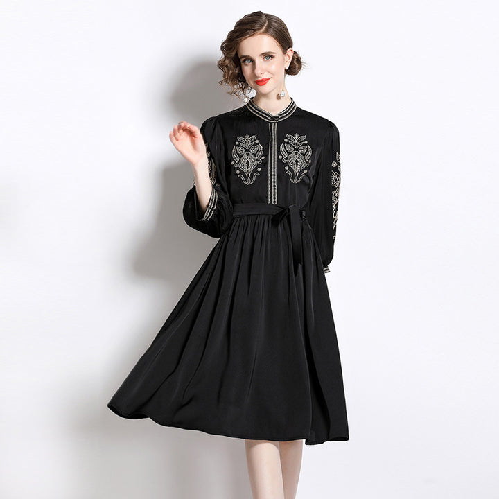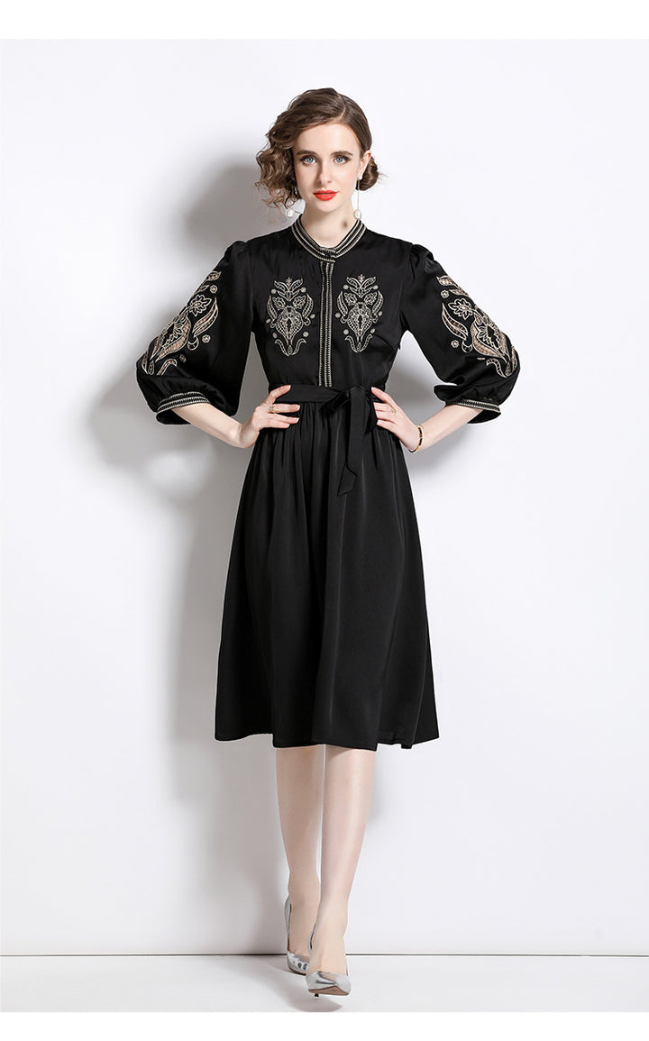 Temperament Elegant MIDI Skirt Embroidered Stand-Up Collar Lantern Sleeve Slim Dress
