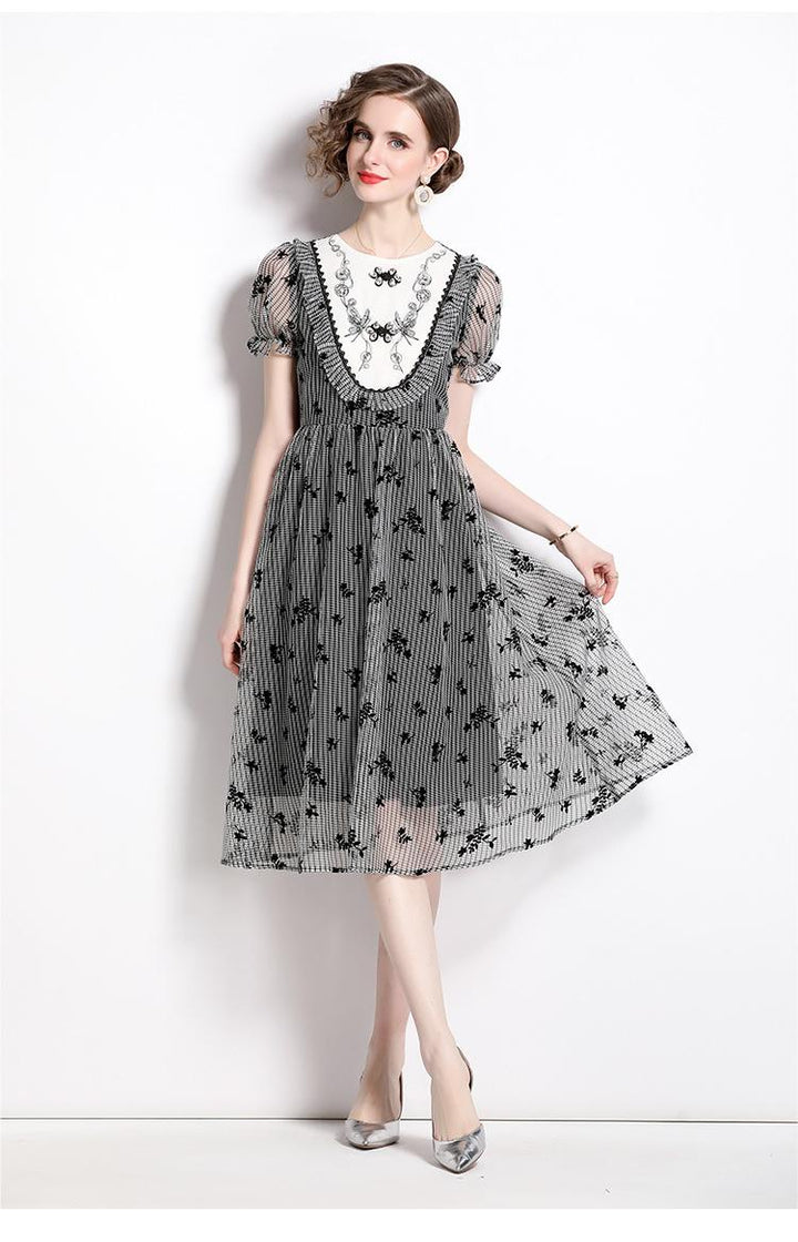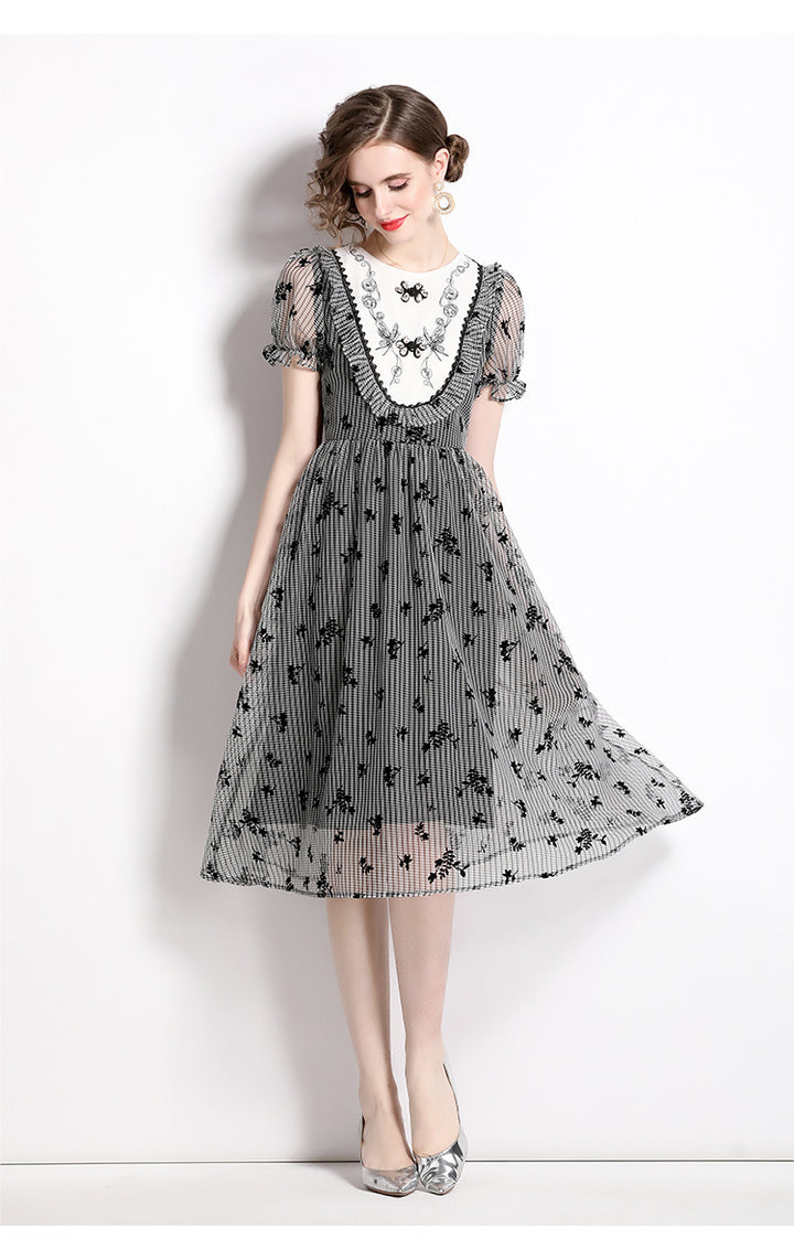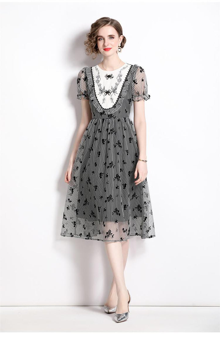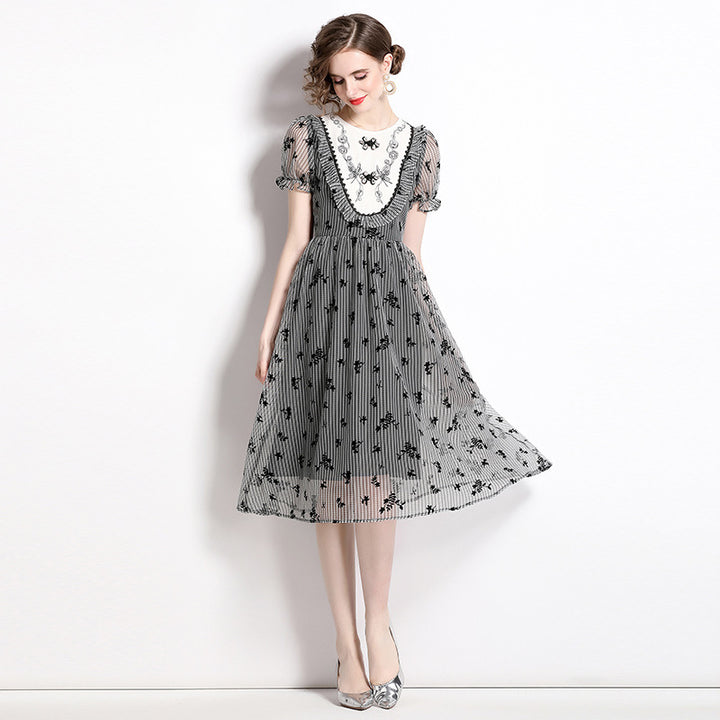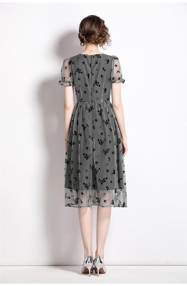 Temperament Elegant Round Neck Bubble Short Sleeve Slim Mid-Length Dress