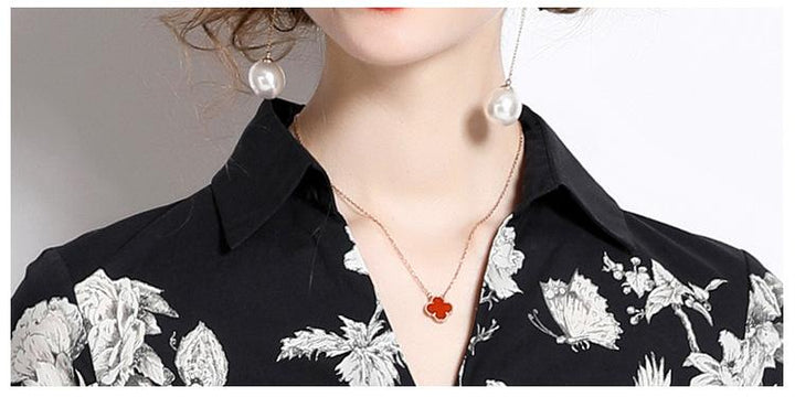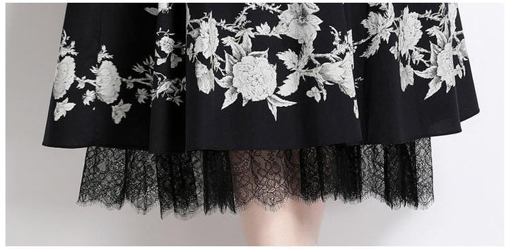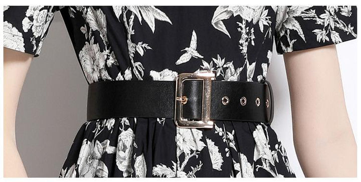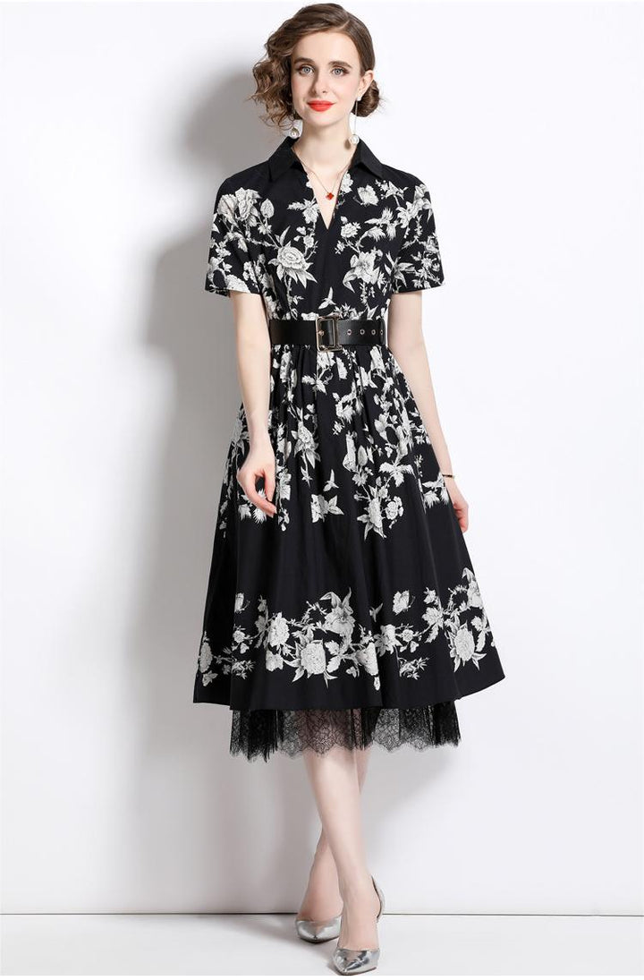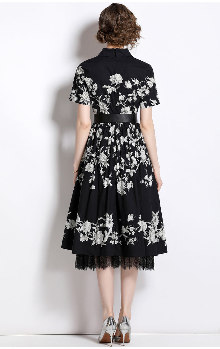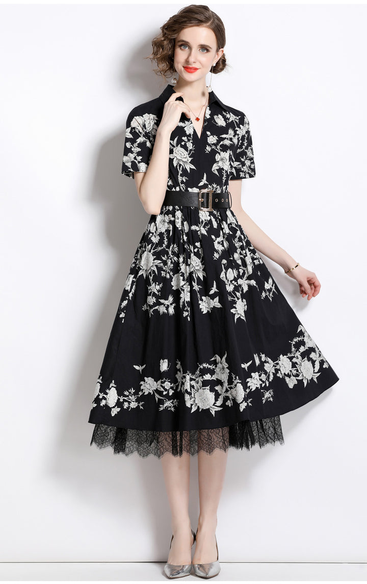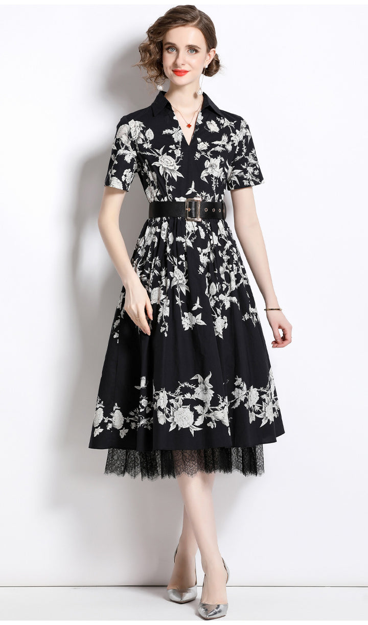 Temperament Lace Print High-Waisted Short-Sleeved Mid-Length Dress with Belt
