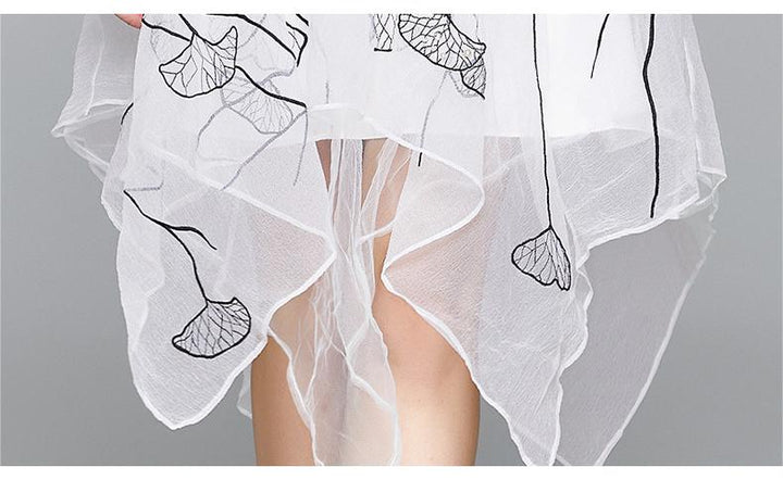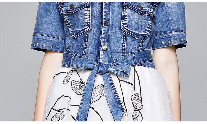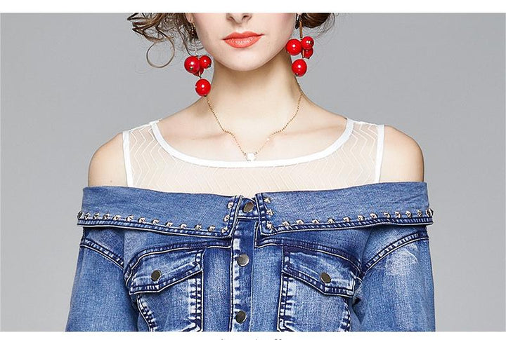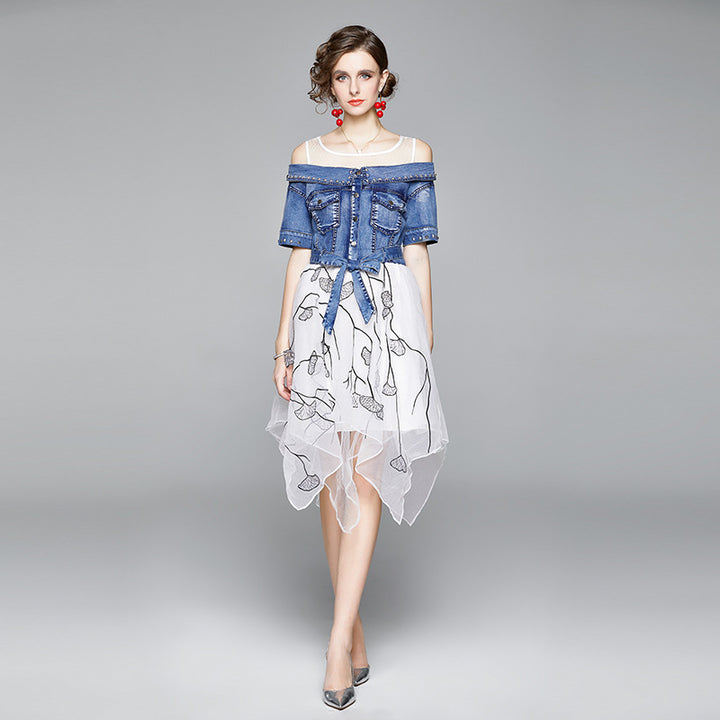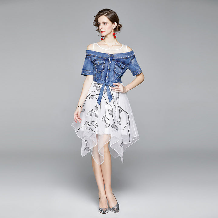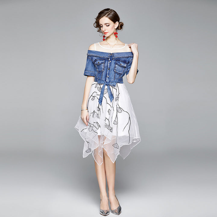 Temperament Off-Shoulder Short Sleeve Denim Patchwork Gauze Skirt Slim Irregular Mid-Skirt Dress