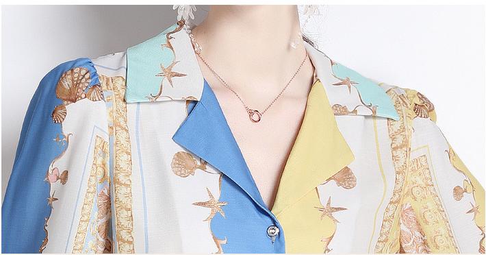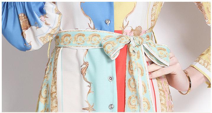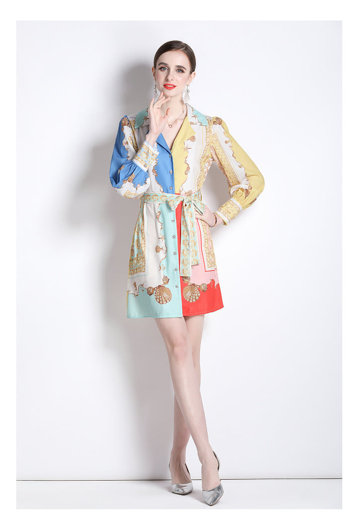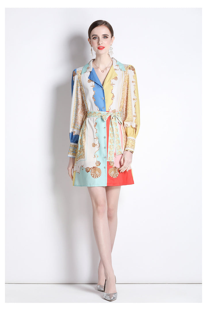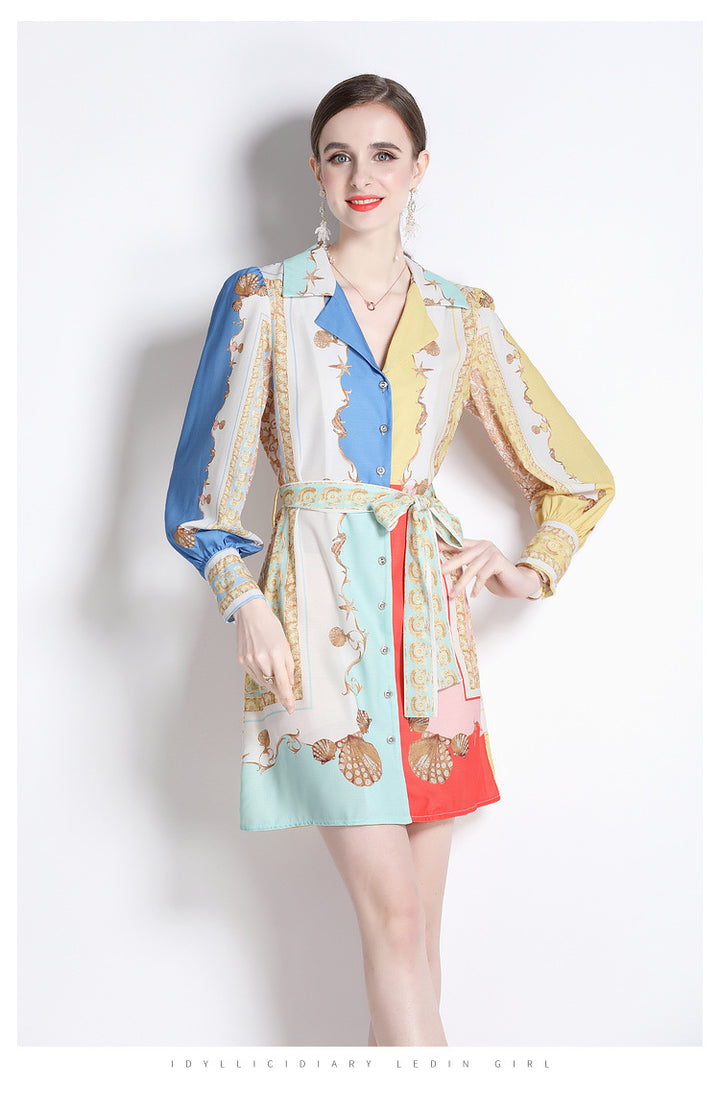 Temperament Skirt Stitching Clashing Color Print Long-Sleeved Slimming Retro Dress