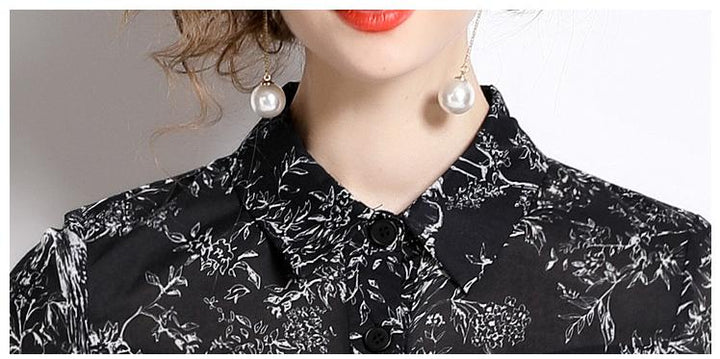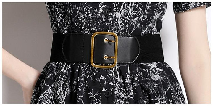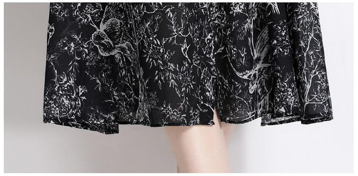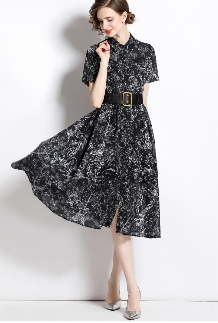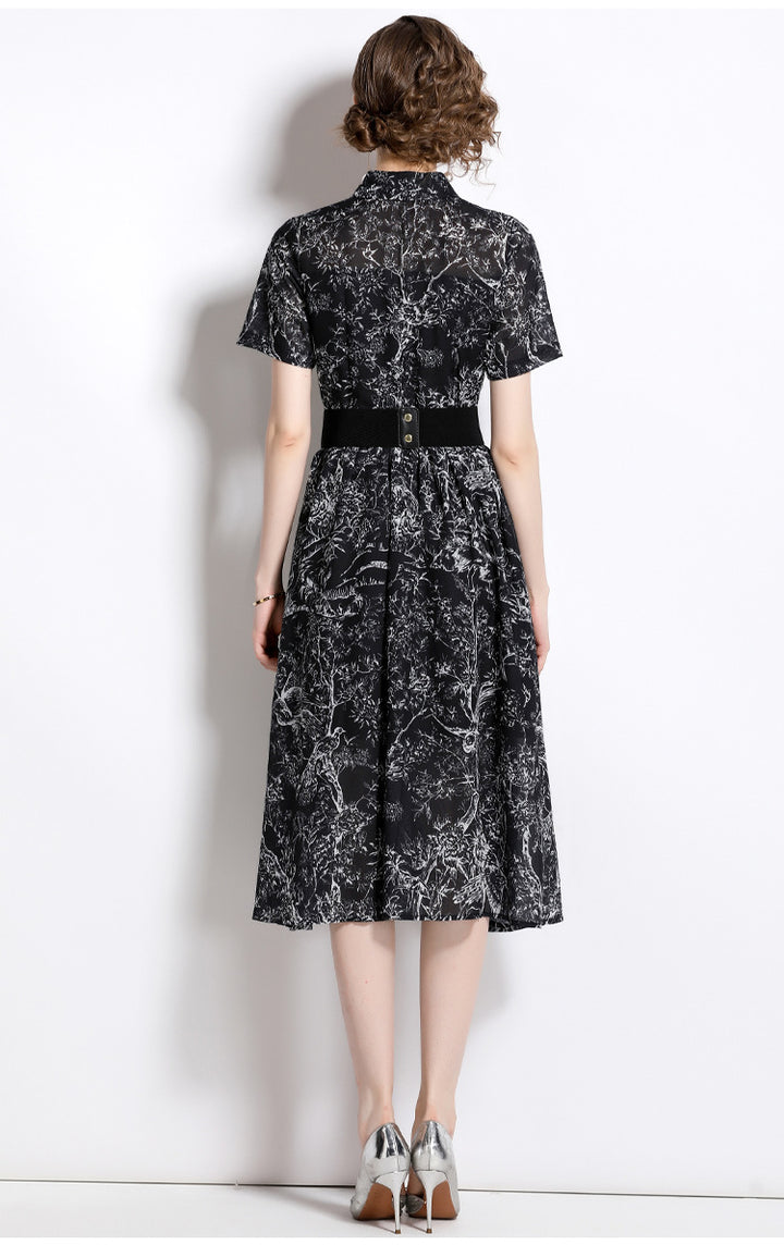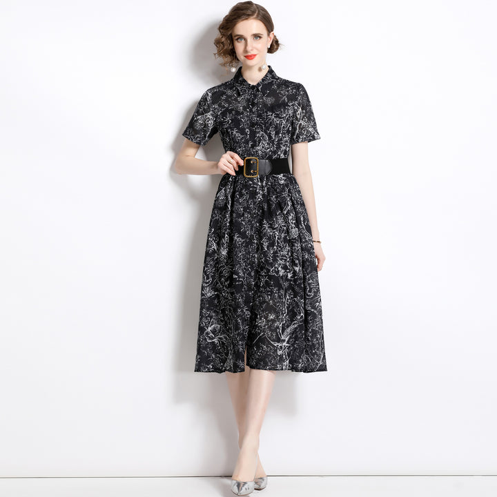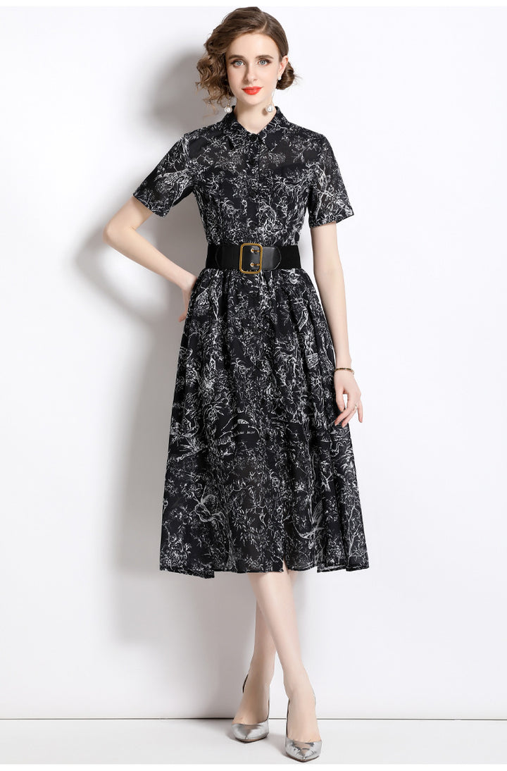 Temperament Vintage Print Short Sleeve Large Swing Slim Lapel Long Skirt Dress