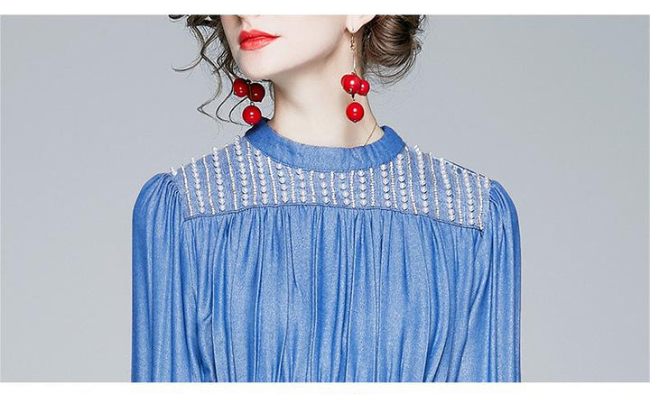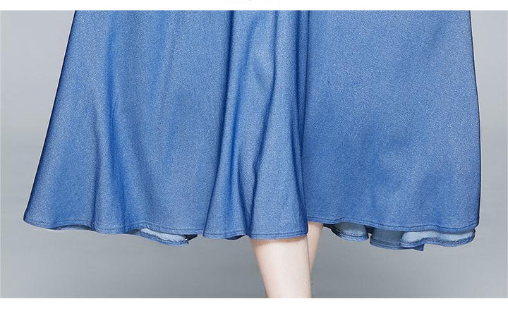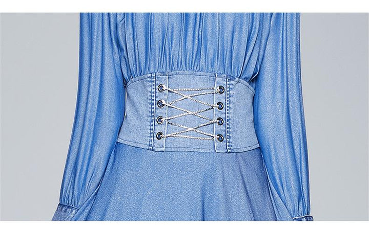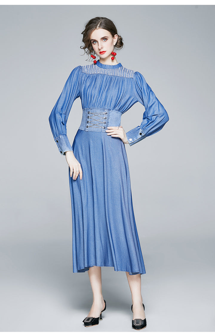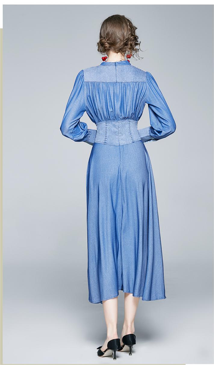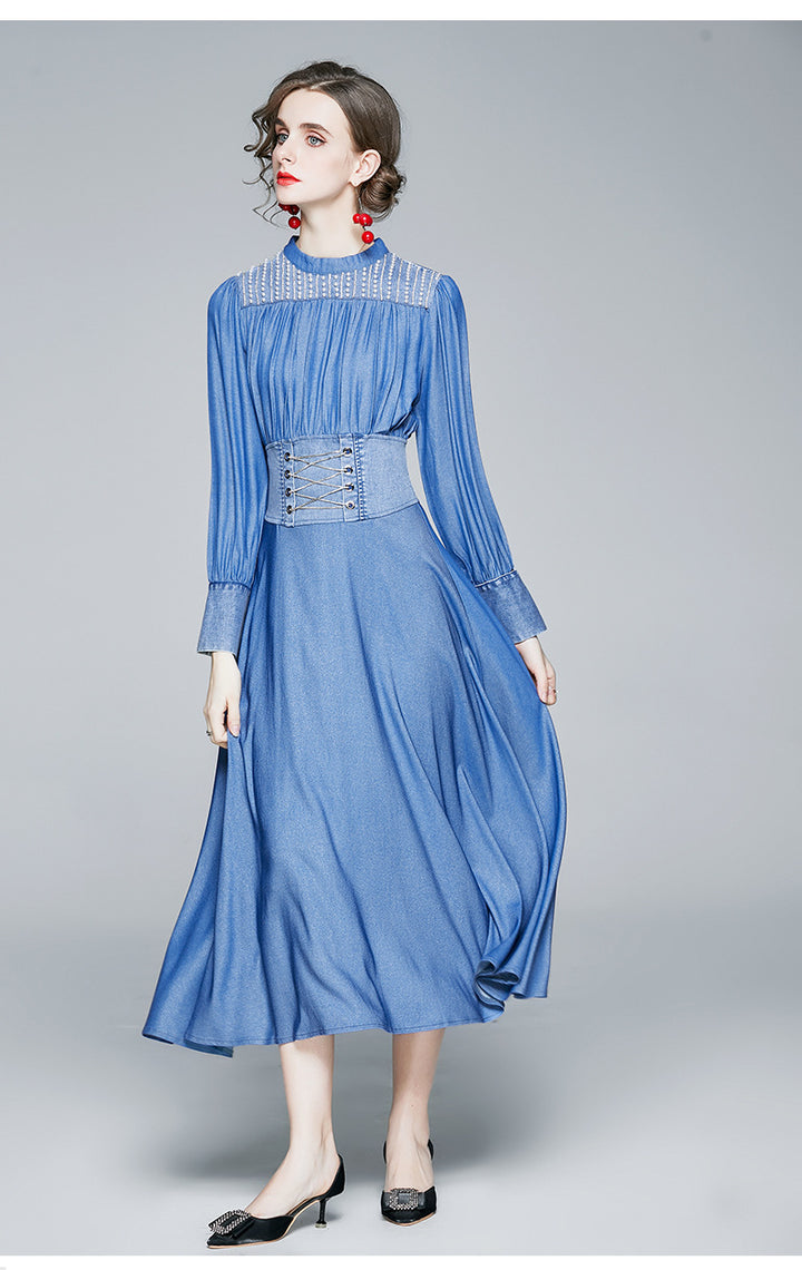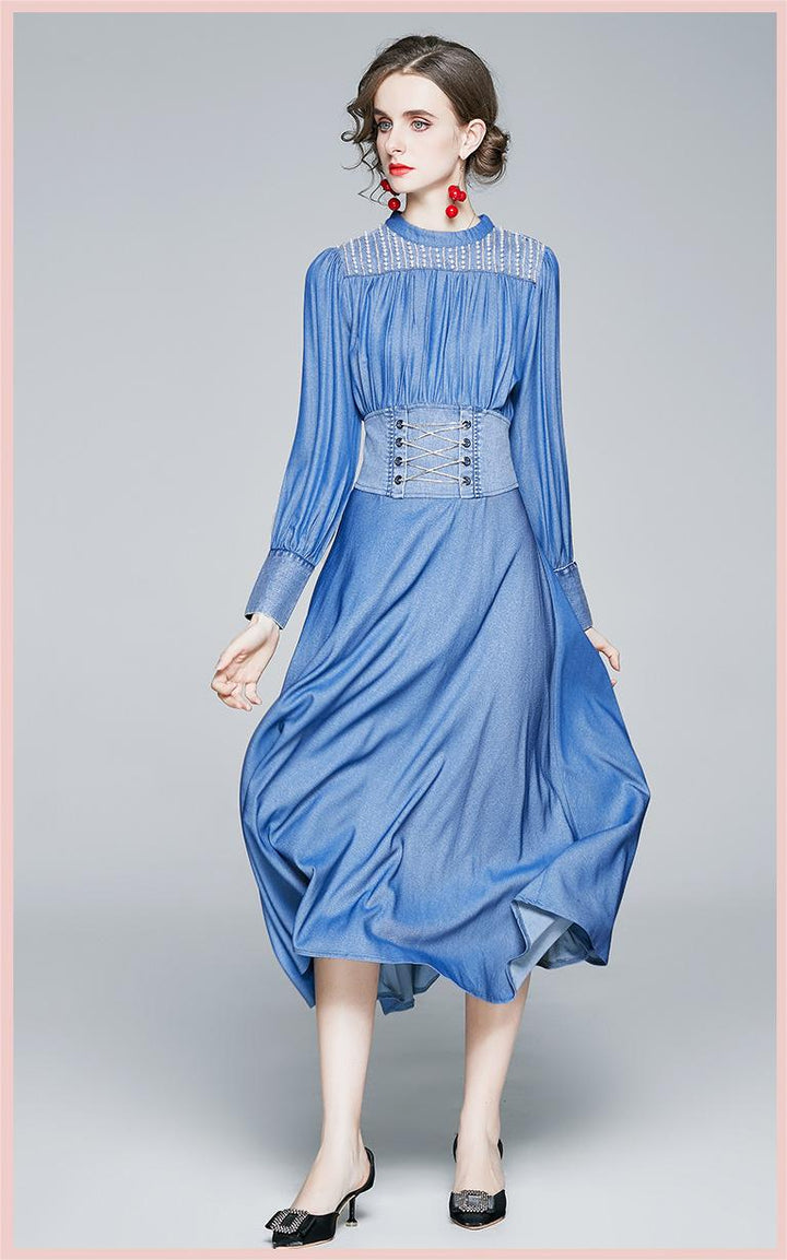 Tencel Denim Dress High Waist Long Sleeve Blue Super Fairy A-Line Skirt