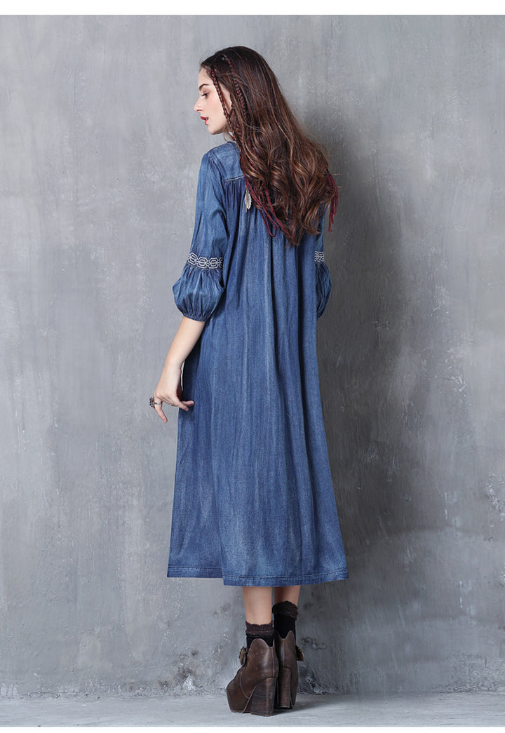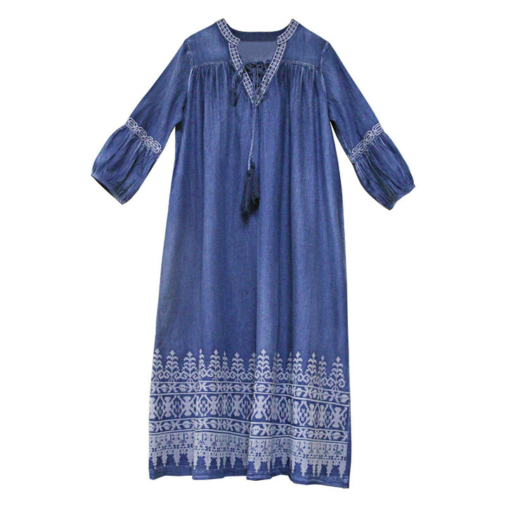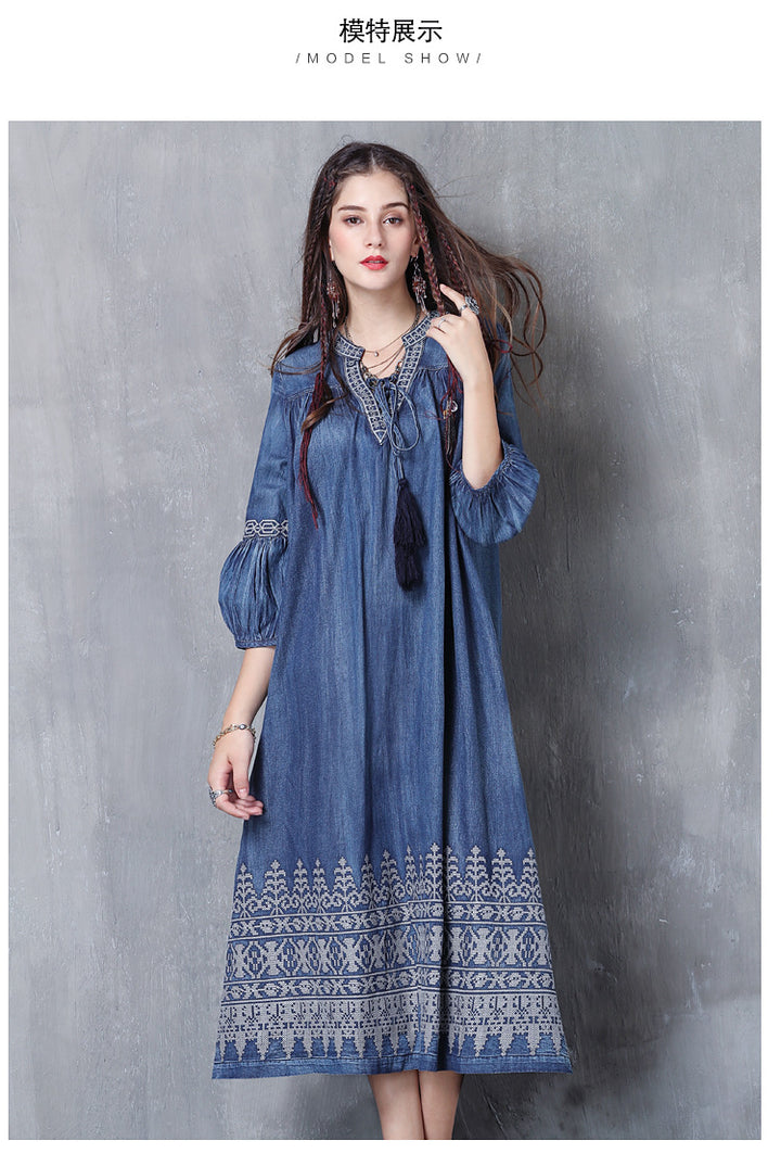 V-Neck Lace-Up Loose A-Line Large Size Temperament Denim Skirt 2023 Spring and Summer Embroidered Mid-Sleeve Vintage Dress