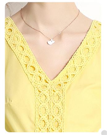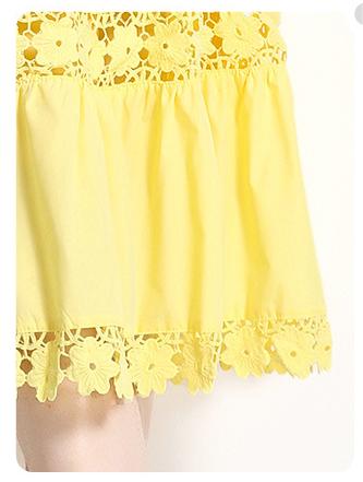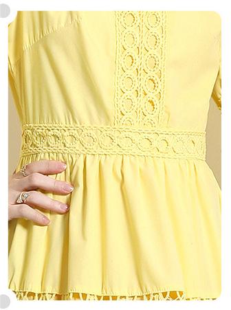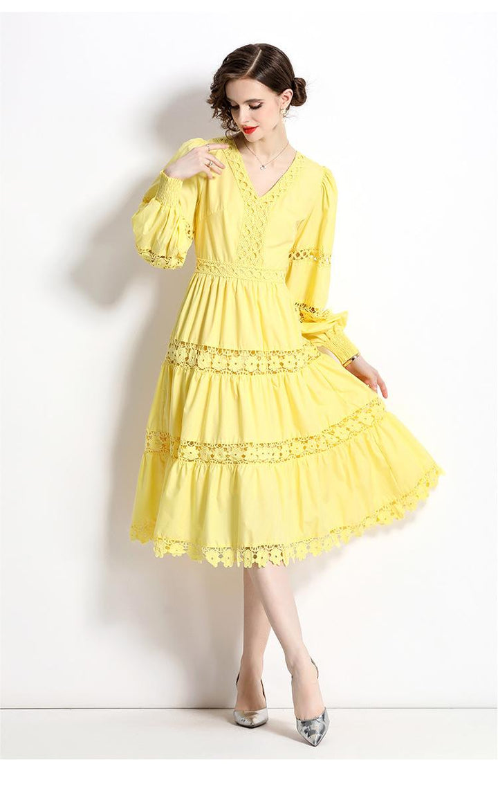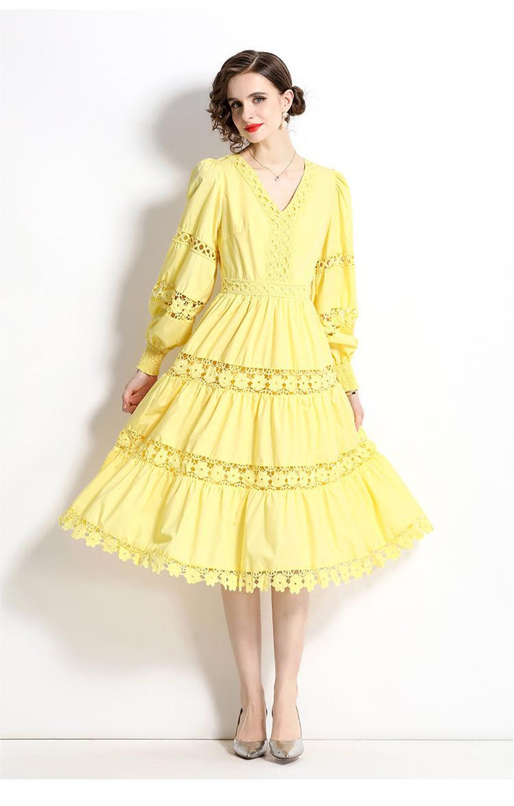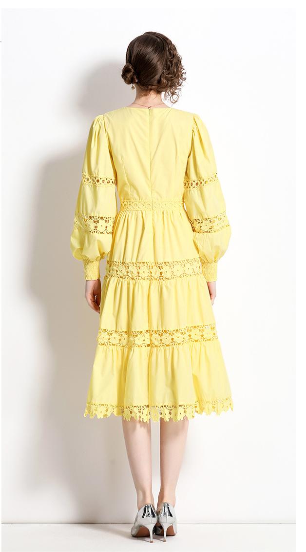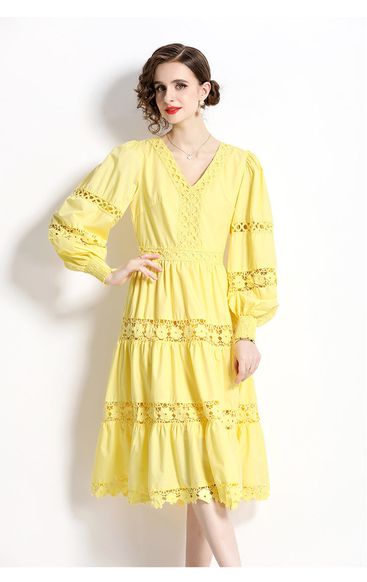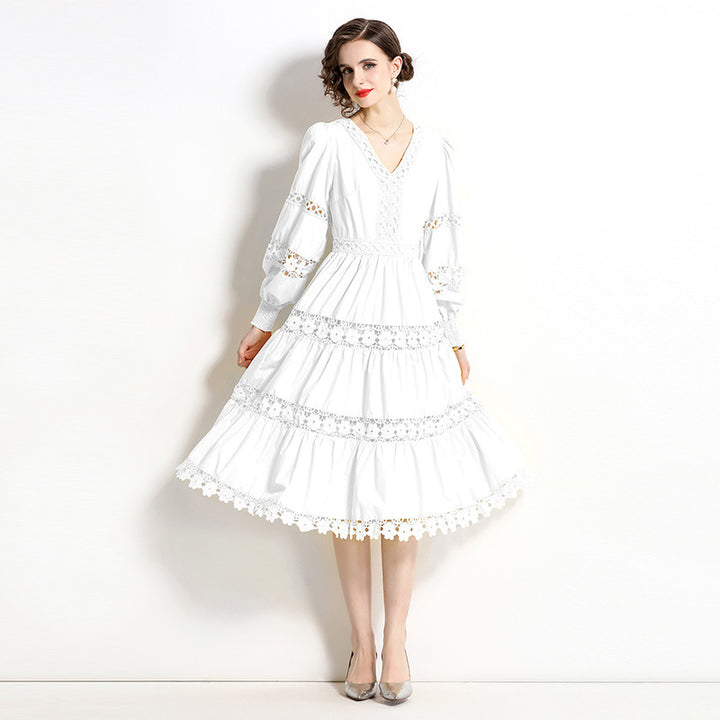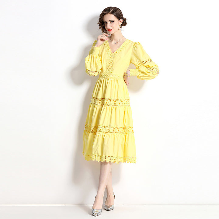 V-Neck Lantern Sleeve Temperament Water-Soluble Lace Stitching Mid-Length Dress