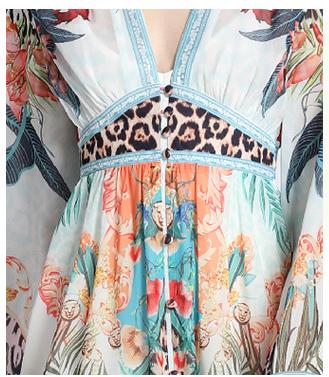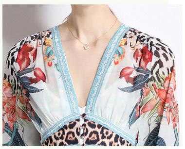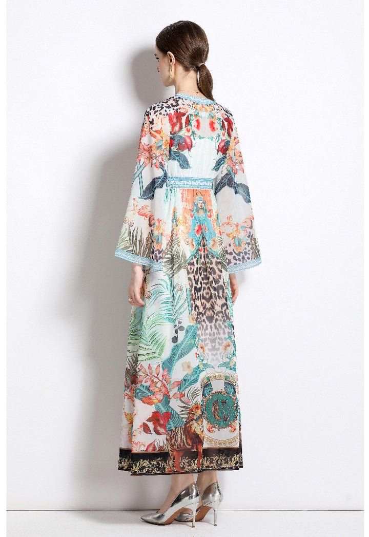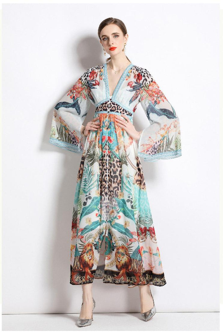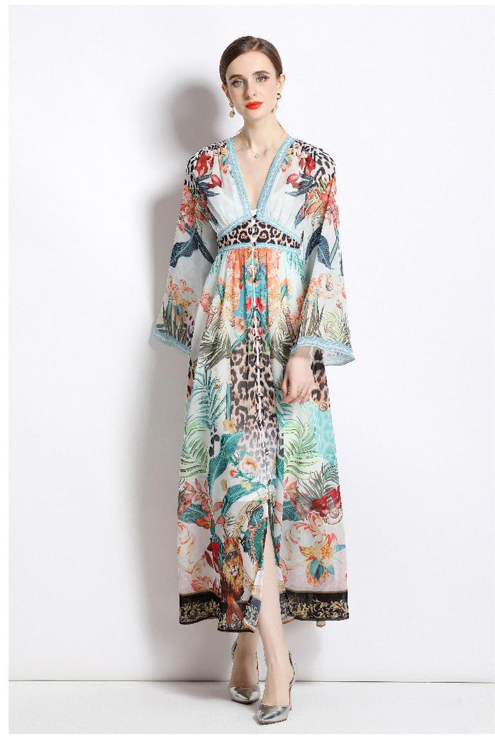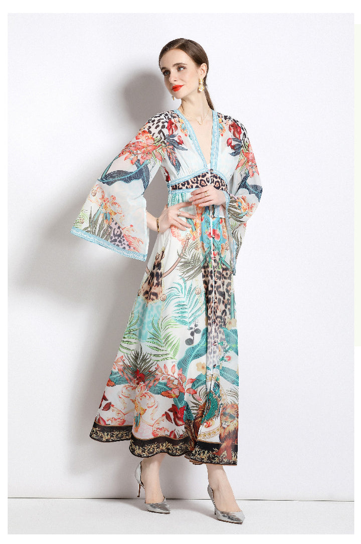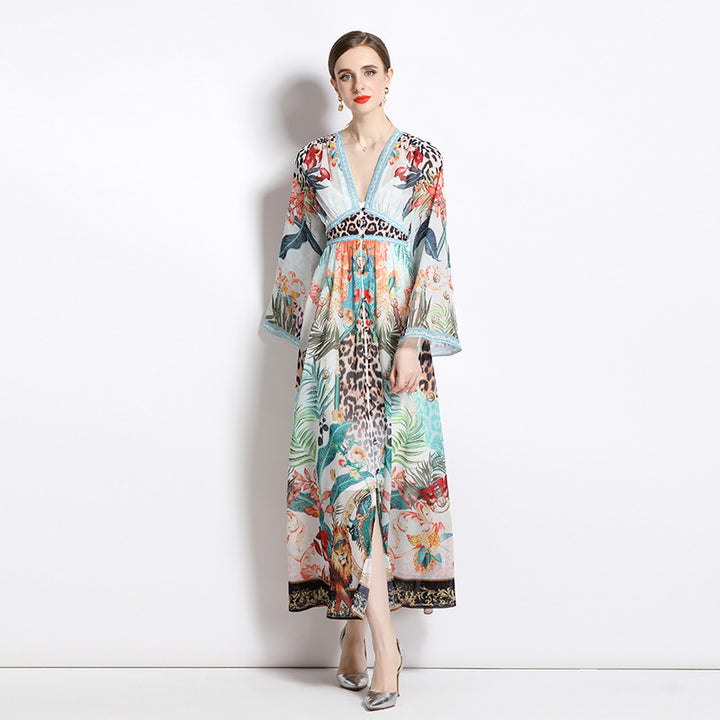 V-Neck Long-Sleeved Chiffon Fashion Resort Style Retro Full-Length Skirt Dress