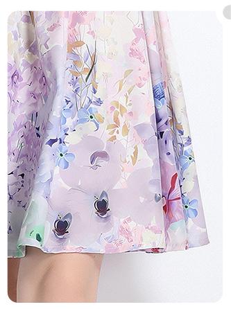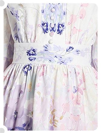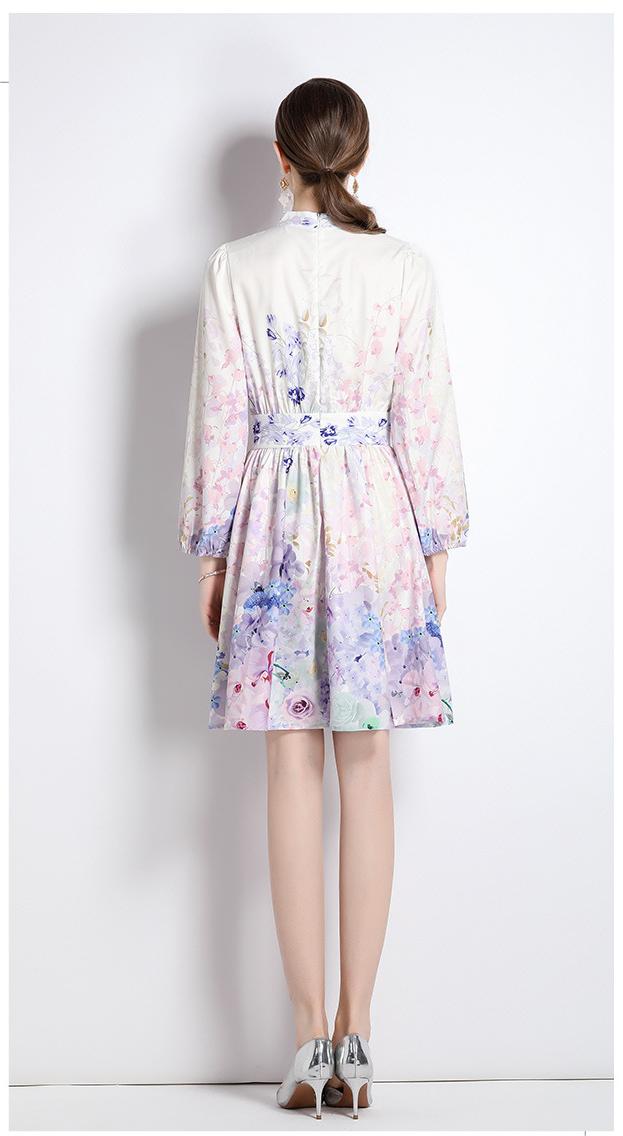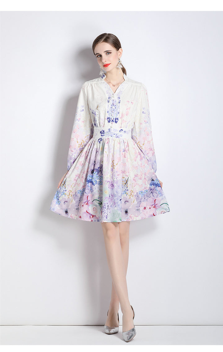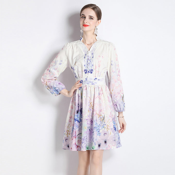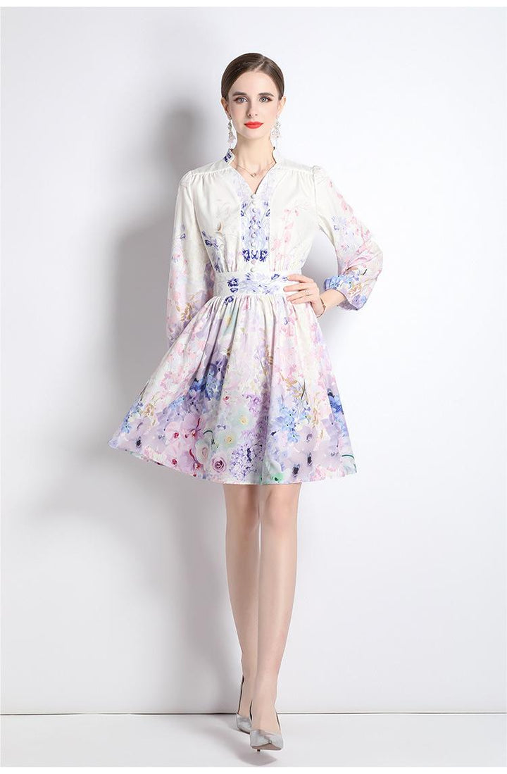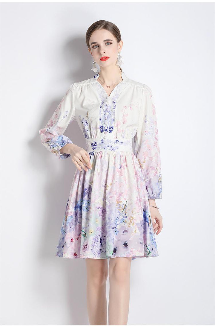 V-Neck Vintage Print Long-Sleeved Dress Slim-Fit and Slim-Waist A-Line Skirt
