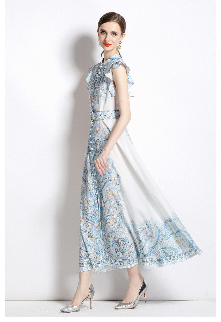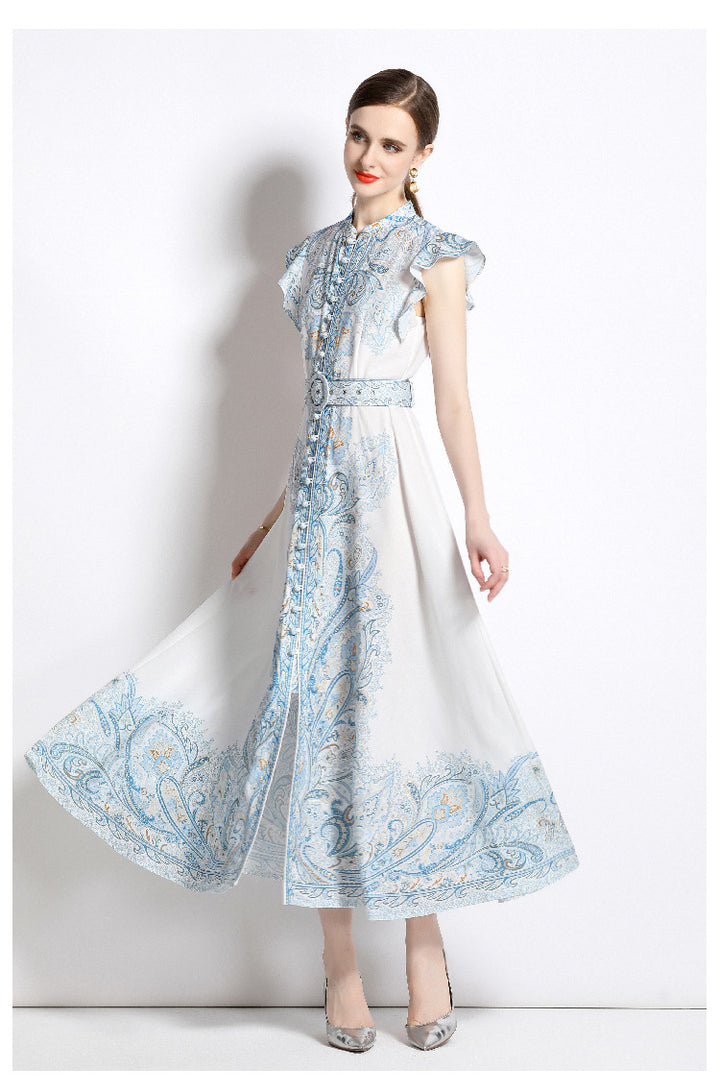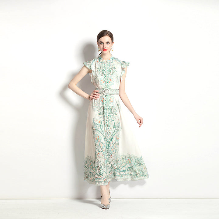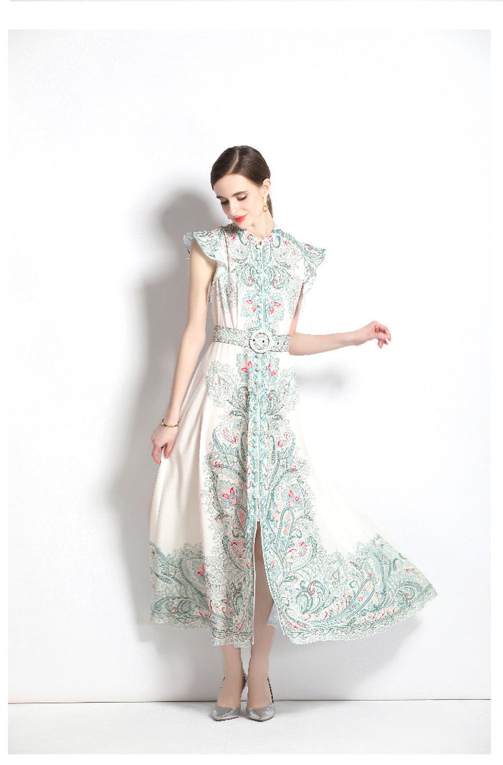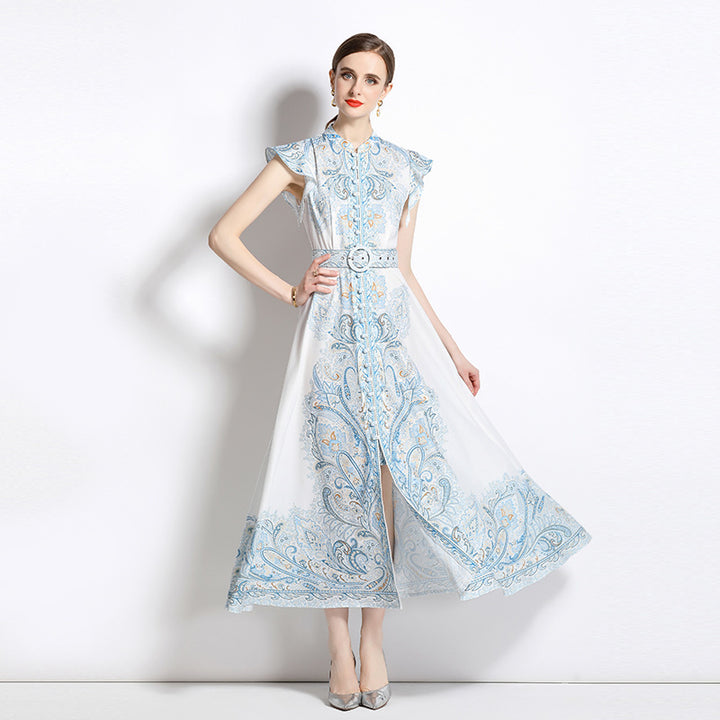 Vintage Fashion Print Dress Single Breasted Large Swing A-Line Skirt