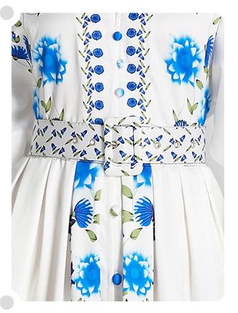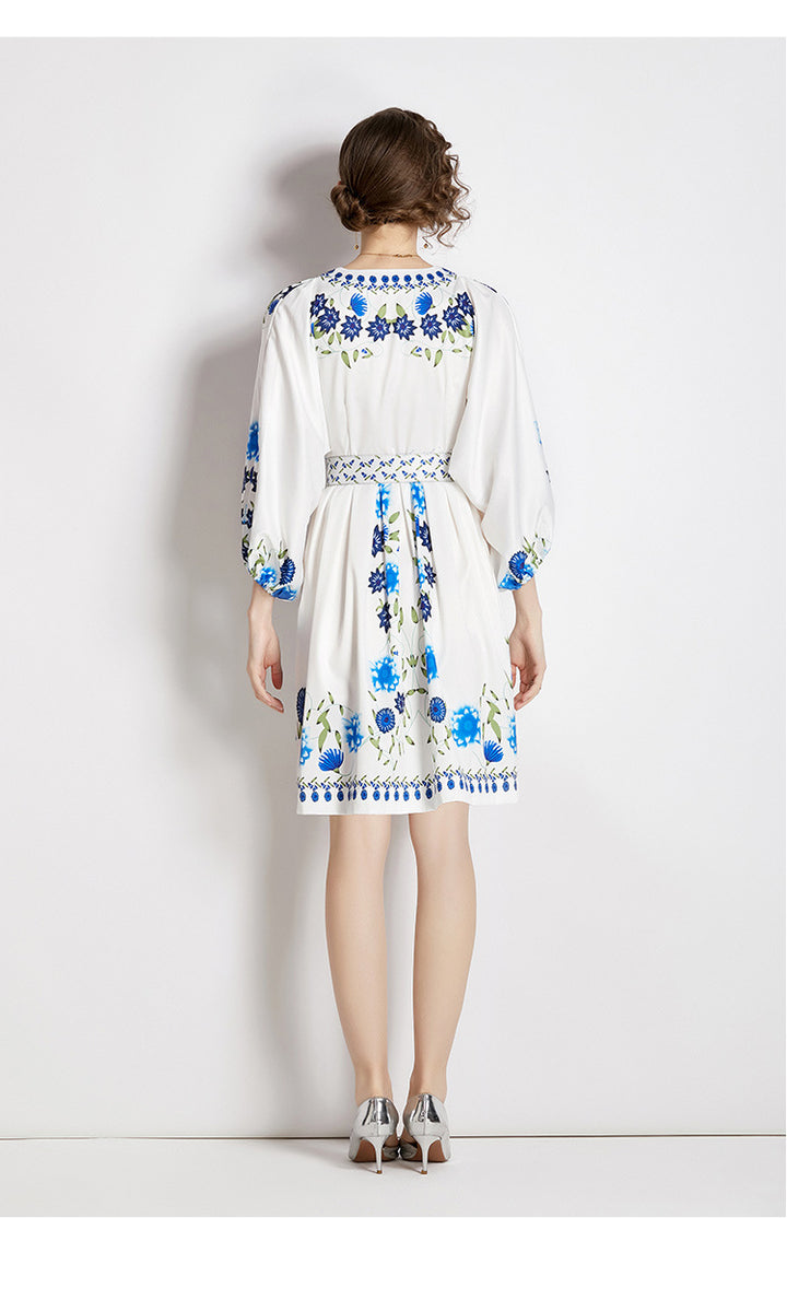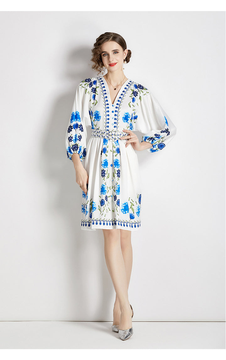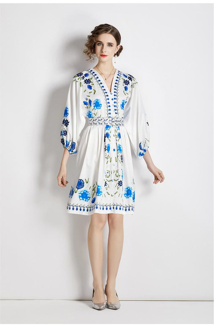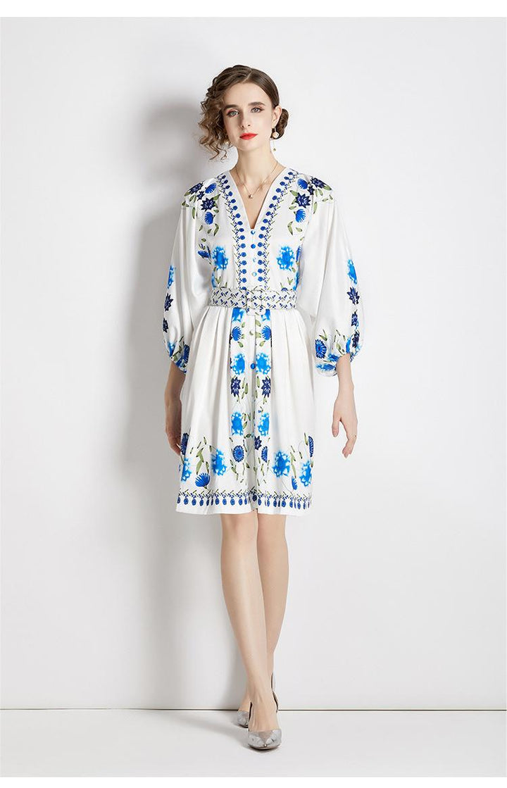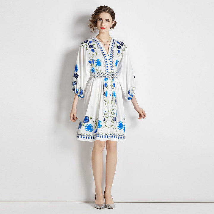 Vintage Fashion Printed Dress Temperament Slim Elegant V-Neck A-Line Skirt