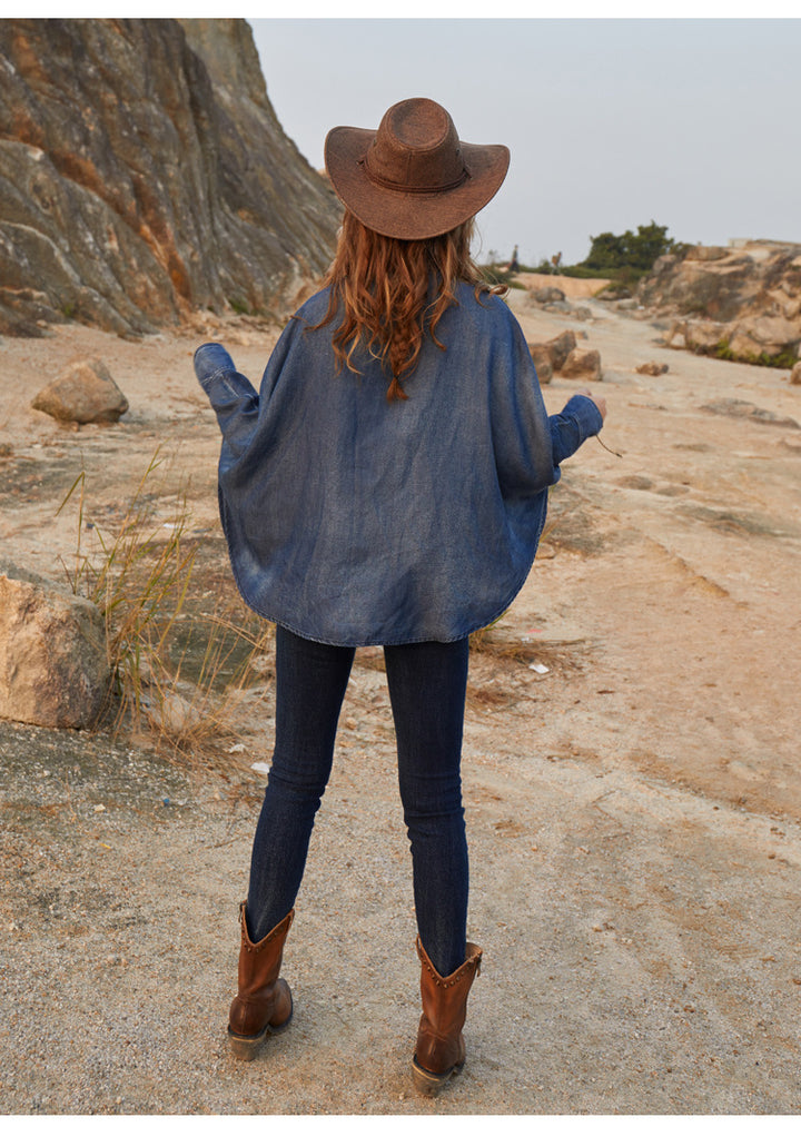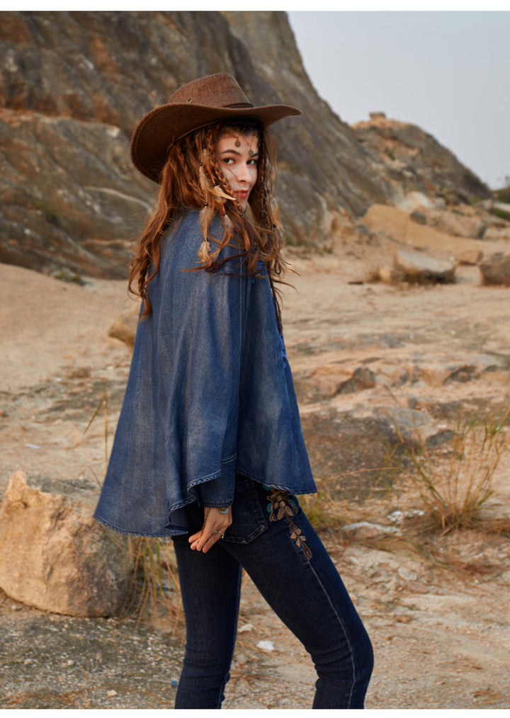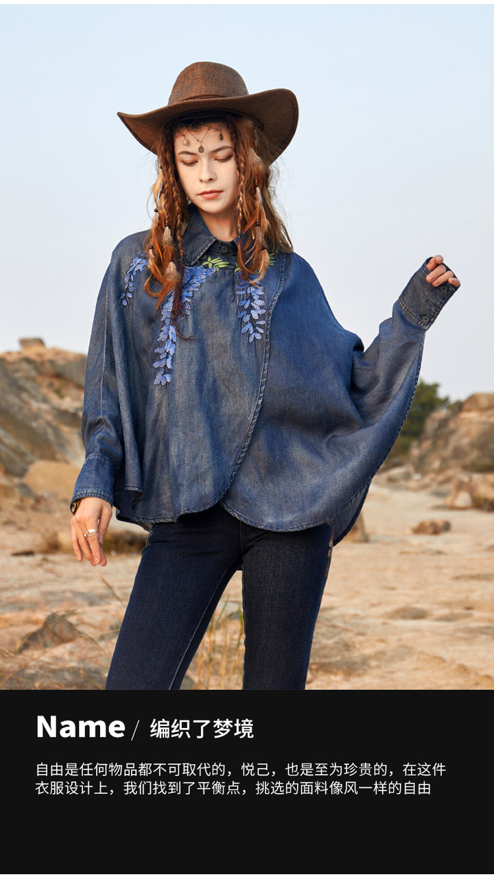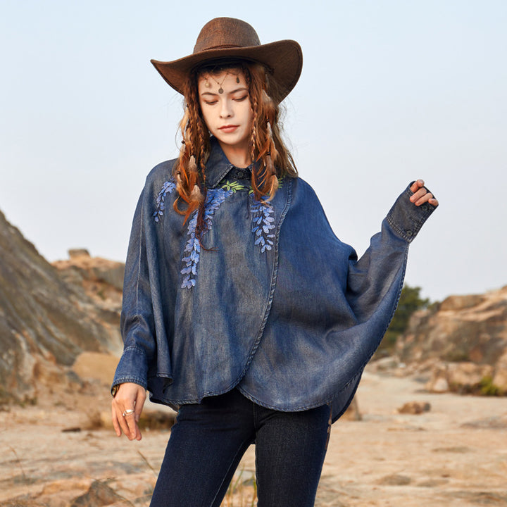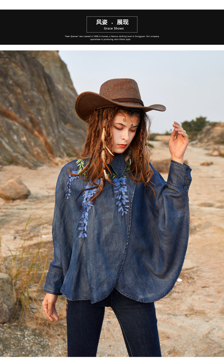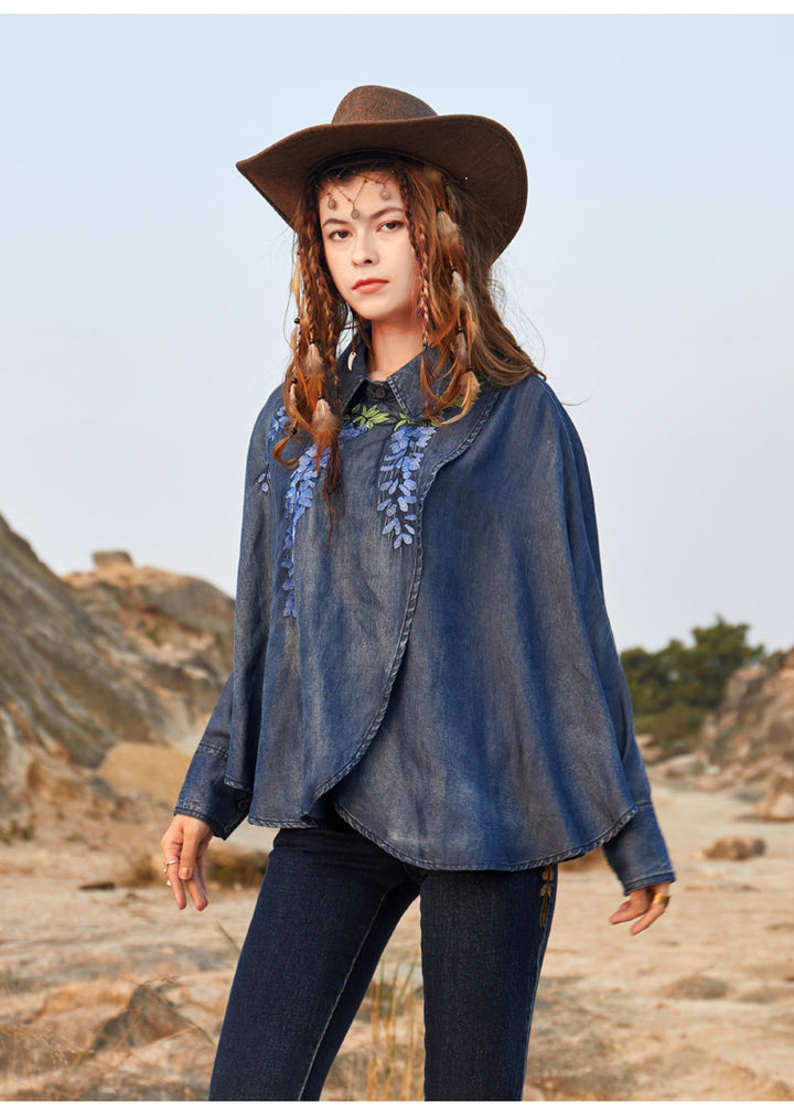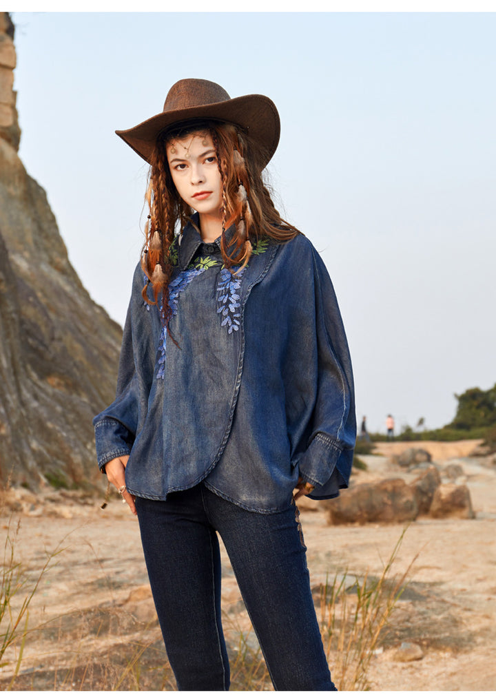 Vintage Heavy Industry Embroidery Loose Lapel Denim Top