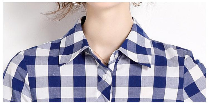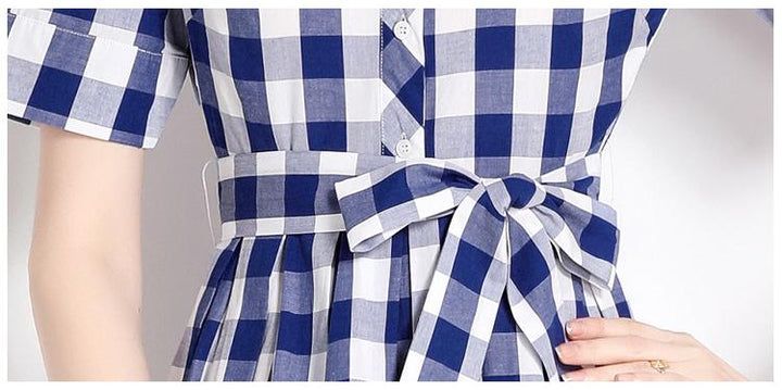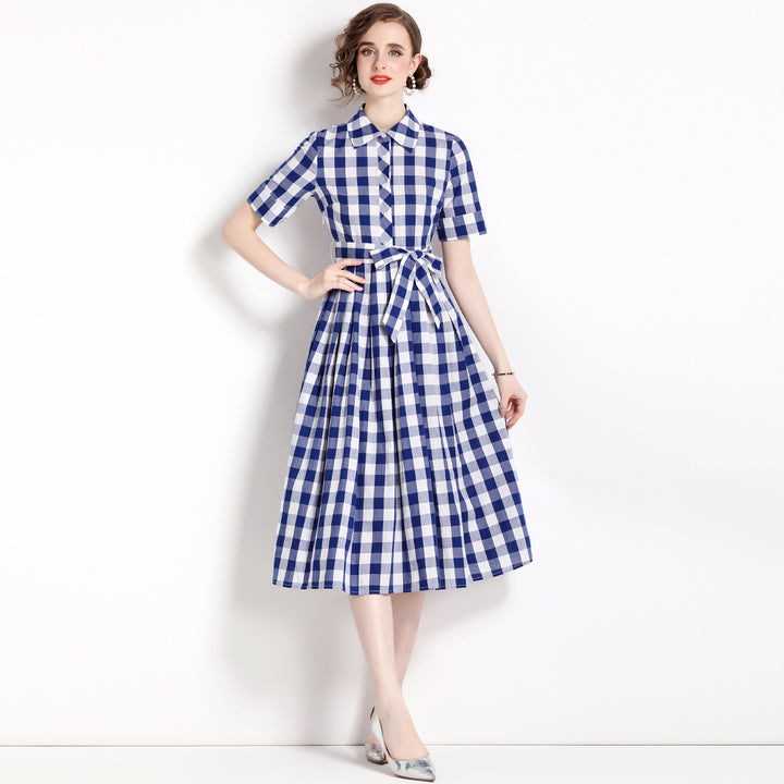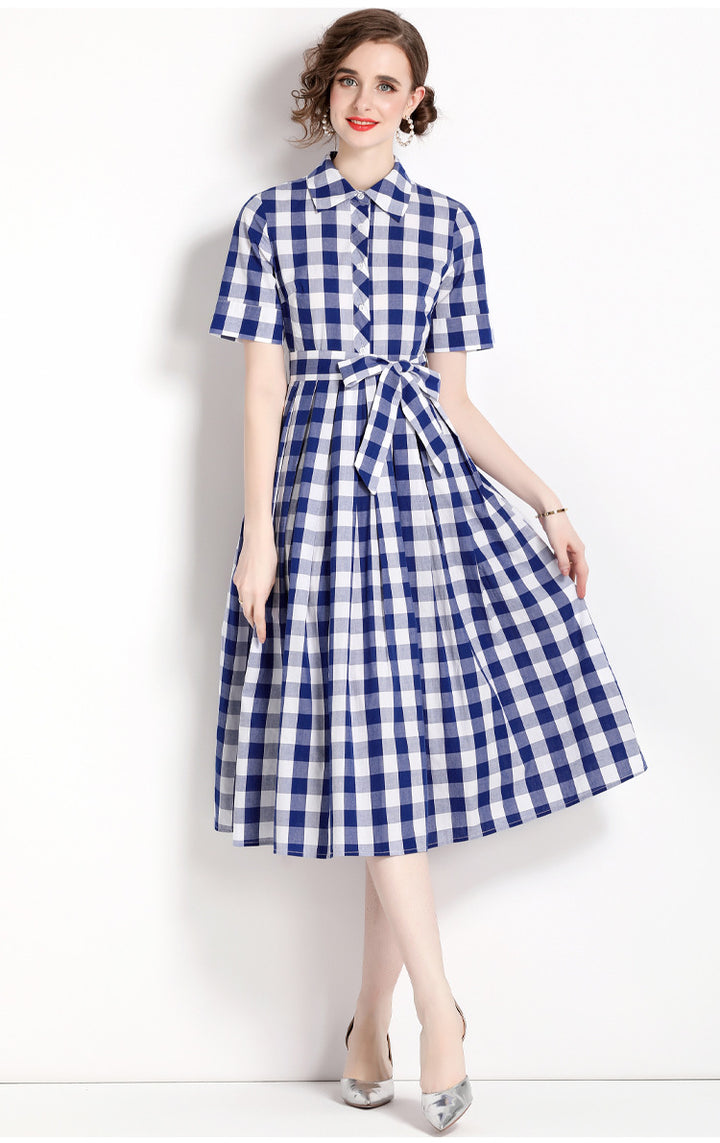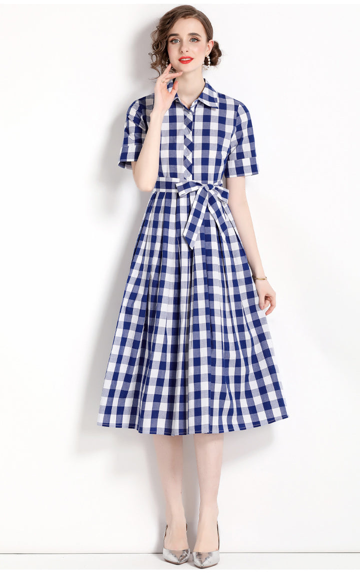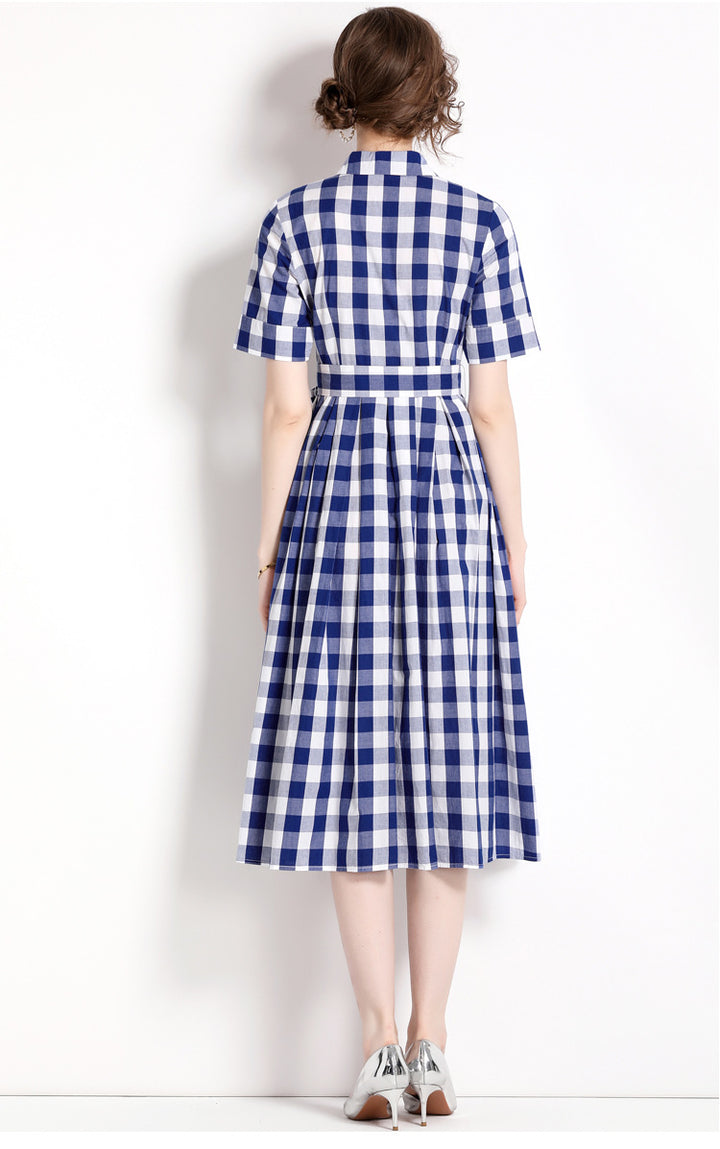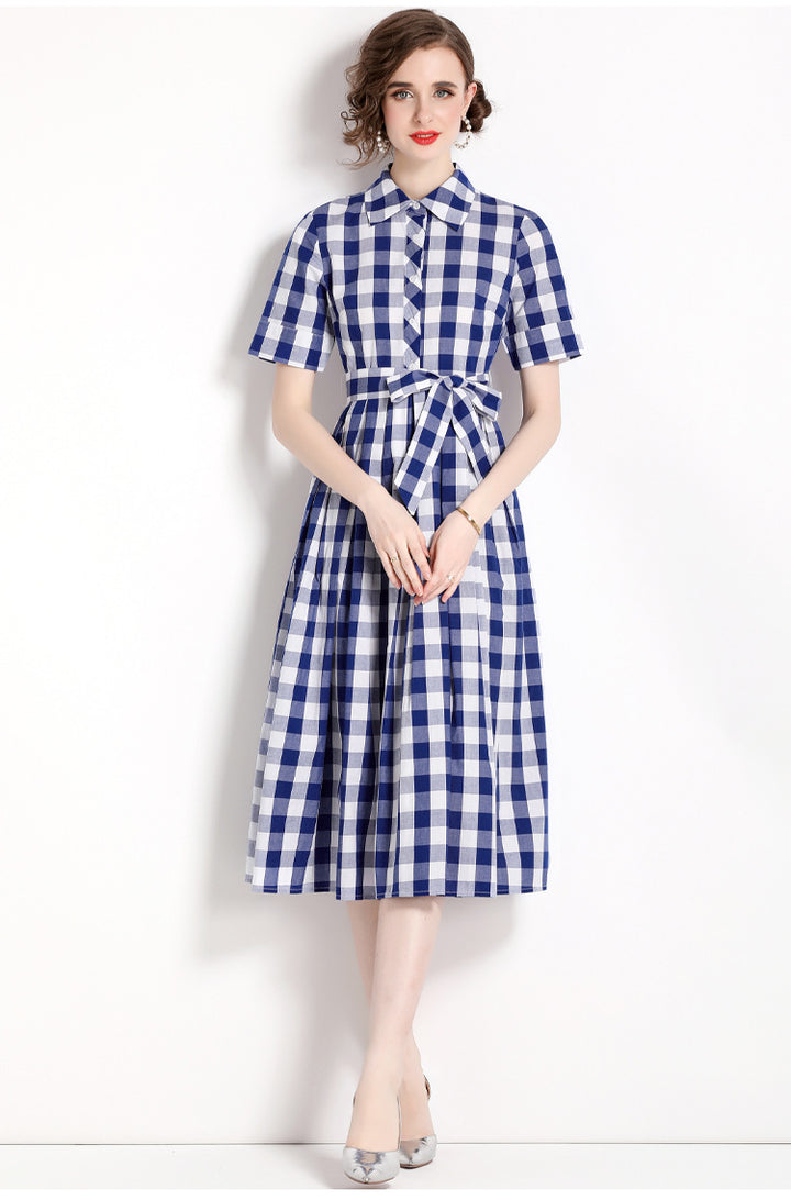 Vintage Lapel Short Sleeve Waist Tucked Long Skirt Plaid Print Dress