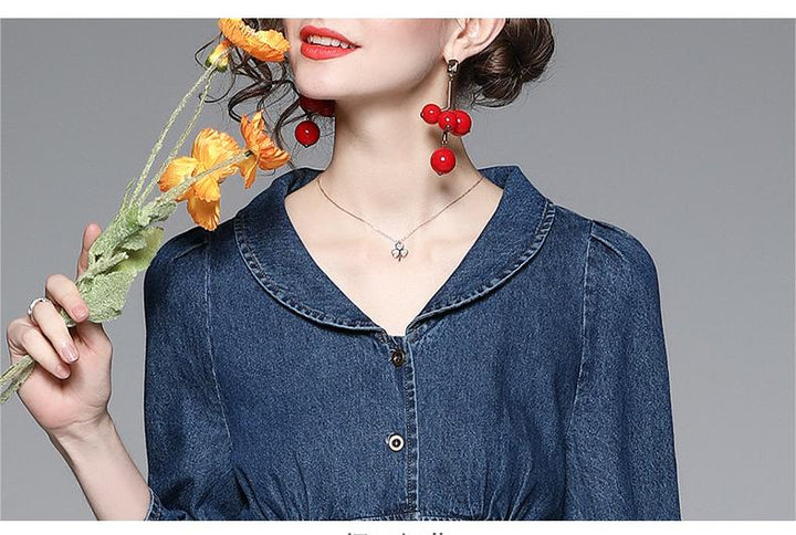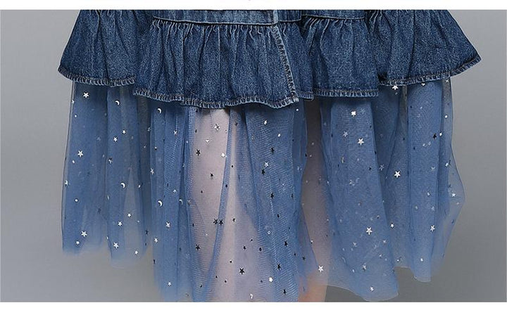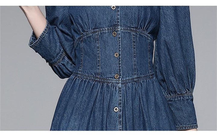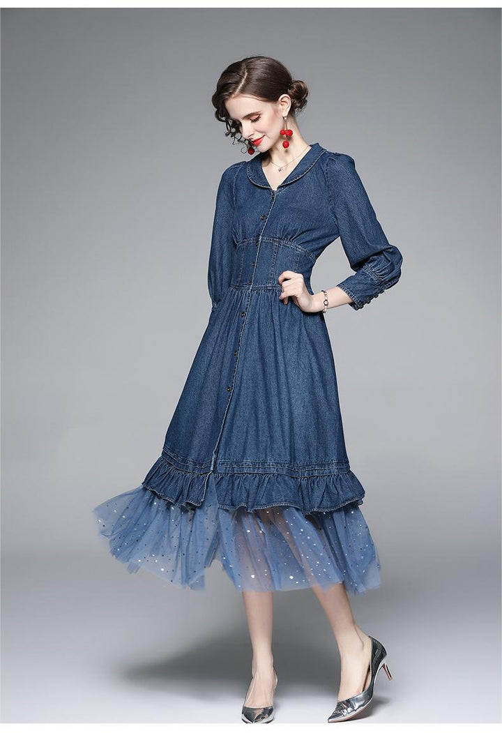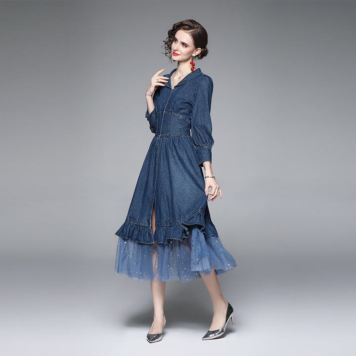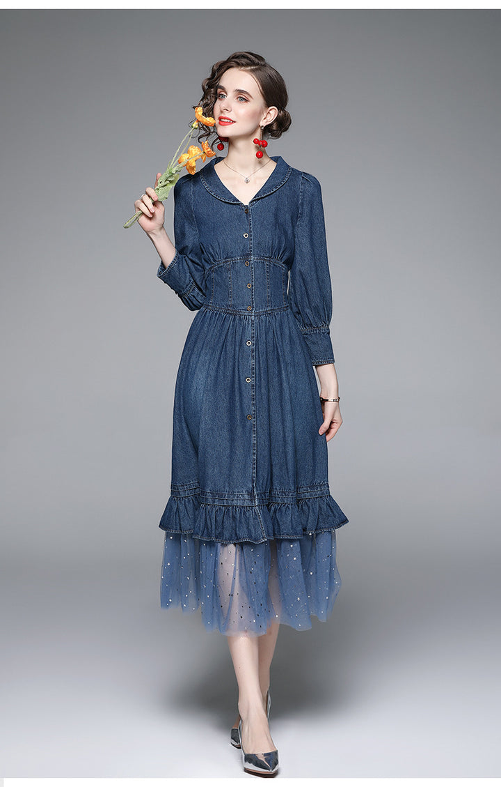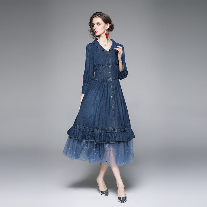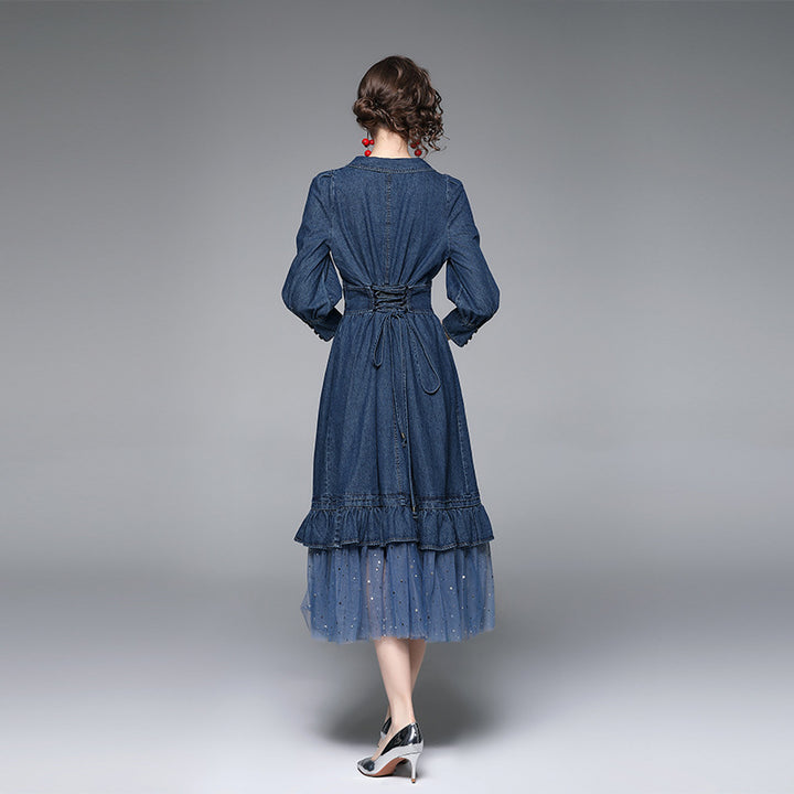 Vintage Long-Sleeved Tucked Waist Denim Patchwork Mesh Long Skirt Dress