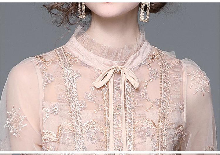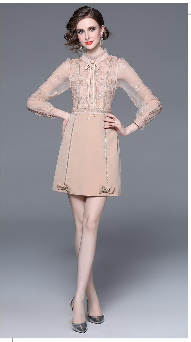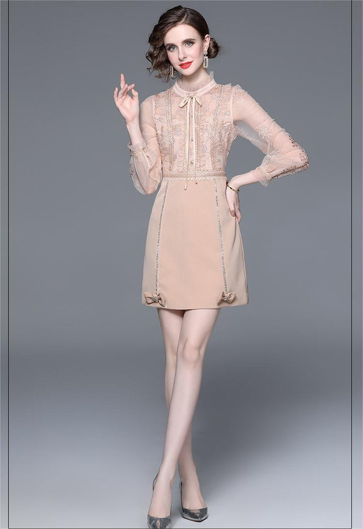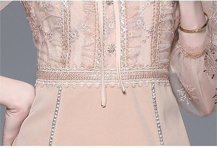 Vintage Mesh Stitching Embroidery Temperament Fashion Long-Sleeved Skirt Dress