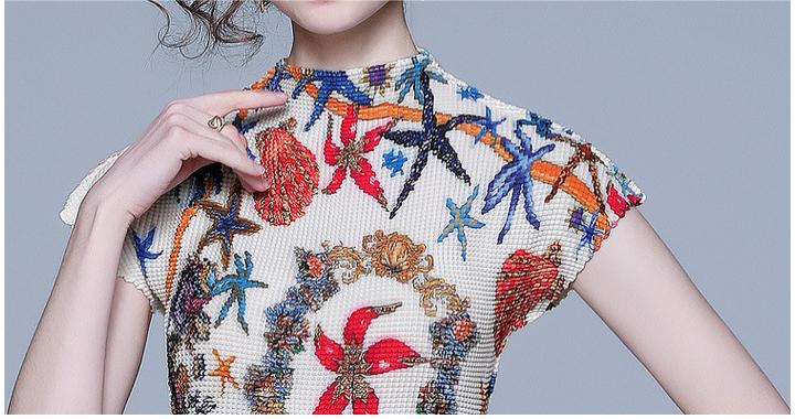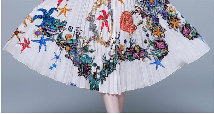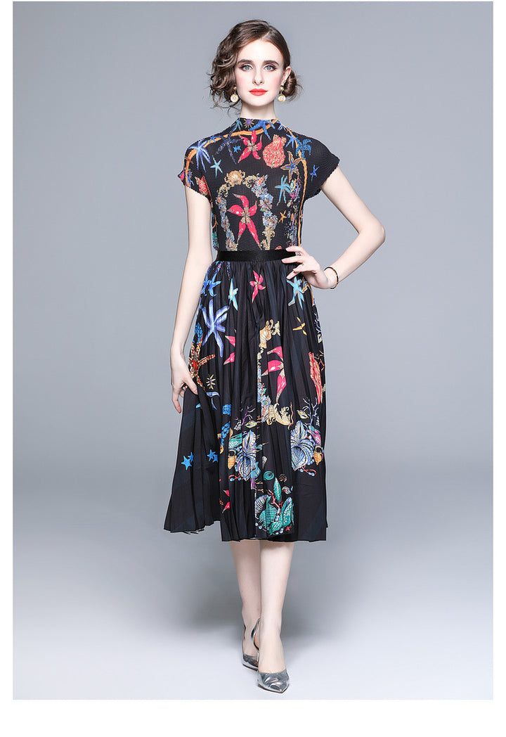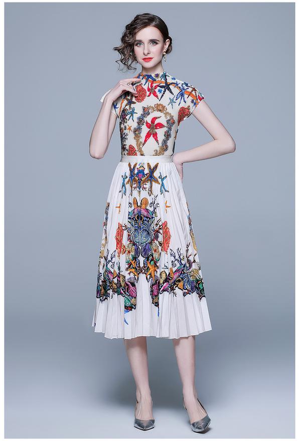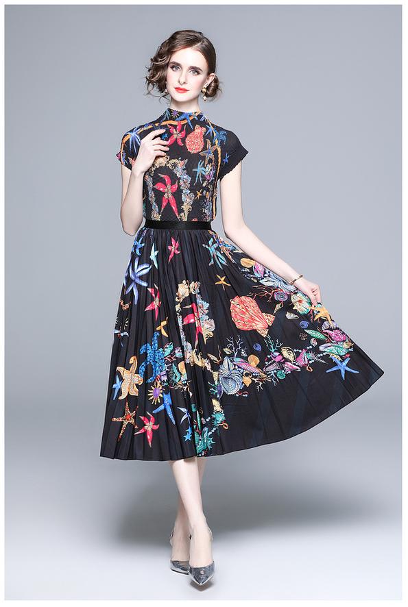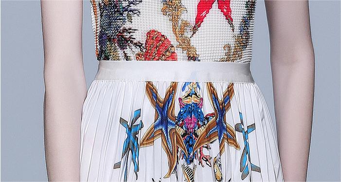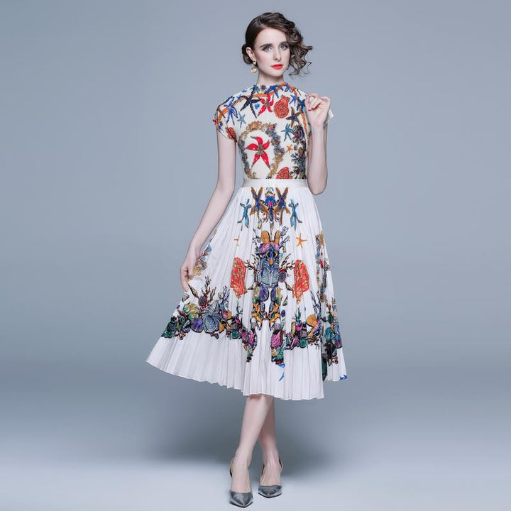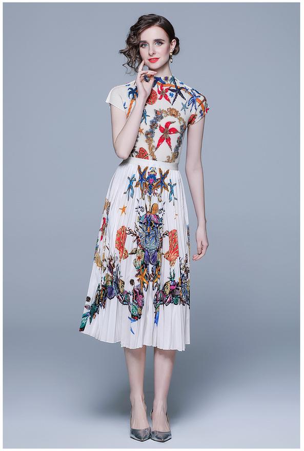 Vintage Print Pleated Short Sleeve Top and Pleated Skirt Fashion Two-Piece Suit