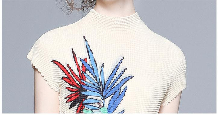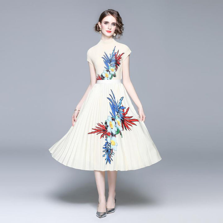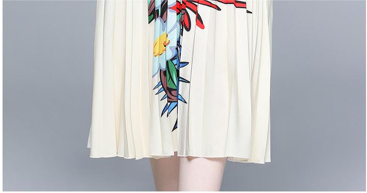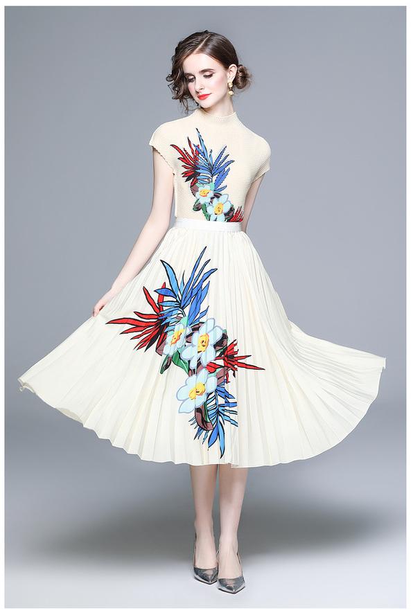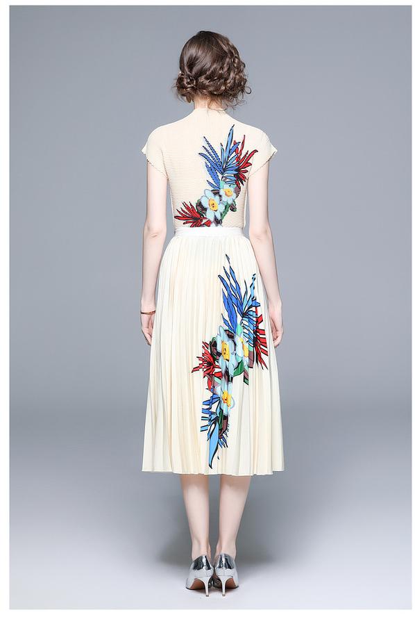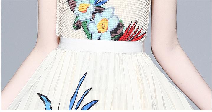 Vintage Print Pleated Short Sleeve Top and Pleated Skirt Fashion Two-Piece Suit