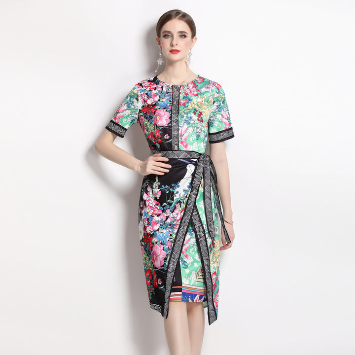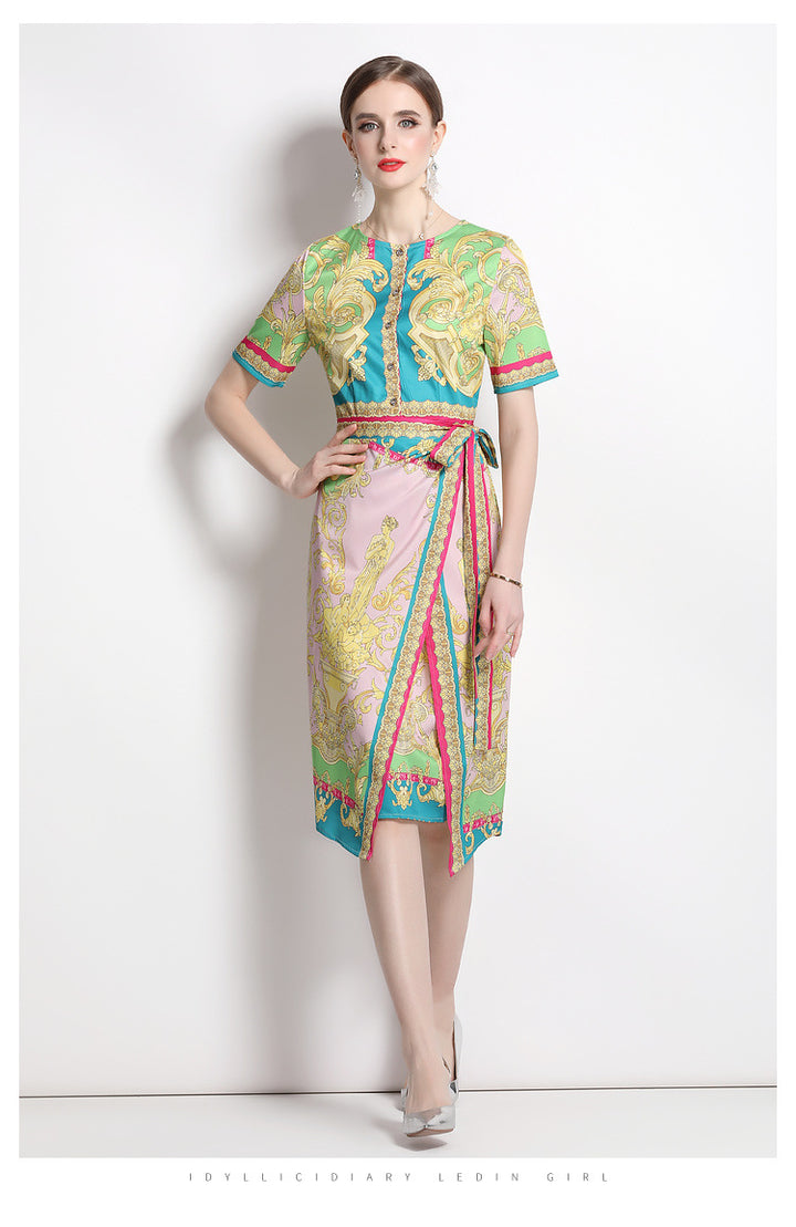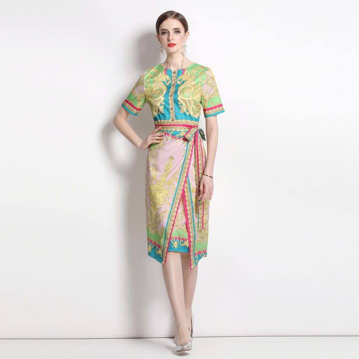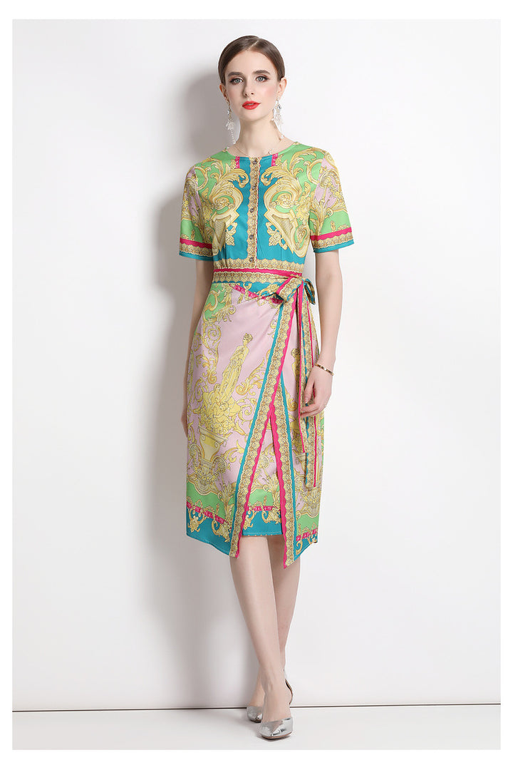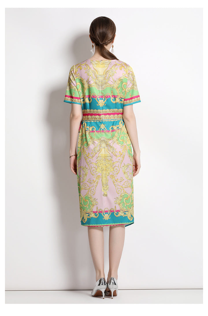 Vintage Print Print MIDI Dress with Waist Drawstring for Slimming