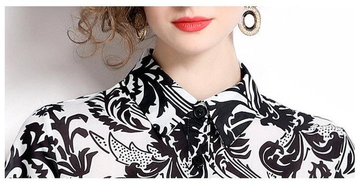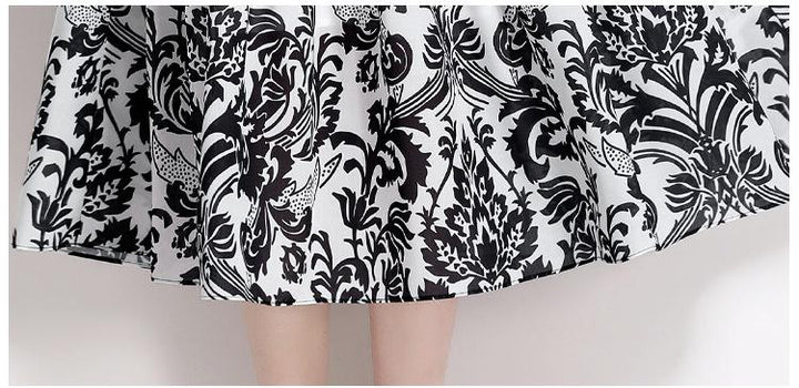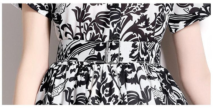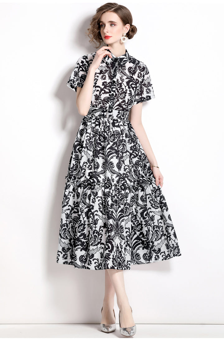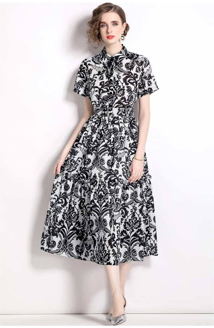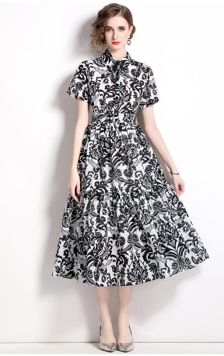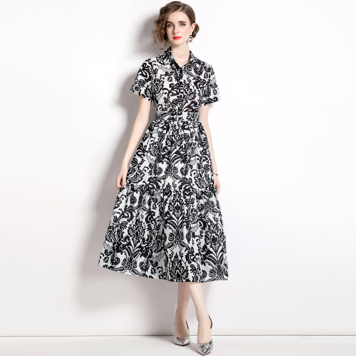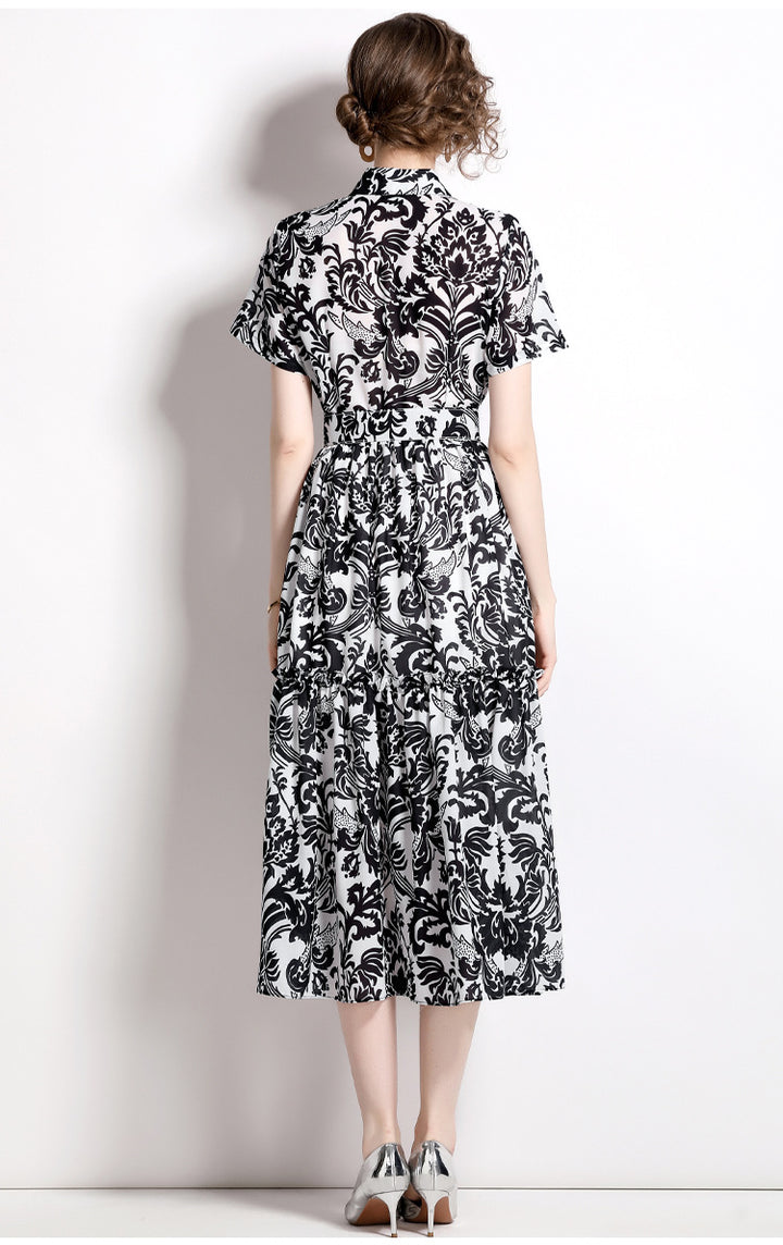 Vintage Print Short Sleeve Large Hem Slim Lapel Maxi Dress