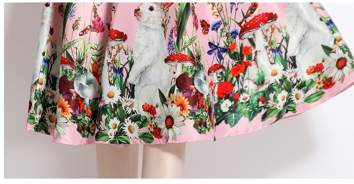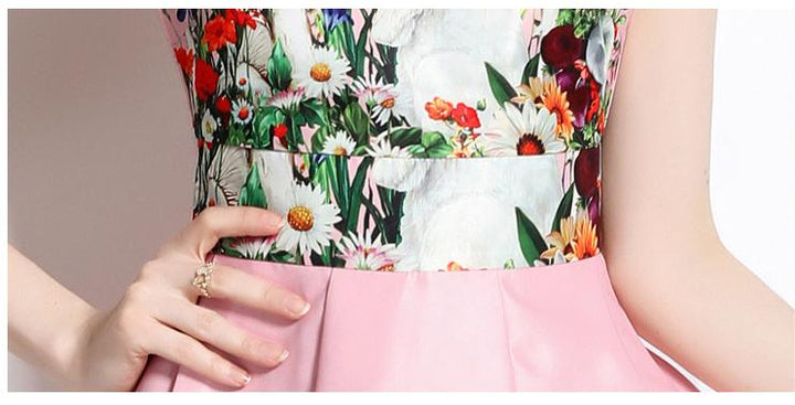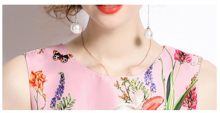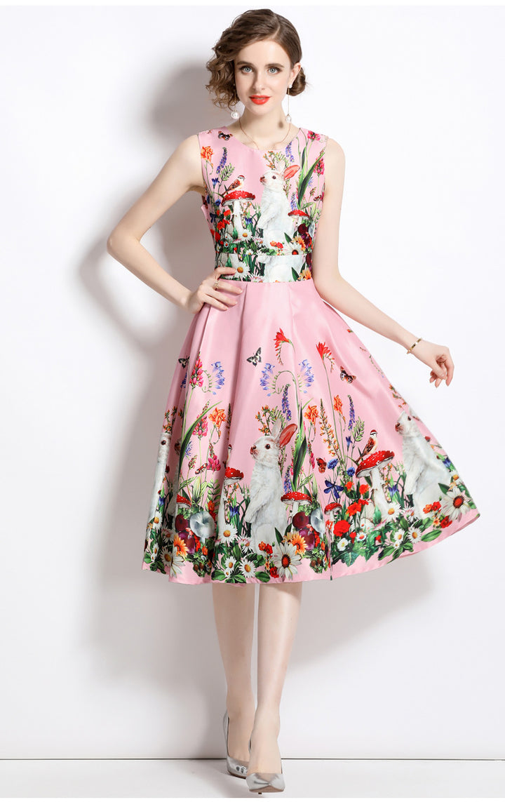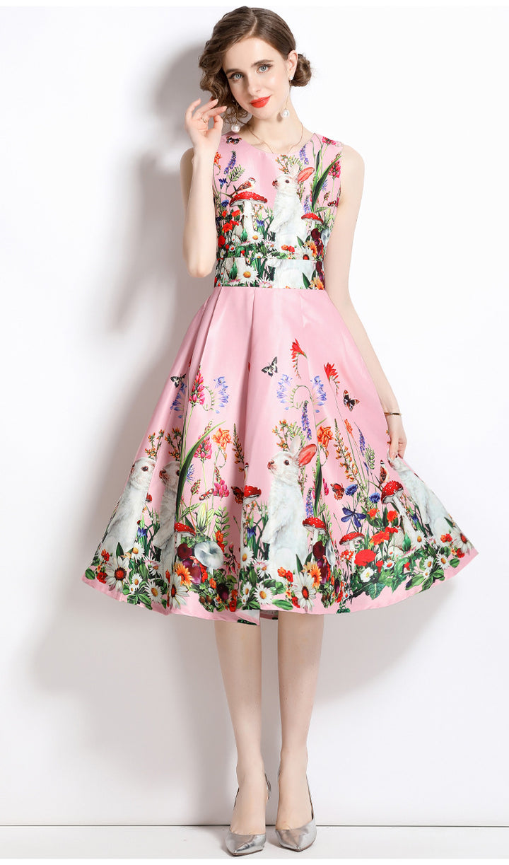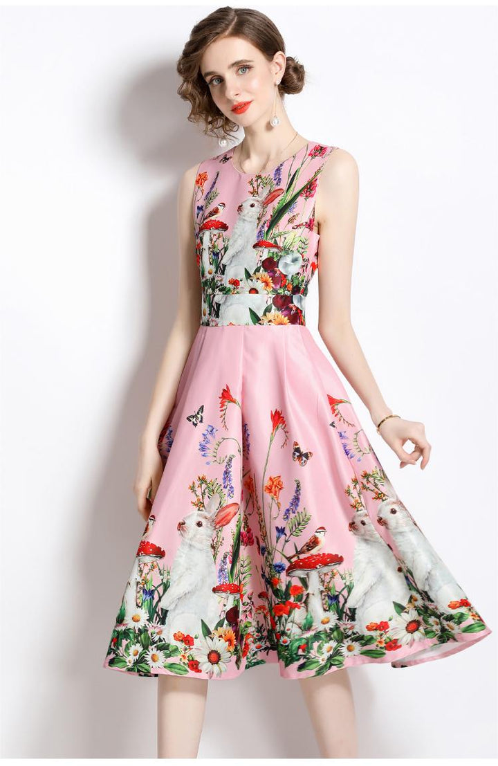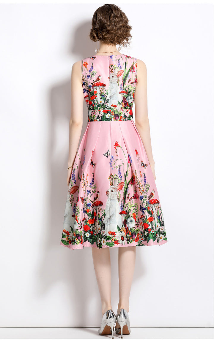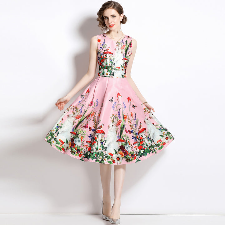 Vintage Print Waist Slimming Sleeveless Dress Mid-Length Skirt