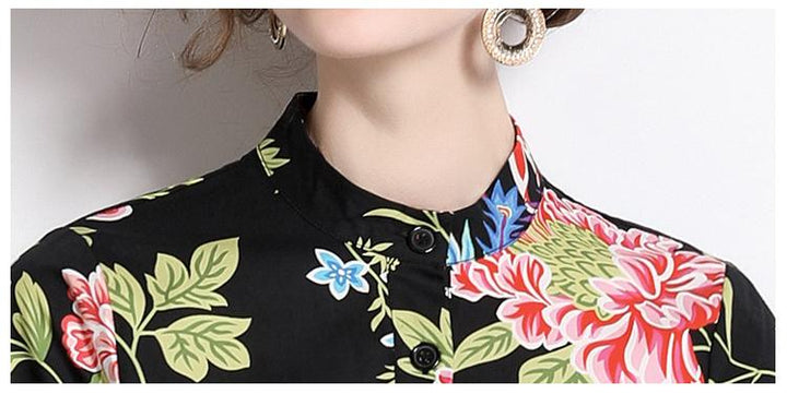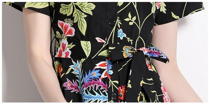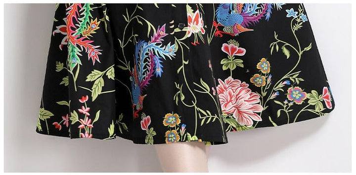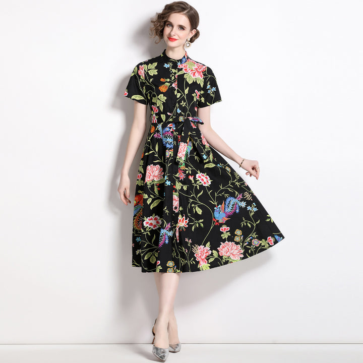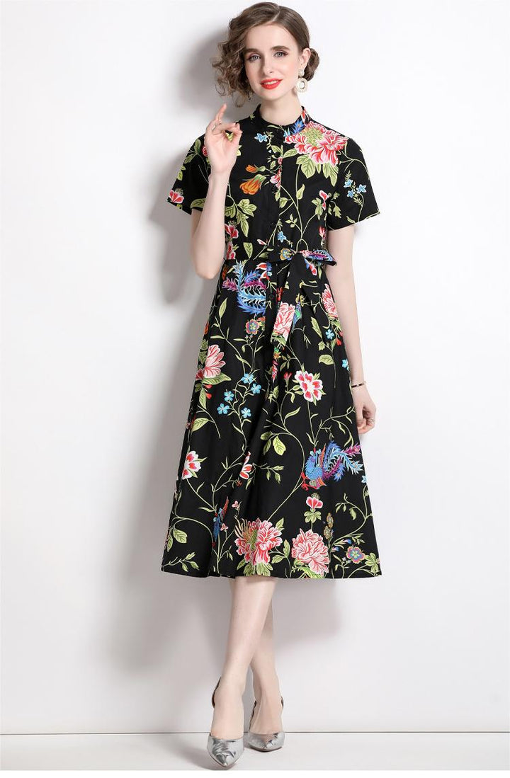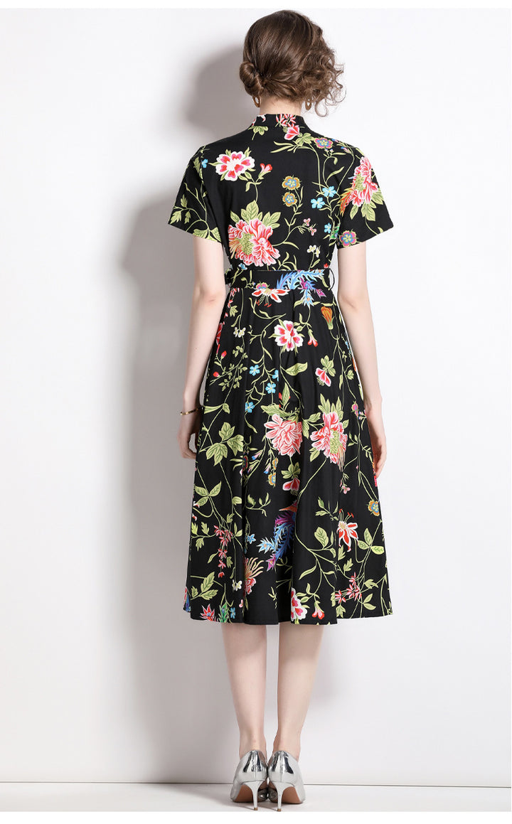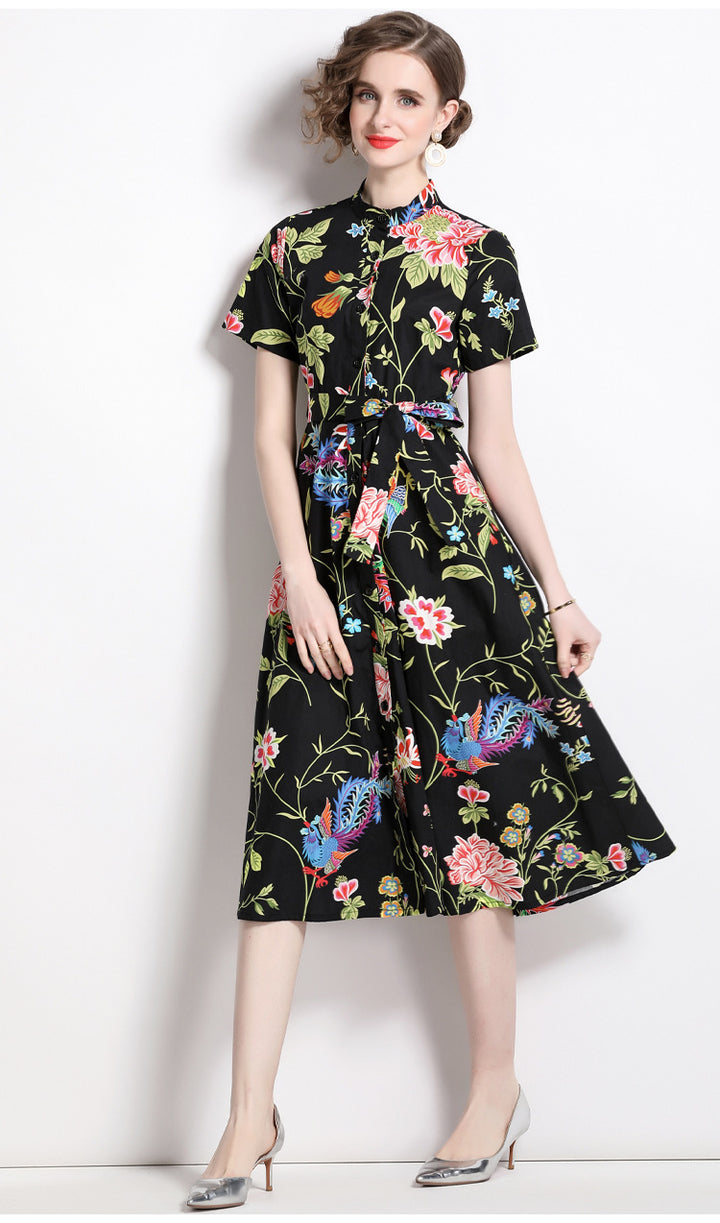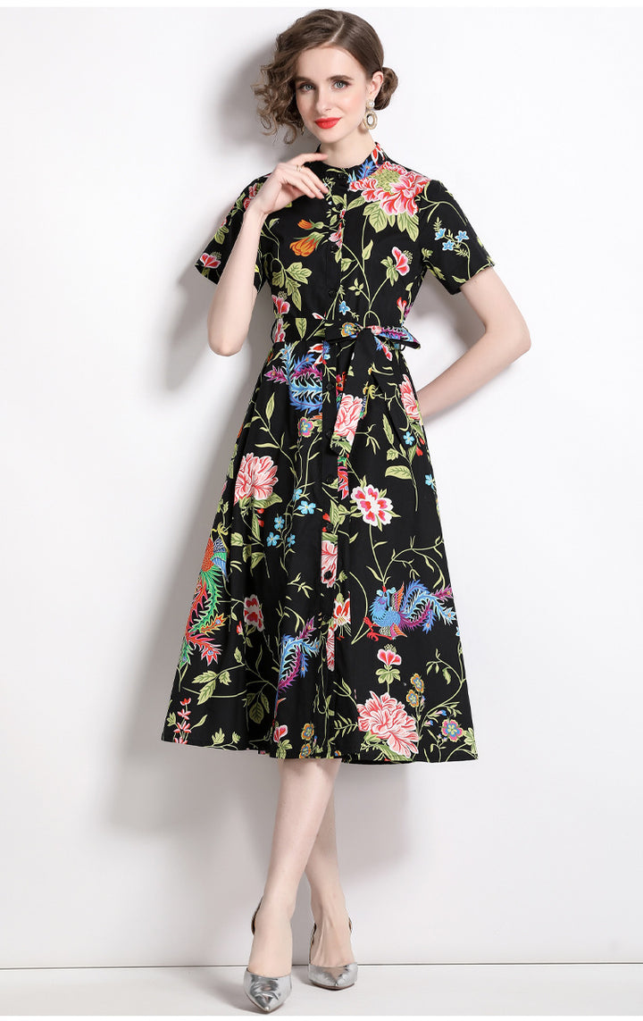 Vintage Printed Short-Sleeved Slim-Fit Mid-Length Large-Swing Dress
