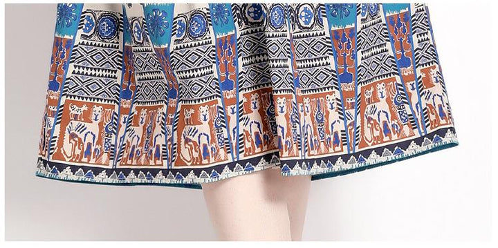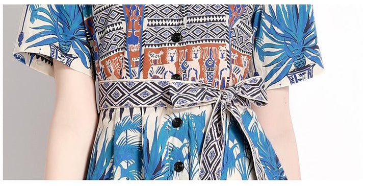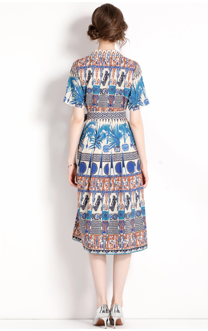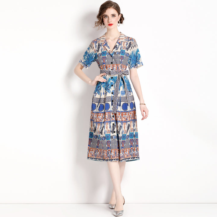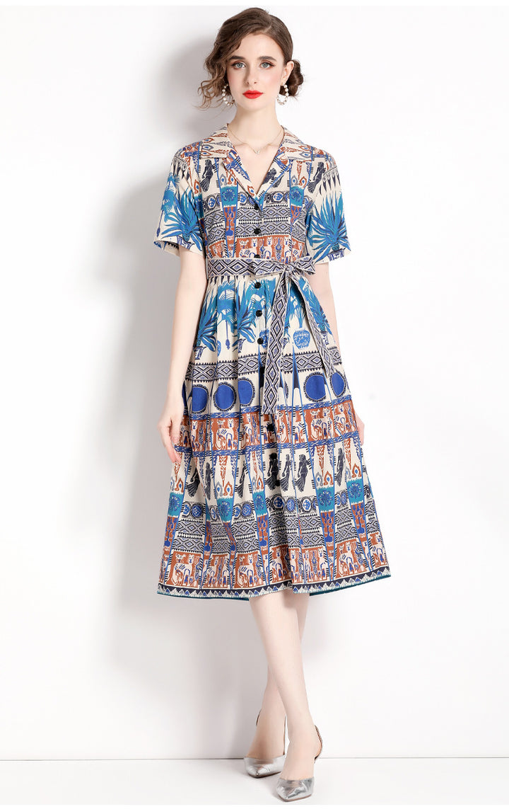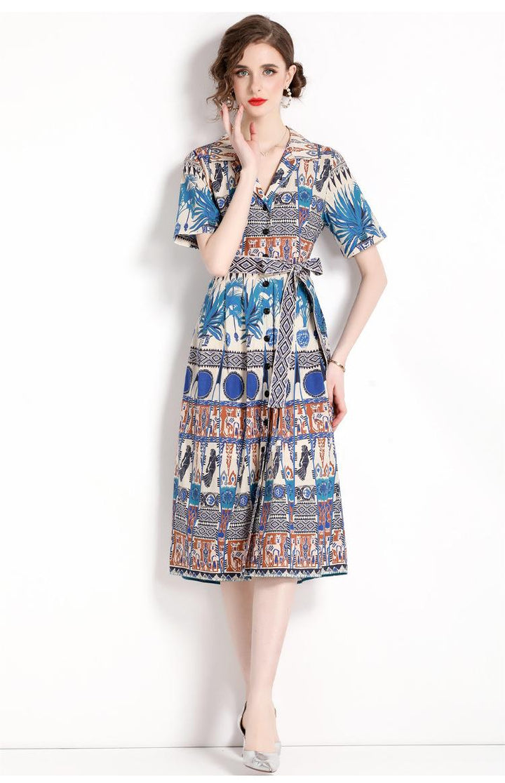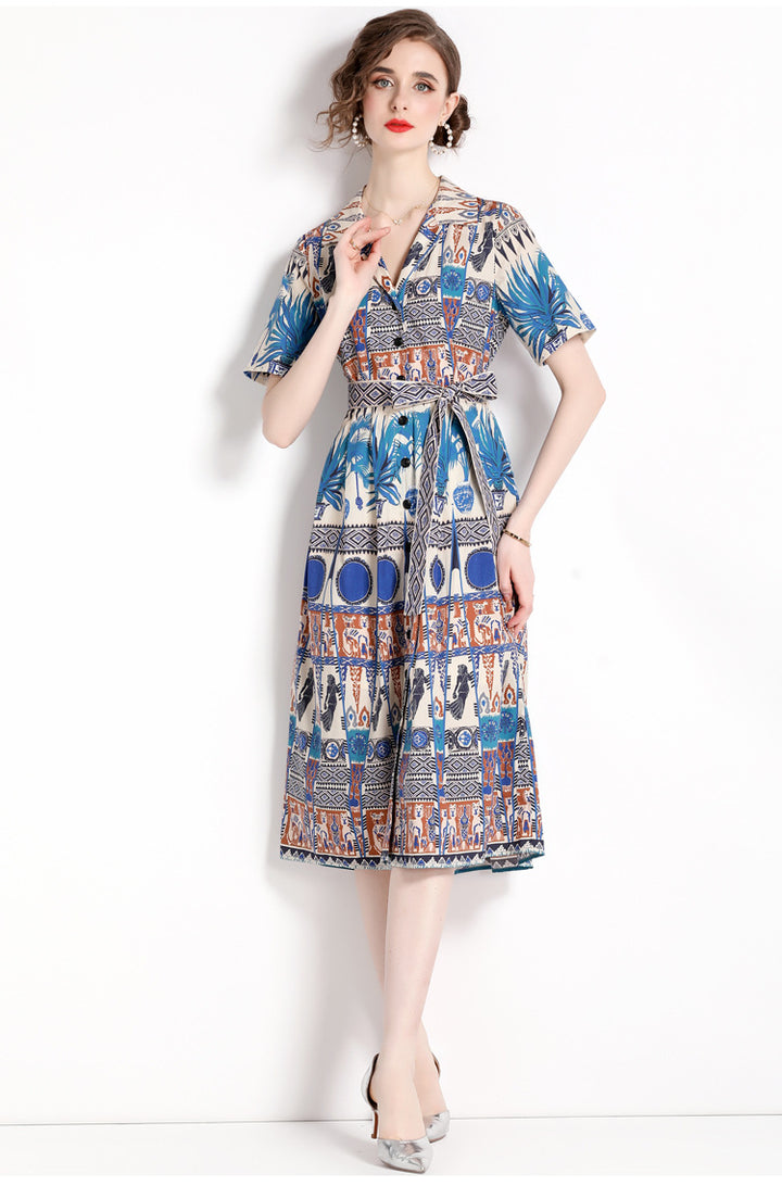 Vintage Printed Single Breasted Lace-Up Waist A-Line Skirt Short Sleeved Dress