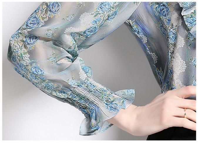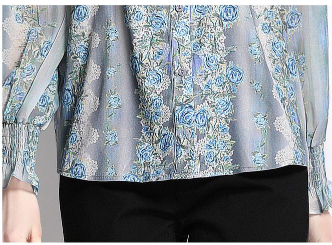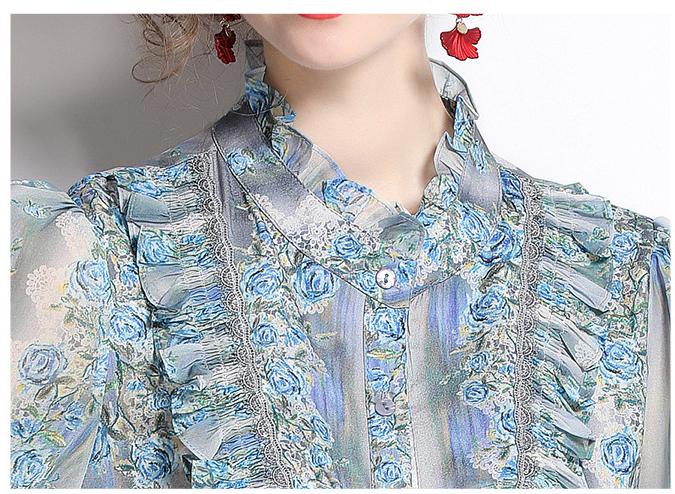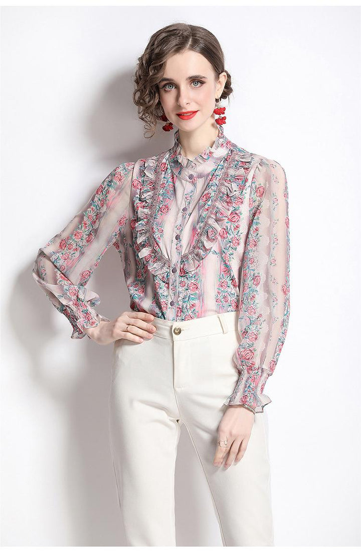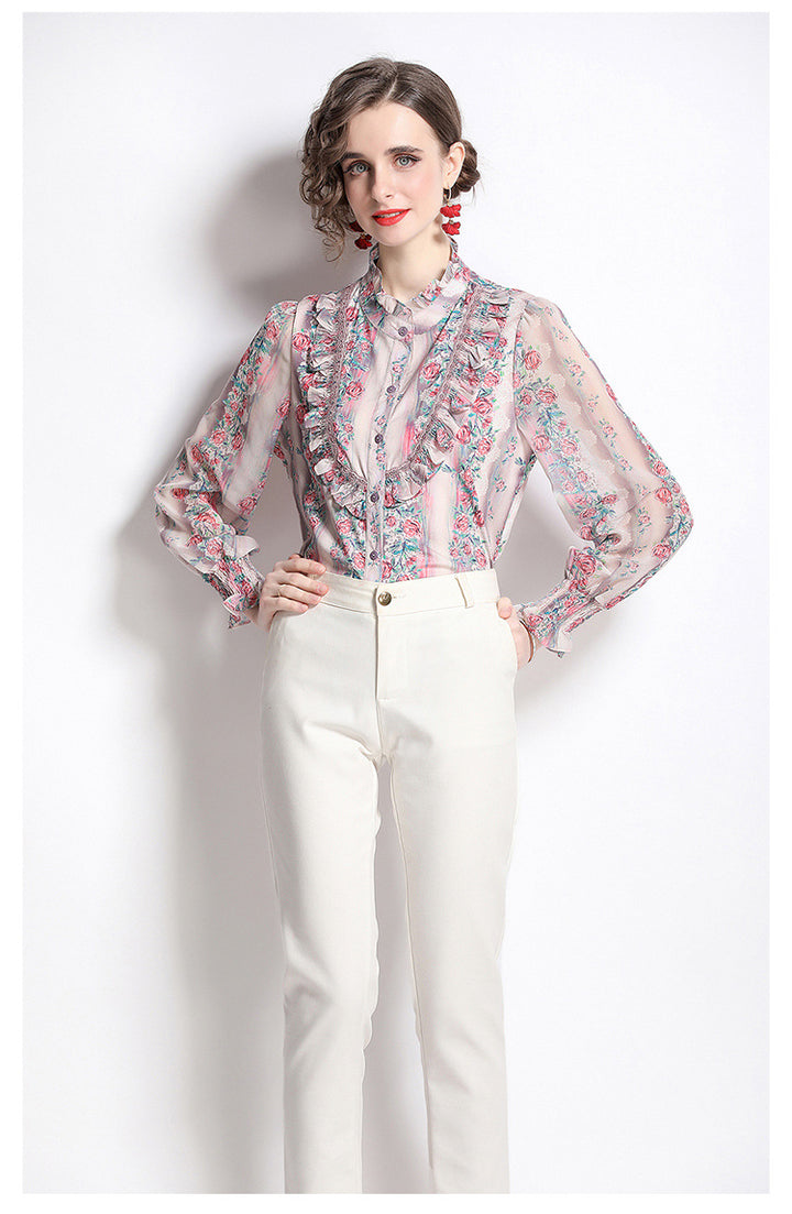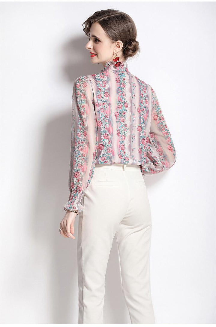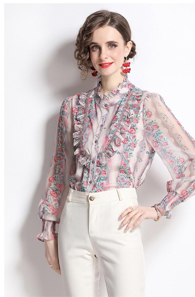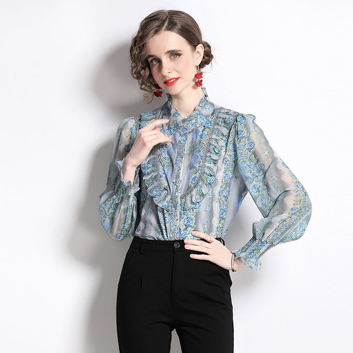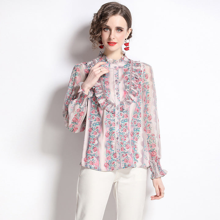 Vintage Printed Stand Collar Long Sleeve Top With Wooden Ear Edge