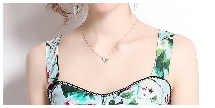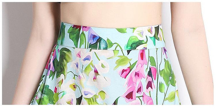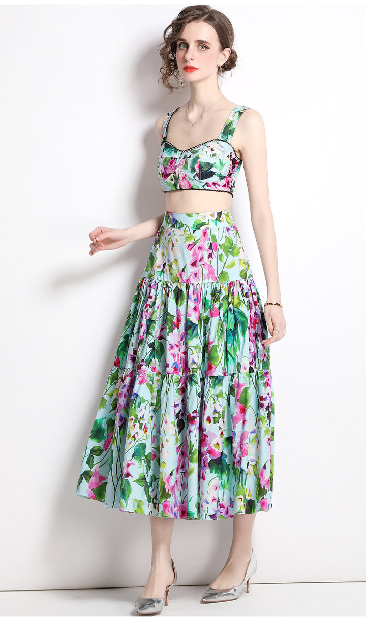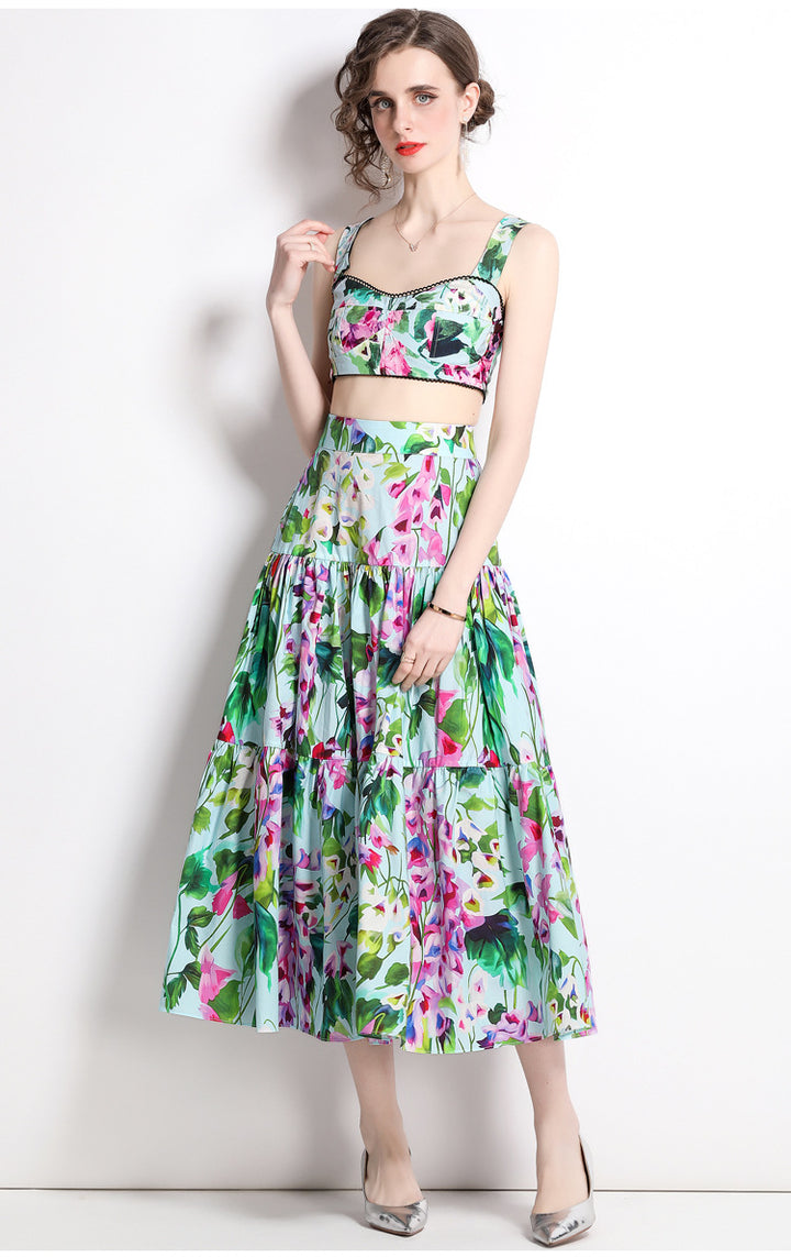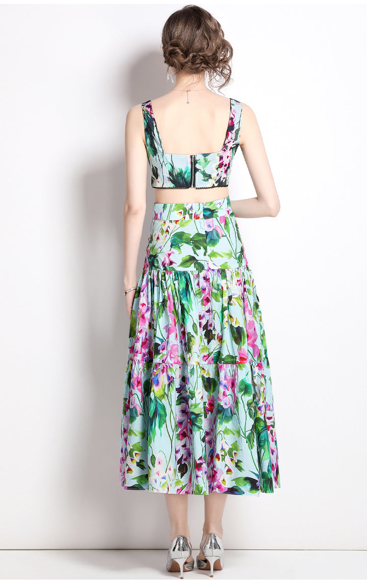 Vintage Sleeveless Short Style Chest Wrap Suspender and Printed High-Waisted Skirt Two-Piece Suit