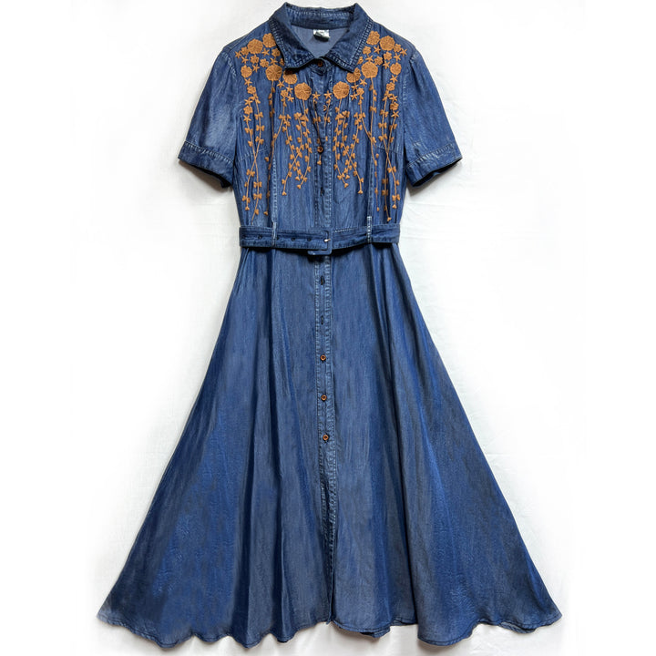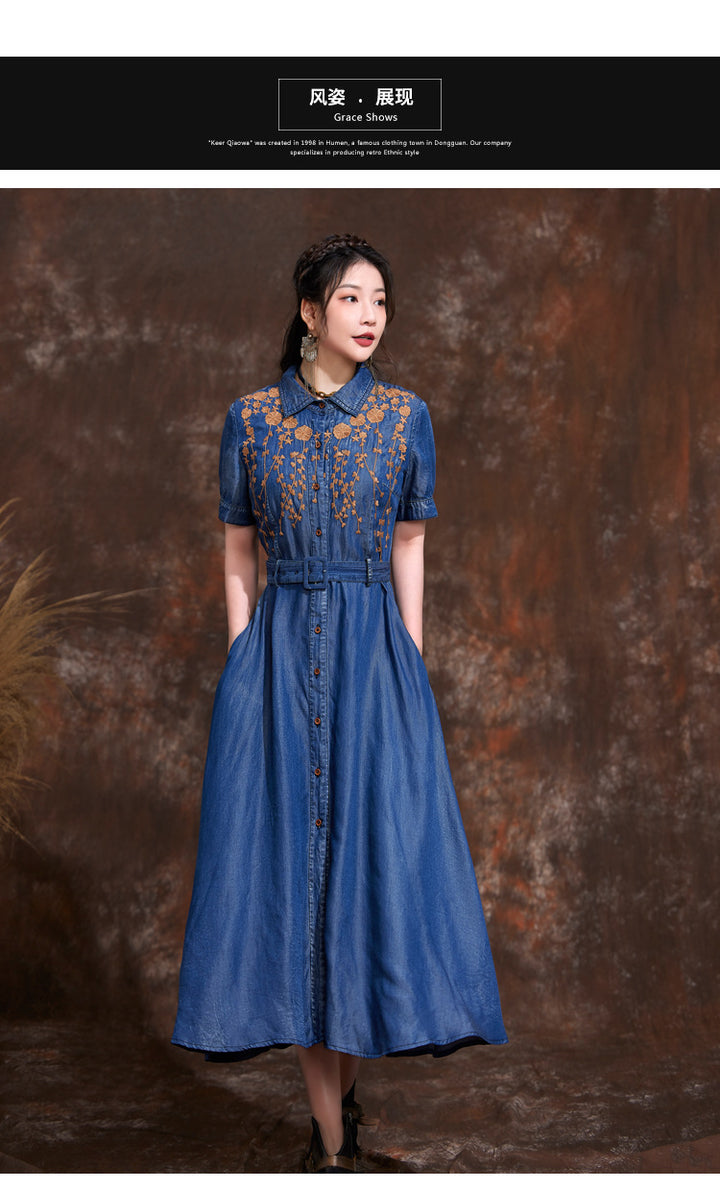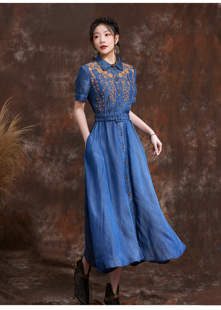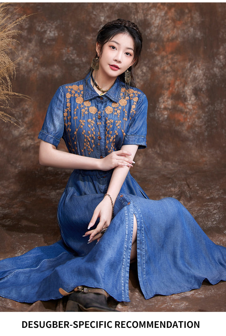 Waist Shrink Slimming Dress 2023 Spring and Summer New Vintage Embroidered Lapel Temperament Denim Long Skirt