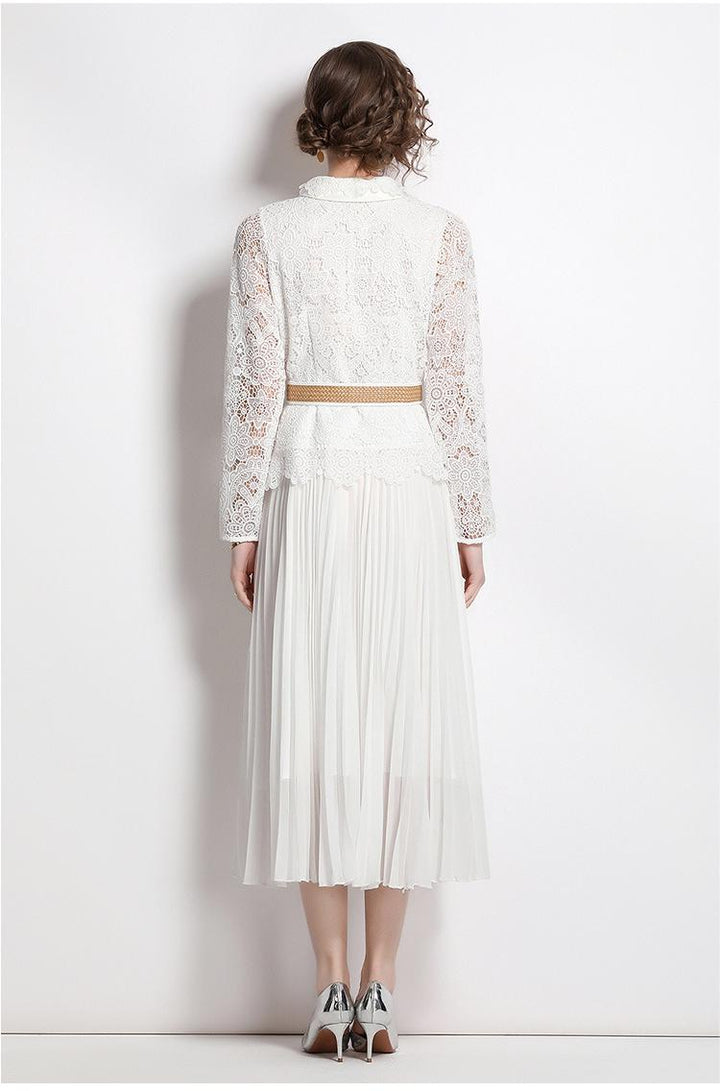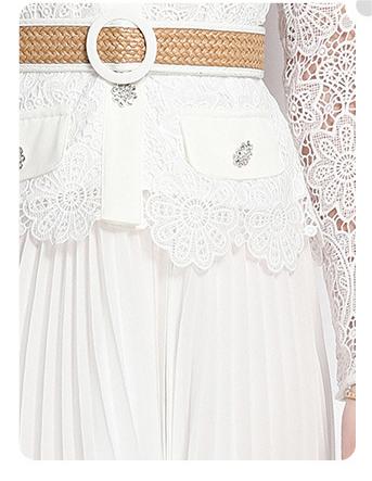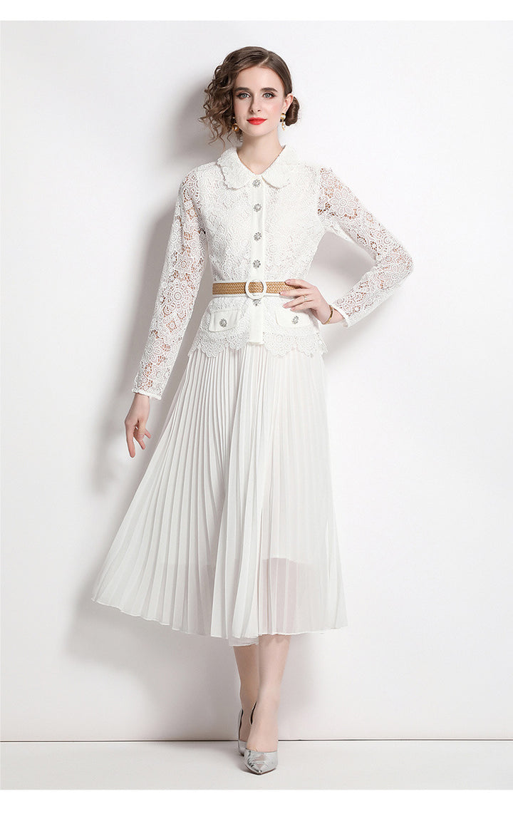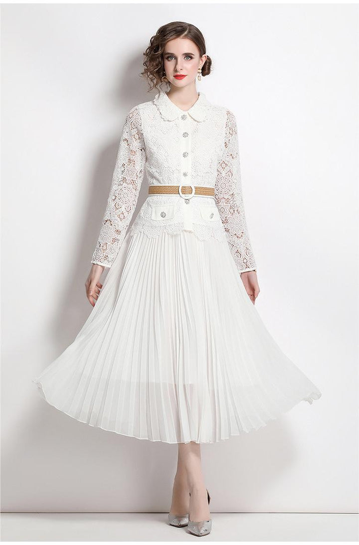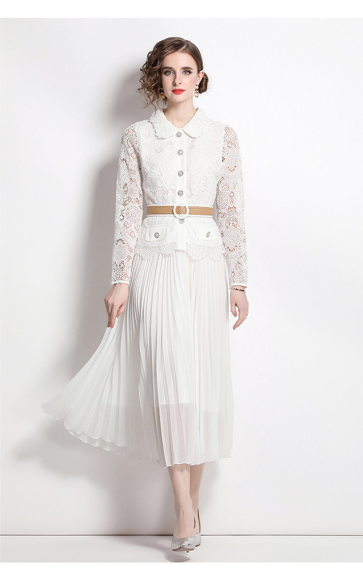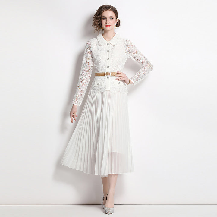 Water-Soluble Pleat Splicing Chiffon High-Waisted Lapel Long-Sleeved Fake Two-Piece Long Skirt Dress