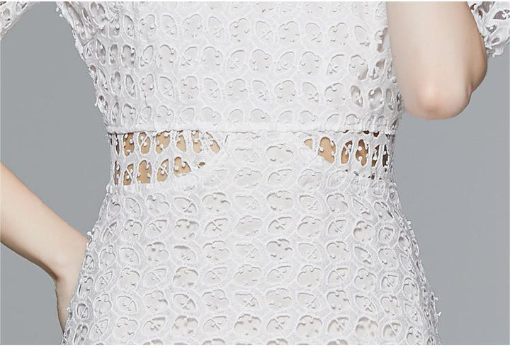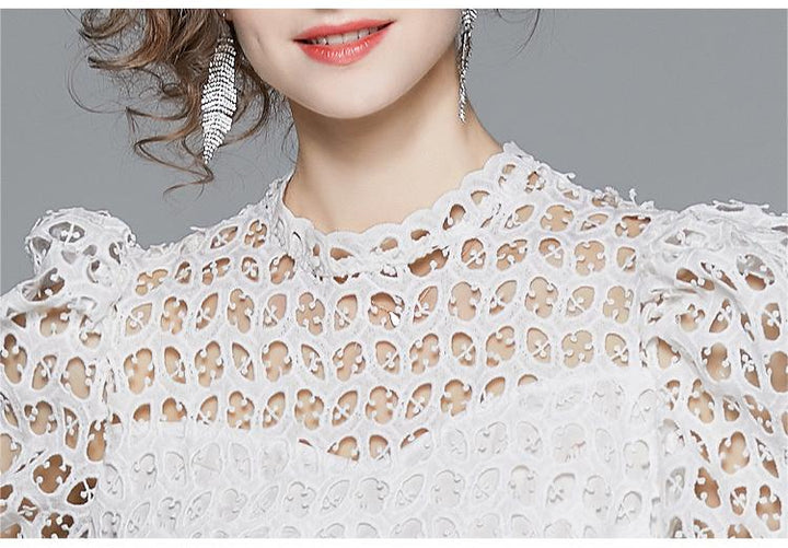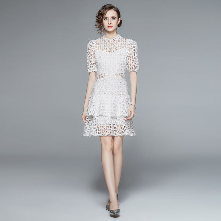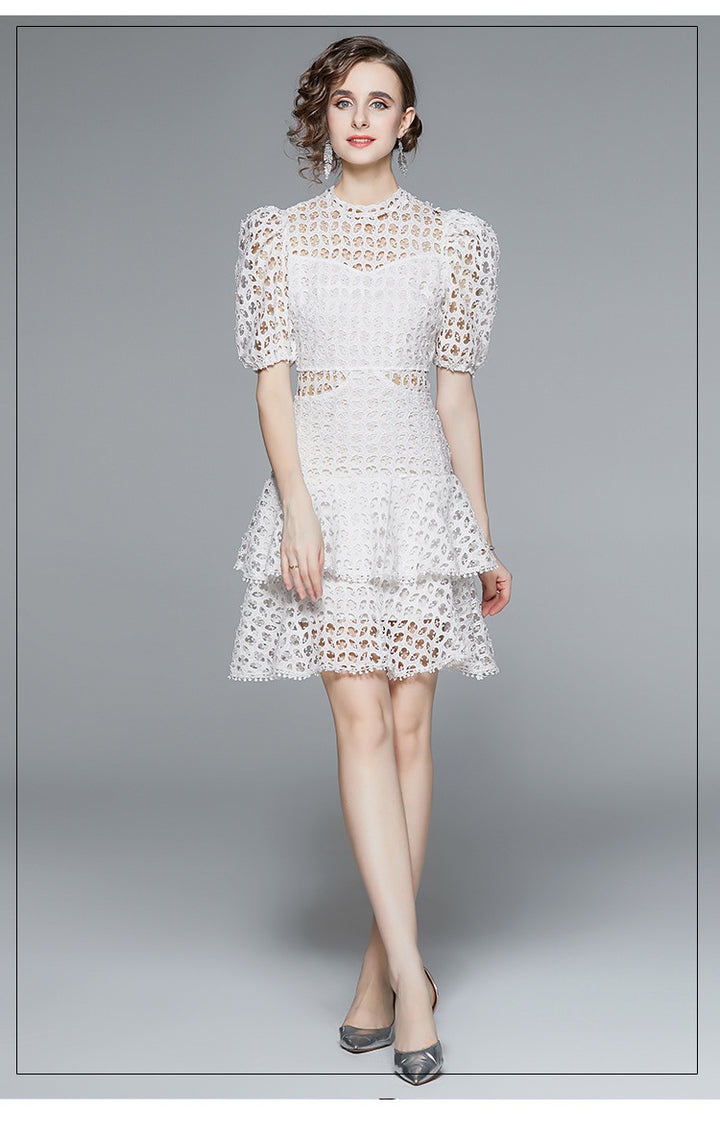 White Water-Soluble Lace Dress Summer Temperament Hollowed Out Small Fairy Bubble Sleeves High Waist Pommel Skirt