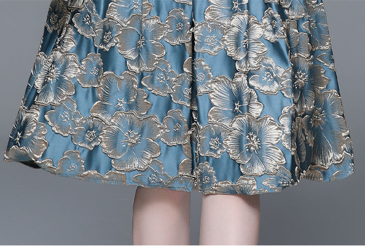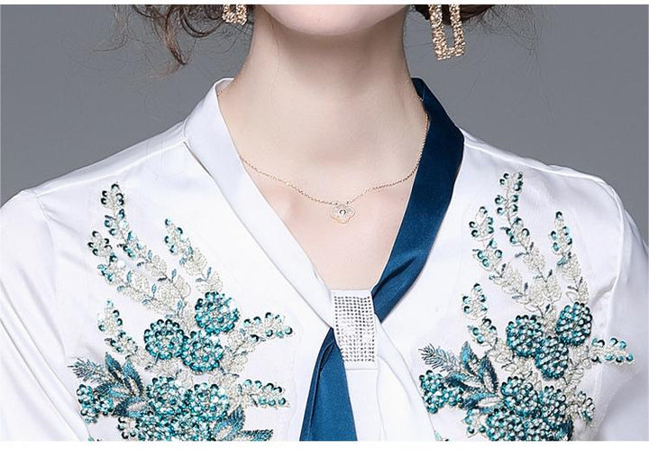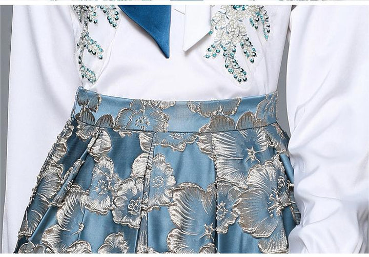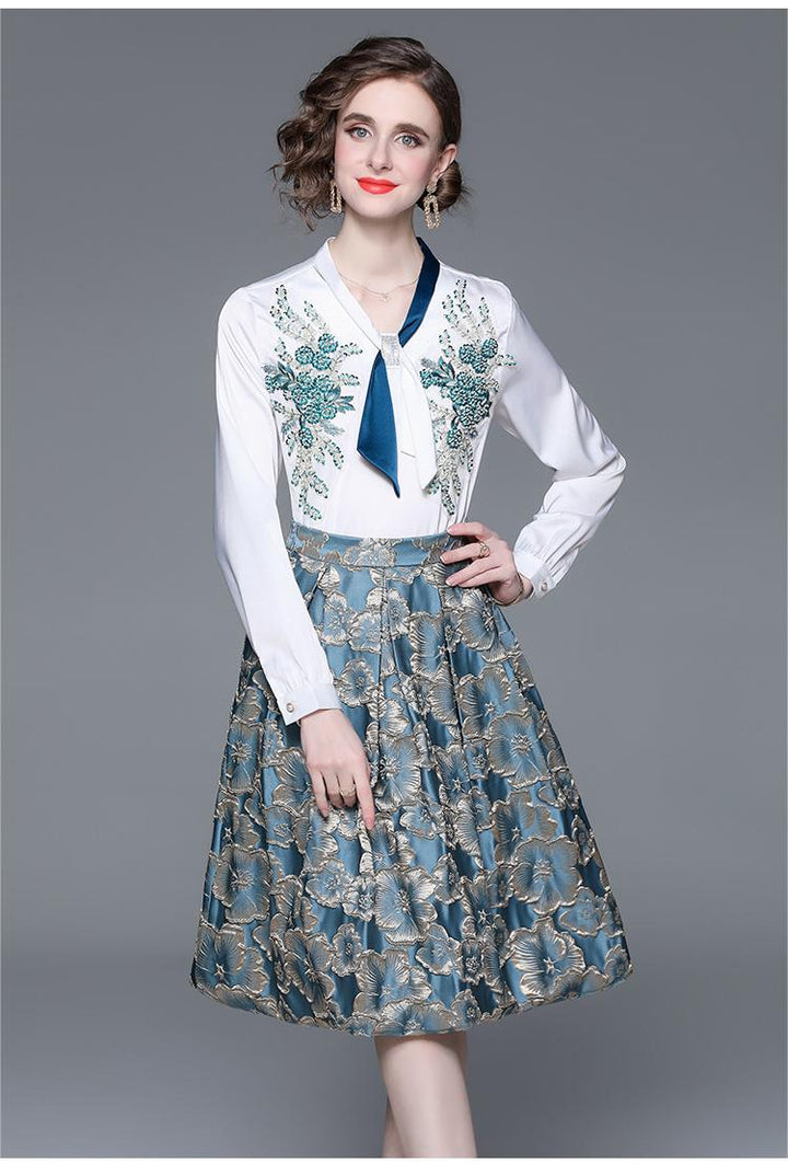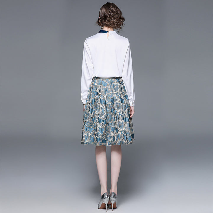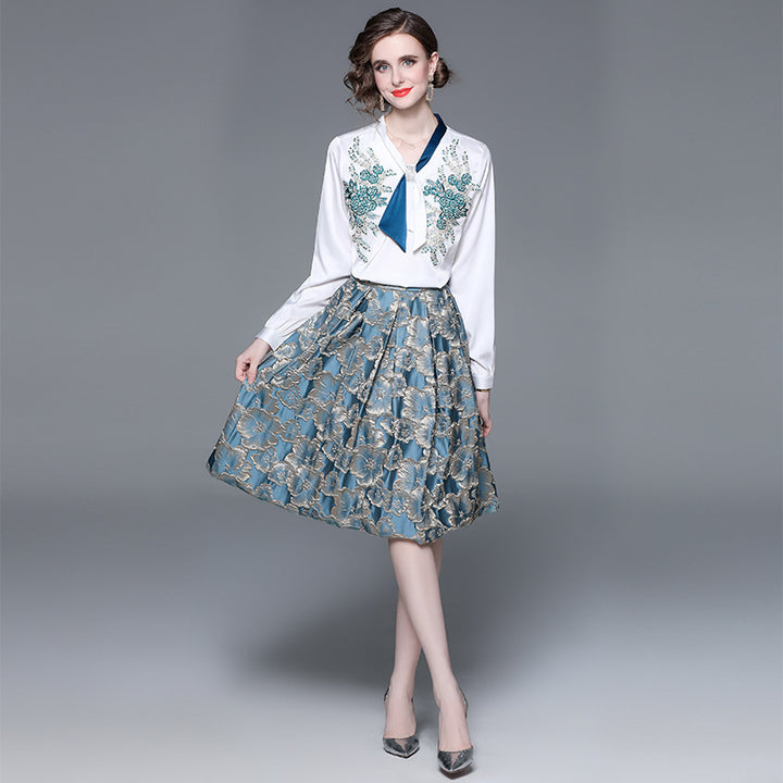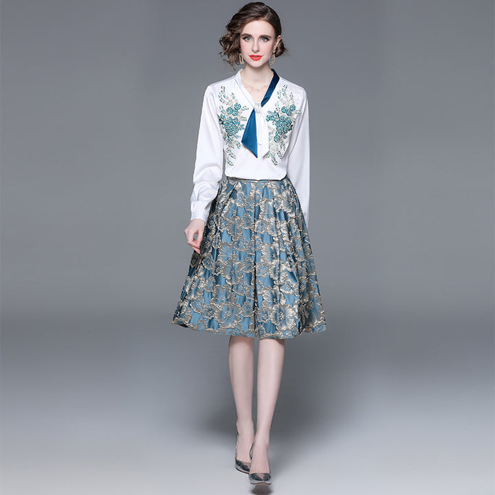 Women's Fashion Applique Embroidery Long-Sleeved Shirt and Mid-Length Skirt Two-Piece Set