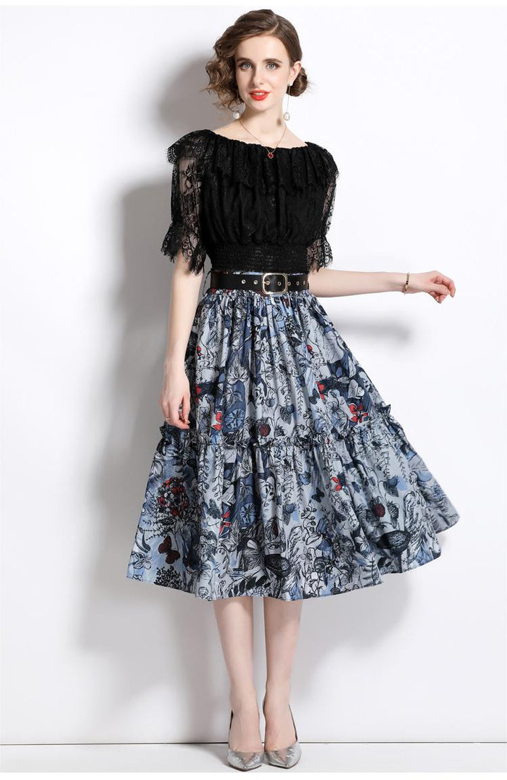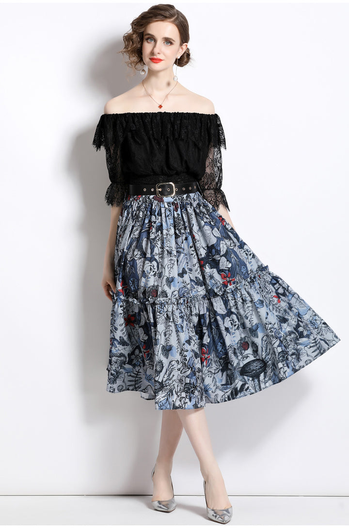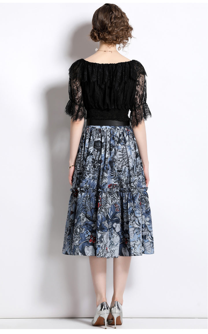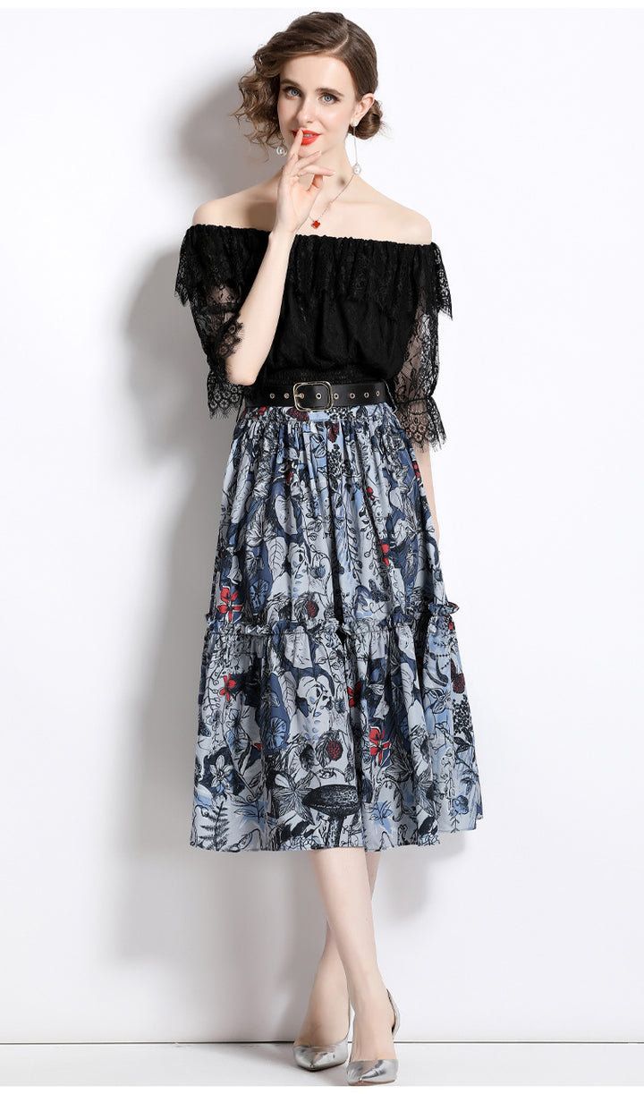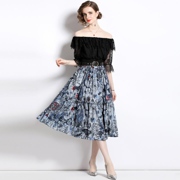 Women's One-Line Neck Lace Top and Vintage Printed Half Skirt Two-Piece Suit