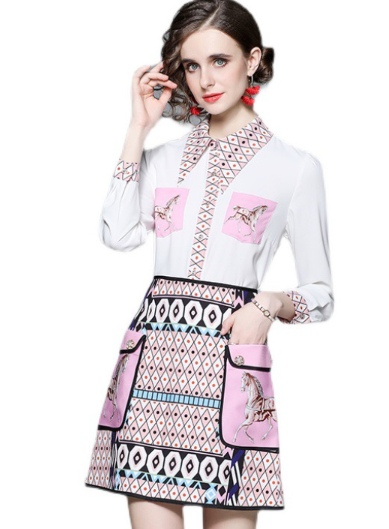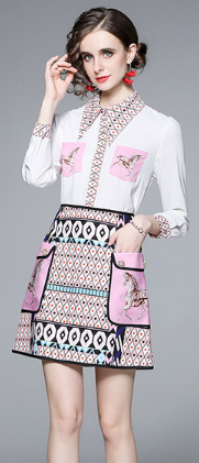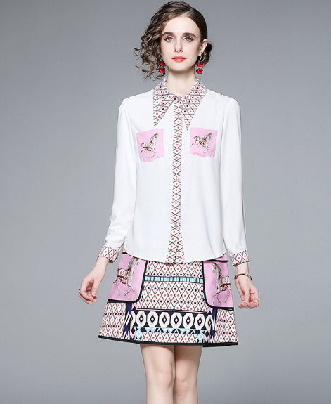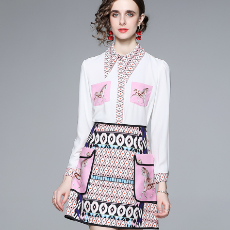 Women's printed long sleeved shirt and short skirt two-piece set